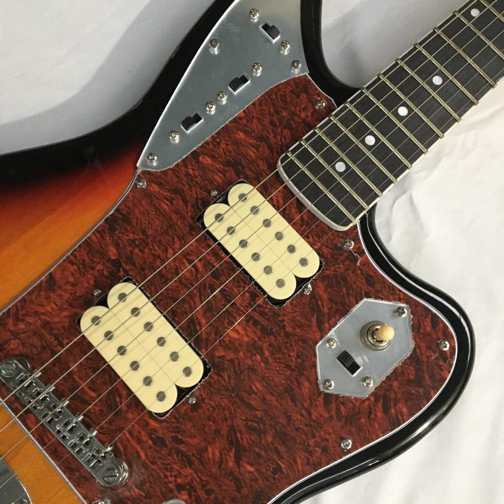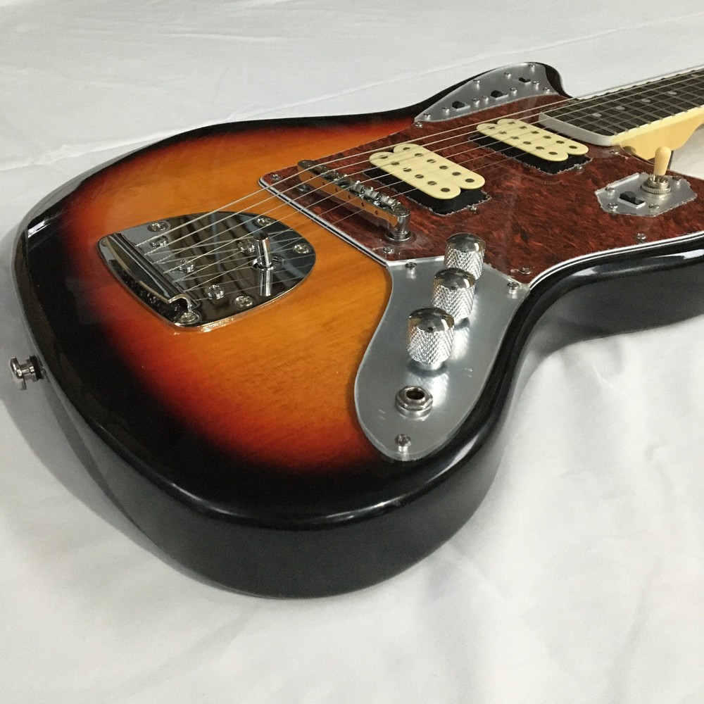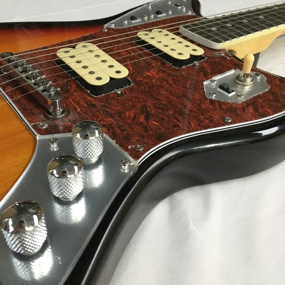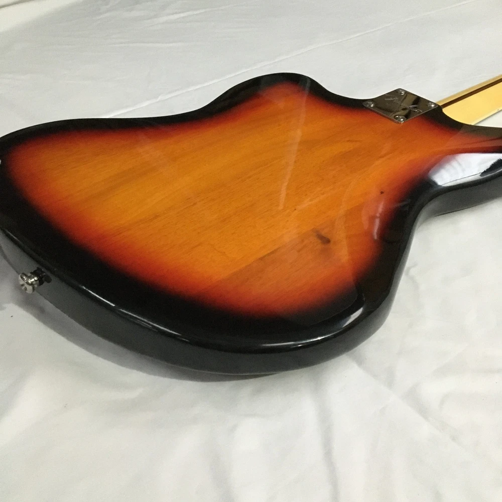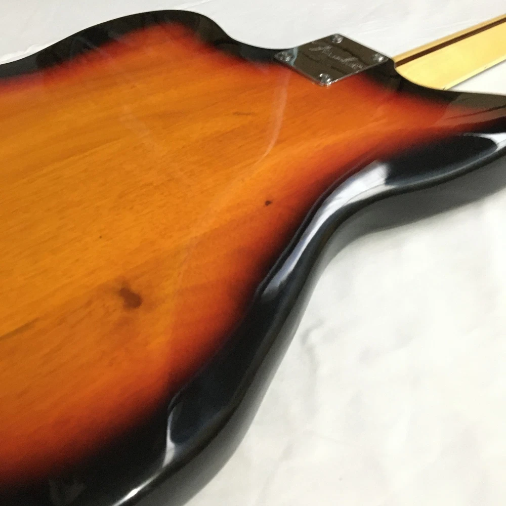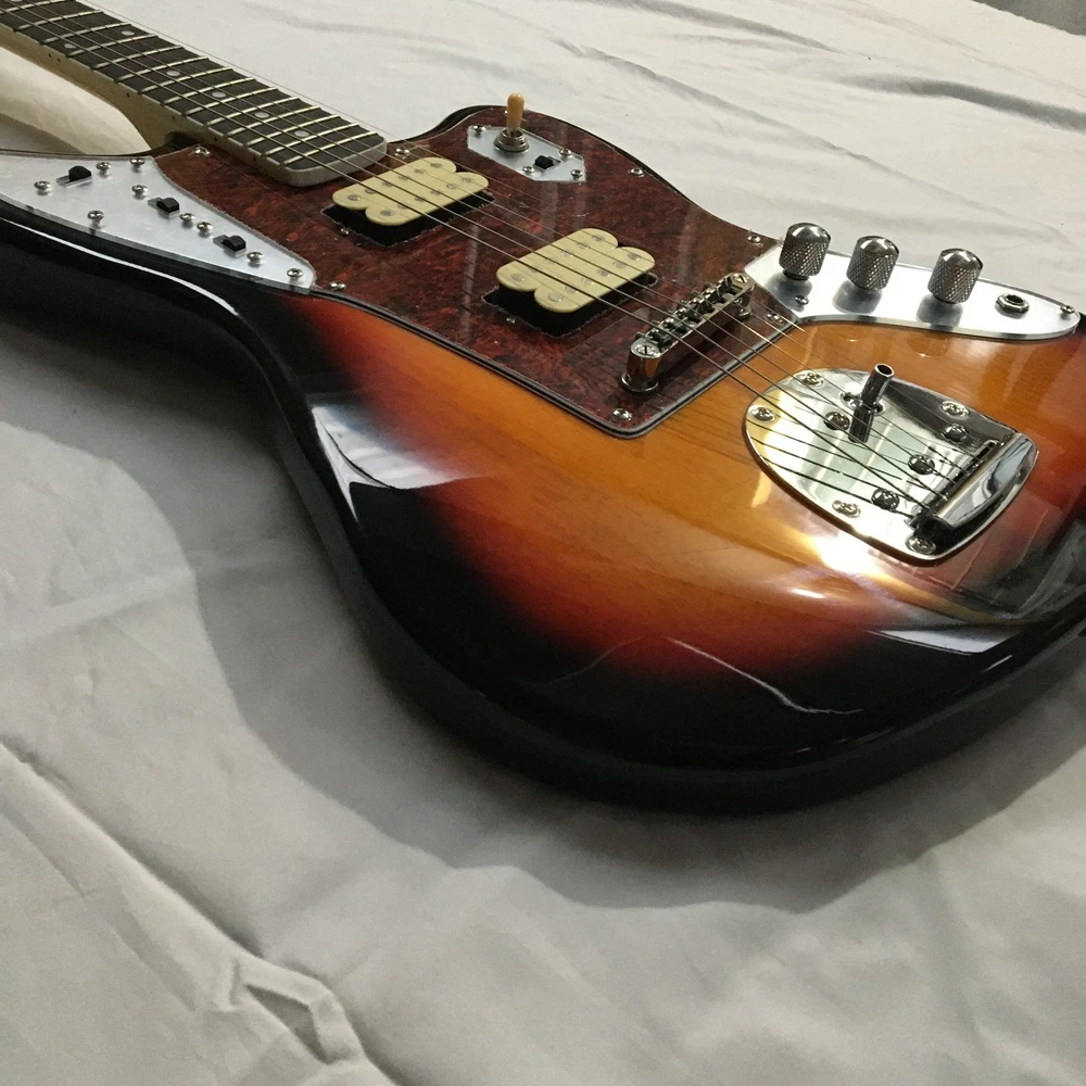 This is a Tobacco Jazzmaster Electric Guitar with a solid Mahogany body, Maple neck, and Rosewood fretboard. It has a 6-string configuration, 22 frets, and HH pickup configuration. The guitar features chrome hardware and includes a cable. It is a custom model from the Standard series, designed for professional-level performance in 2024. The unit is personalized with an OEM logo. Made in China, it complies with California Prop 65 regulations.