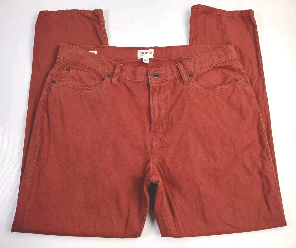 Fit: Slim Material: Cotton, Cotton Blend, Linen Theme: City, Logo, Preppy, Sports, Classic Country/Region of Manufacture: India Size: 34 Closure: Zip Garment Care: Machine Washable Department: Men Type: Pants Occasion: Casual, Formal, Travel, Workwear Pattern: Solid Model: todd snyder 5 pocket chino Waist Size: 34 in Pocket Type: 5-Pocket Design Size Type: Regular Features: Comfort, Easy Care, Pockets, Slimming Personalize: No Season: Winter, Summer, Spring, Fall Handmade: No Style: Chino Leg Style: Straight Vintage: No Color: Red Front Type: Flat Front Rise: Mid (10-12 in) Brand: Todd Snyder Inseam: 29 in