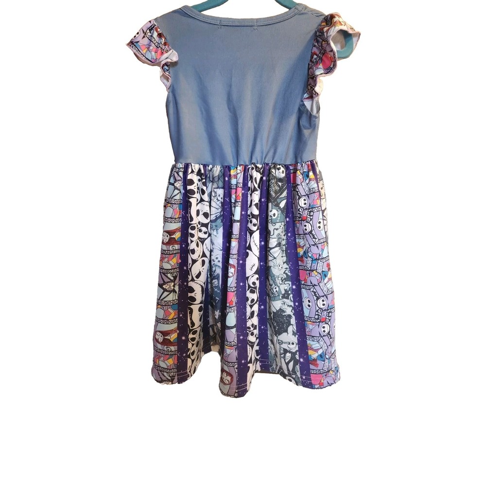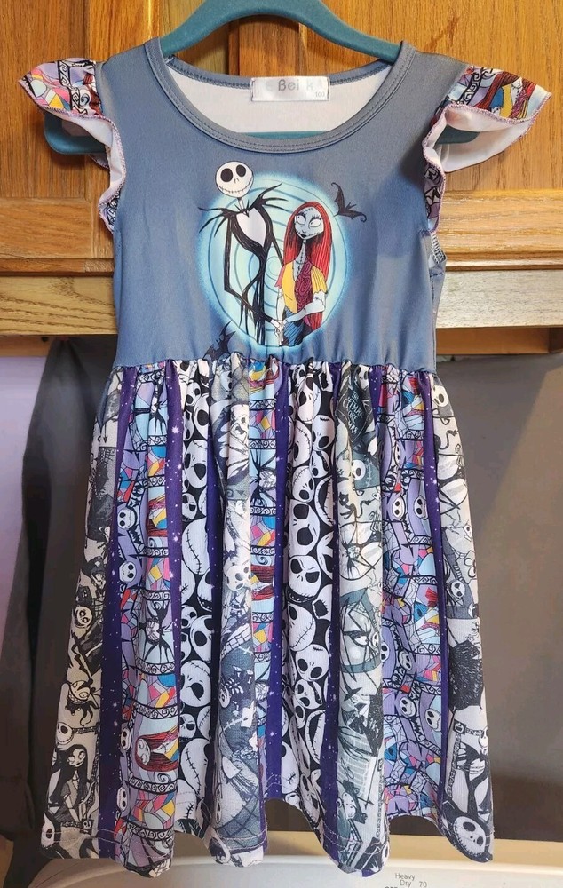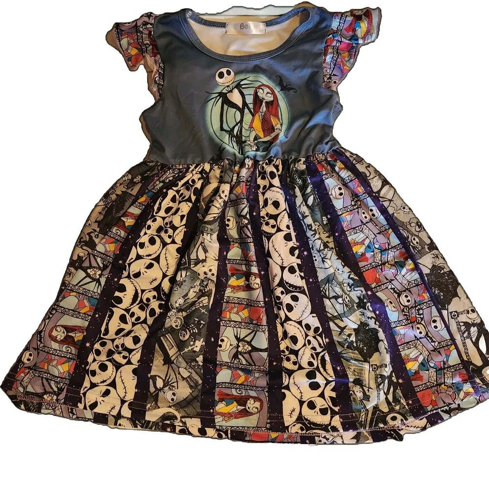 The dress features a round neckline and pullover closure, with a knee-length hemline and multicolor print. Made from 100% polyester, it is both comfortable and durable. The dress is designed with the popular Nightmare Before Christmas theme, making it a must-have for any young fan. It is available in size 3T-4T and is suitable for both summer and spring seasons. The dress is manufactured in China.