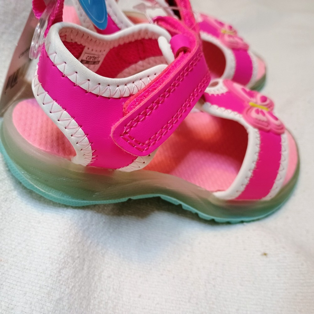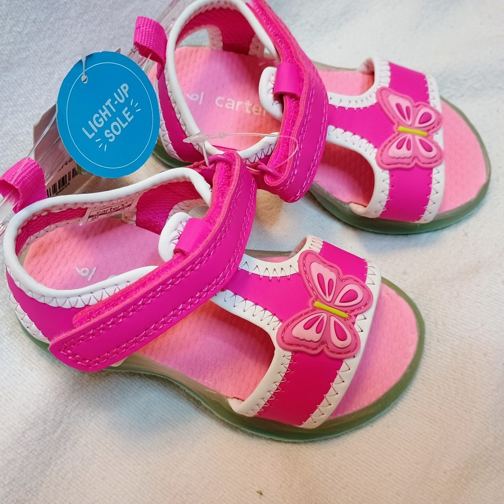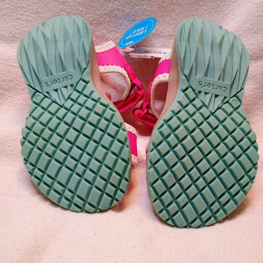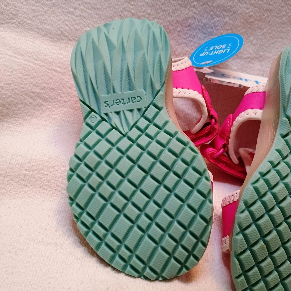 Carter's toddler girl summer sandal size 6 Light Up Soles New With Tags. Style: Feline Color: Fuchsia good tread on sole Looks to be easy cleanup with water.