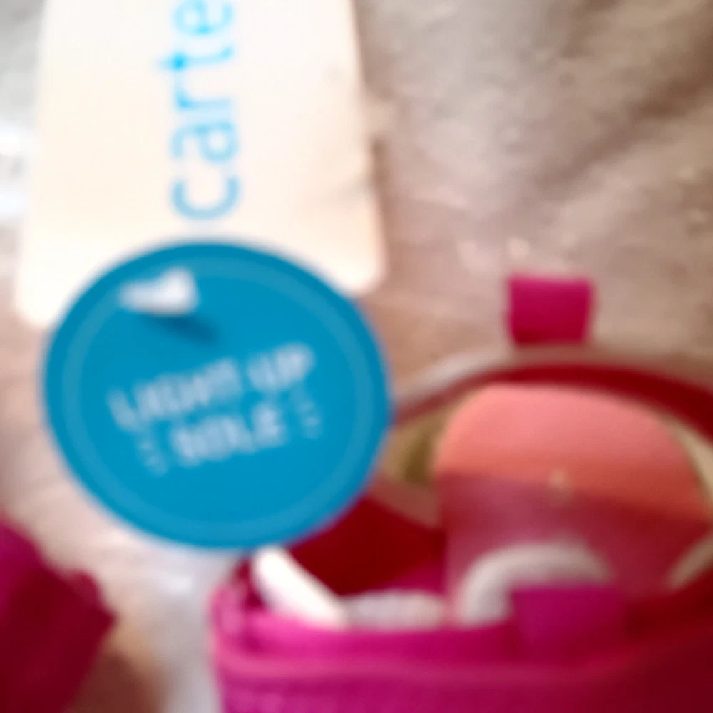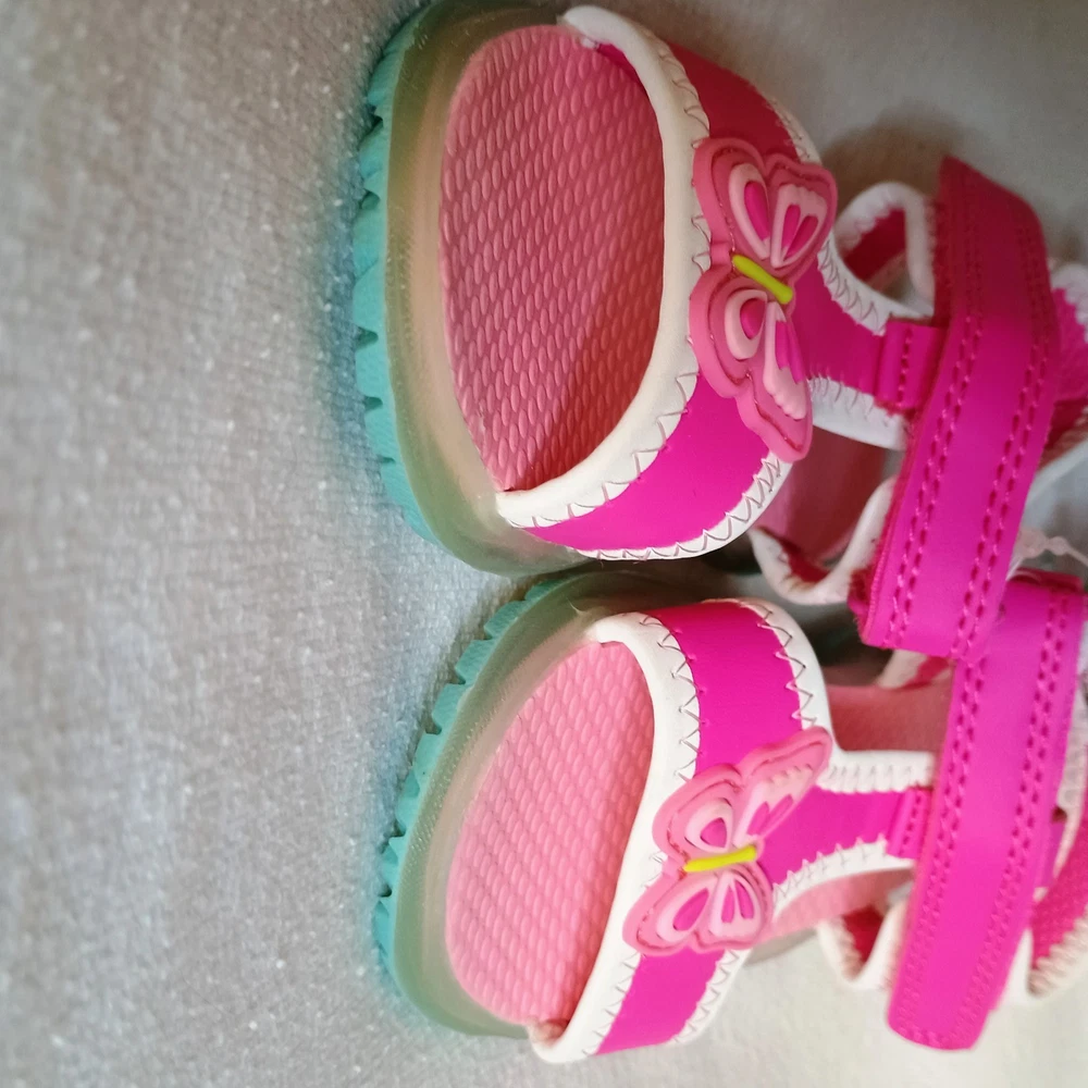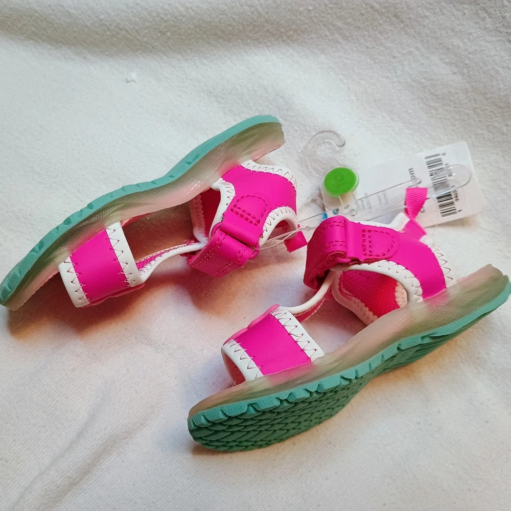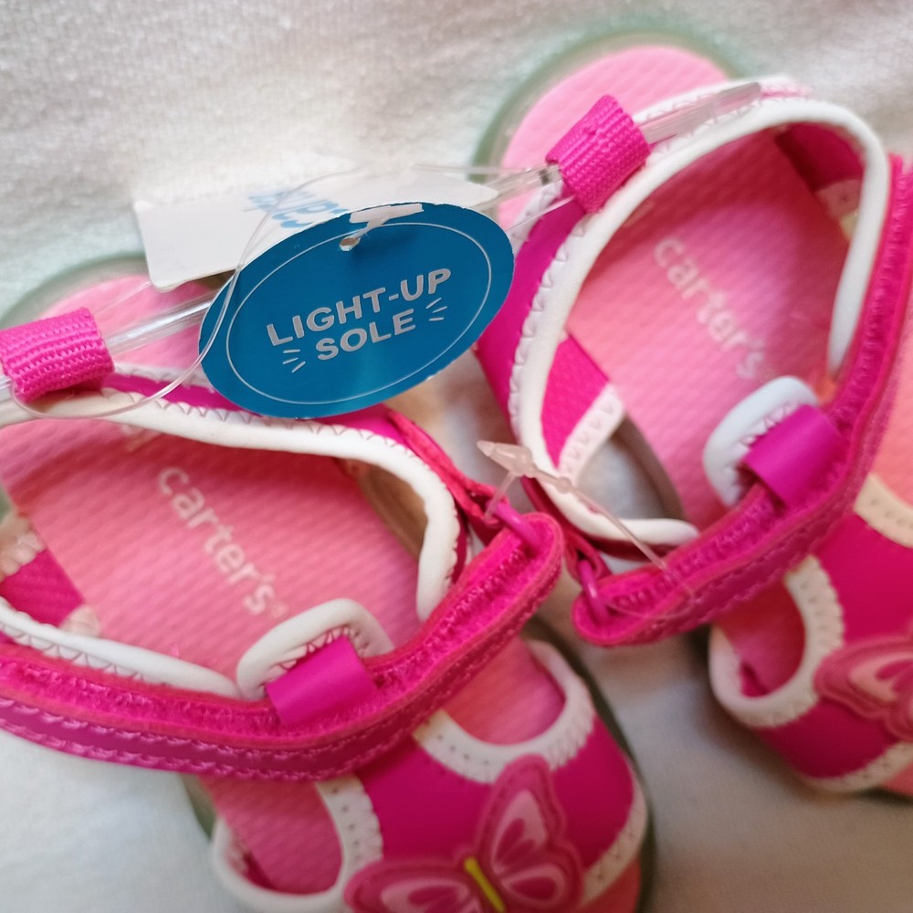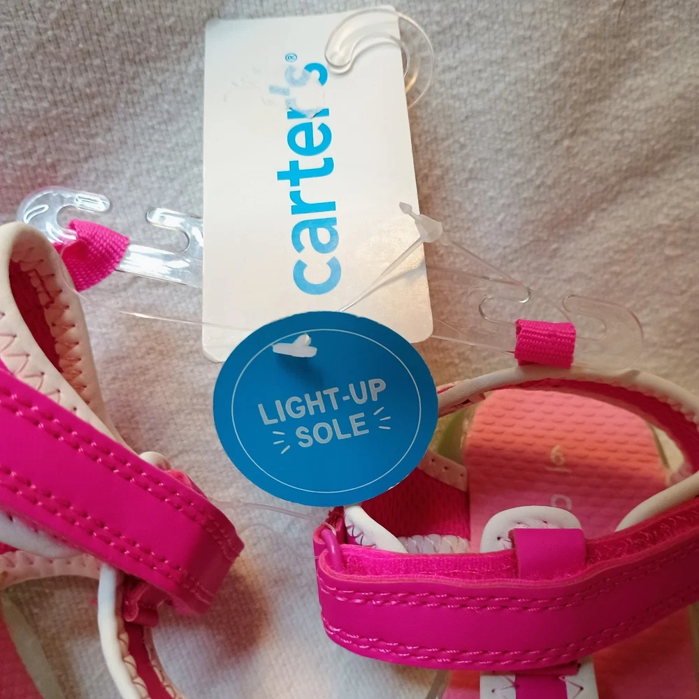 Carter's toddler girl summer sandal size 6 Light Up Soles New With Tags. Style: Feline Color: Fuchsia good tread on sole Looks to be easy cleanup with water.