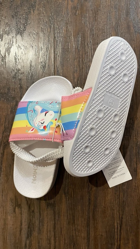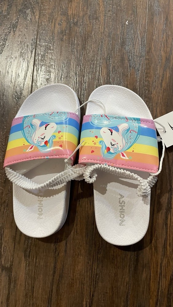 These toddler girl sandals in size 9 feature a cute unicorn design in white with straps for easy slip-on closure. Perfect for travel, parties, or casual outings, the sandals offer moderate cushioning with a rubber outsole for comfort. The synthetic upper material and lining make them durable and easy to clean, while the theme of unicorn and rainbow adds a fun and playful touch to your child's summer, fall, or spring wardrobe.