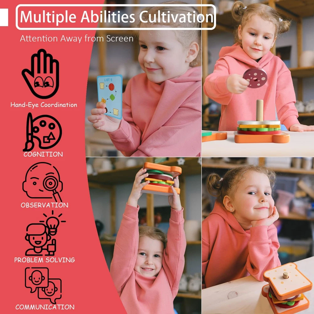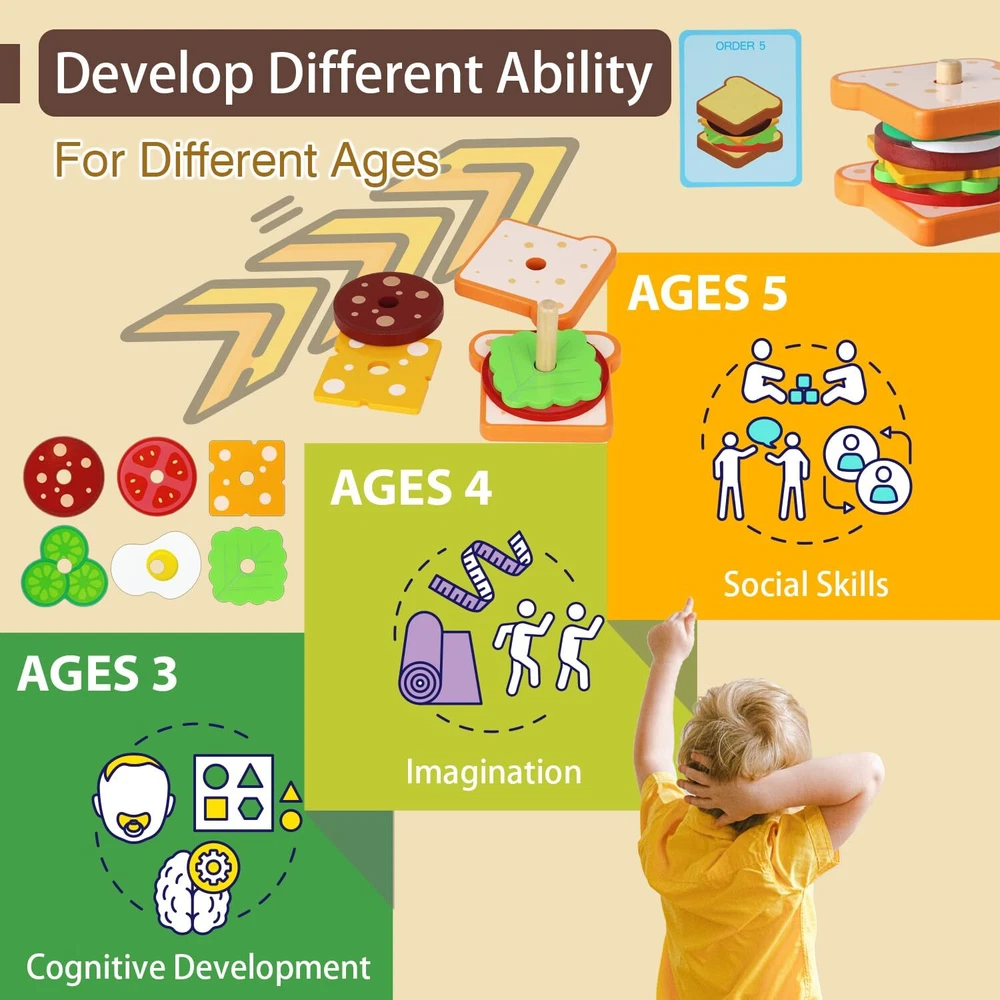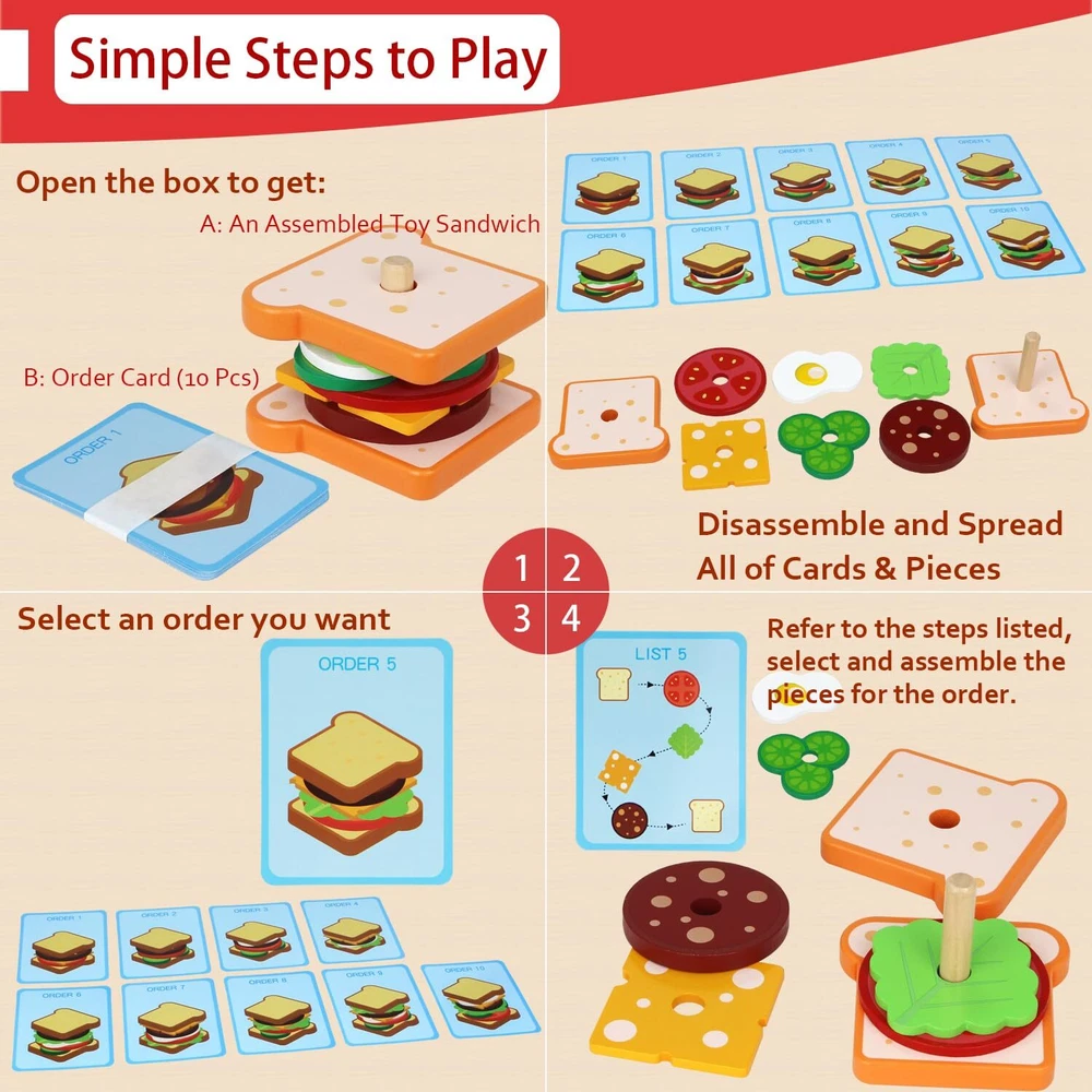 Toddler Montessori Toys for 3 4 5 Year Old Boy Girl, Pretend Play Toy Fake Food for Ages 3-5 Kids Gifts, Stacking Wooden Building Blocks Educational Puzzles Games for Preschool Classroom (Sandwich) Selecting and stacking different fake ingredients on the bread base to combine them into the food you want. This building block set is easy to use and attract children's attention, stimulate exploration and curiosity, which is helpful for developing toddlers' observation, imagination, concentration and establishing a preliminary concept of food preparation. This Montessori toy has a wealth of ways to play. It contains 8 building blocks representing different ingredients and 10 order cards representing 10 methods. In addition to the styles on the cards, you can also freely combine them to create more different combinations. Kids can play alone to train their fine motor and hand-eye coordination, or play with parents, elders, and other boys & girls to develop social skills, communication skills, and enhance relationships. Wooden toy bricks for boys and girls aged 3+, each meal contains 2 main pieces and 6 optional side dishes, made of high-quality wood coated with environmental friendly, non-toxic water-based paint, with burr-free polished smooth edges and corners that will not harm baby’s soft skin, ensuring children's safety. They are easy to store & carry and becoming a good playmate for kids in the car safety seat. This puzzle toy is beautifully designed, realistic, and durable. Not only an ideal gift for kids on birthdays, Christmas, Christmas, parties, Children's Day, Halloween, Thanksgiving and New Year, but also an ideal playmate for indoor and outdoor games, home, kindergarten, amusement park, preschool learning activities, etc. They will enjoy simulating social life scenes in the pretend house game. Accompanying children's growth is our original intention, and customer satisfaction is our motivation. If there are missing parts, damaged parts, not working, or any other problems, please feel free to contact us on Amazon, we will try our best to provide you with a satisfactory solution, and also welcome suggestions for our product design. Selecting and stacking different fake ingredients on the bread base to combine them into the food you want. This building block set is easy to use and attract children's attention, stimulate exploration and curiosity, which is helpful for developing toddlers' observation, imagination, concentration and establishing a preliminary concept of food preparation. This Montessori toy has a wealth of ways to play. It contains 8 building blocks representing different ingredients and 10 order cards representing 10 methods. In addition to the styles on the cards, you can also freely combine them to create more different combinations. Kids can play alone to train their fine motor and hand-eye coordination, or play with parents, elders, and other boys & girls to develop social skills, communication skills, and enhance relationships. Wooden toy bricks for boys and girls aged 3+, each meal contains 2 main pieces and 6 optional side dishes, made of high-quality wood coated with environmental friendly, non-toxic water-based paint, with burr-free polished smooth edges and corners that will not harm baby’s soft skin, ensuring children's safety. They are easy to store & carry and becoming a good playmate for kids in the car safety seat. This puzzle toy is beautifully designed, realistic, and durable. Not only an ideal gift for kids on birthdays, Christmas, Christmas, parties, Children's Day, Halloween, Thanksgiving and New Year, but also an ideal playmate for indoor and outdoor games, home, kindergarten, amusement park, preschool learning activities, etc. They will enjoy simulating social life scenes in the pretend house game. Accompanying children's growth is our original intention, and customer satisfaction is our motivation. If there are missing parts, damaged parts, not working, or any other problems, please feel free to contact us on Amazon, we will try our best to provide you with a satisfactory solution, and also welcome suggestions for our product design. Shipping from the USA All of our products are shipped from the USA, ensuring quick delivery to your destination. Payment We offer the following payment methods: PayPal, credit card, bank transfer, and eBay's secure payment system. Free Shipping & Free Returns Shipping within the USA is FREE. Additionally, any return is absolutely free for you. Risk-Free Purchase You have the option to return an item within 30 days without any justification. We cover the return shipping costs! Fast Shipping We ship immediately upon receipt of payment. Generally, the package is delivered within 2-3 days in the USA. If it takes longer, we will contact you. Quality and Costs Made in Europe, USA, China No customs fees or additional charges Total satisfaction guarantee Invoice with declared VAT available upon request in .pdf format Feedback Your feedback is very important to us. After you pay for your purchase, you will automatically receive positive feedback from us.
