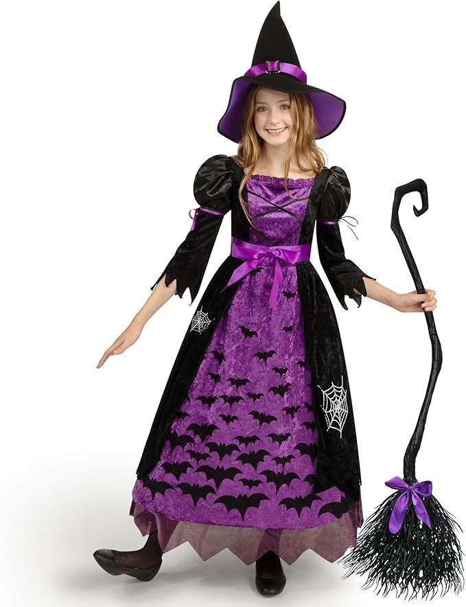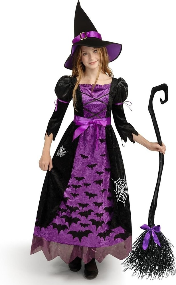 About this item Purple Witch Costume for Girls Deluxe Set. Includes Witch’s Matching Hat, a Long-Sleeved Dress, a Belt and a Broom. Girls Fairy Tale Witch Costume. Super durable and made with care. 100% Polyester. Super Value for Role Play. Great for Halloween Dress Up Parties, Fairytale Witch Themed Parties, Children's Witch Costume, Cute Witch, Witch Costumes for Girls, Fairytale Costumes for Girls, Good Witch Costume for Girls, Halloween Costume Dress Up, Fairytale Witch Role Playing, Activity, Everyday Play and More! Safety Test Approved. Easy to Wear, Unique Halloween Costume for Fairytale Witch Role Playing, Birthday Party, Costume Halloween Party. Instaworthy Halloween Costume Contest Idea! Add Lots of Fun to Your Halloween Party and Other Theme Activities! Size: Toddler (3– 4yrs), Small (5–7yrs), Medium (8-10yrs)