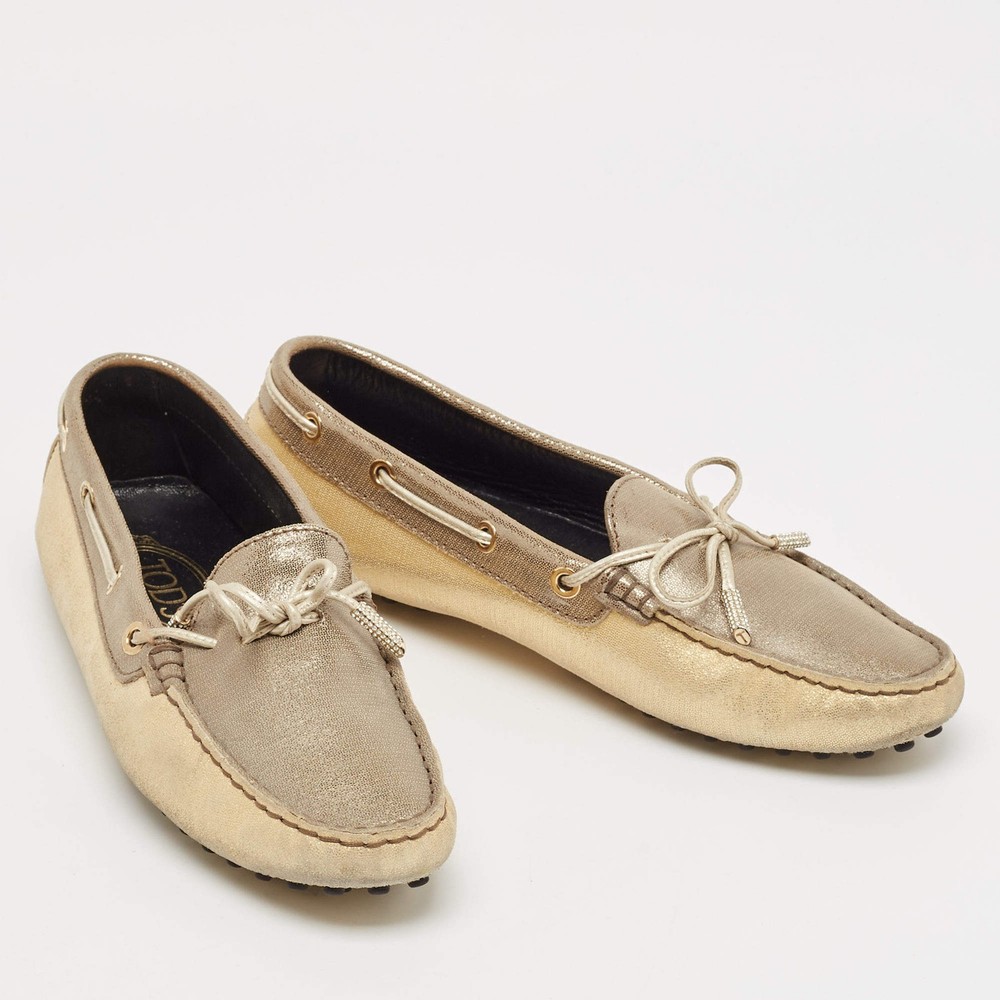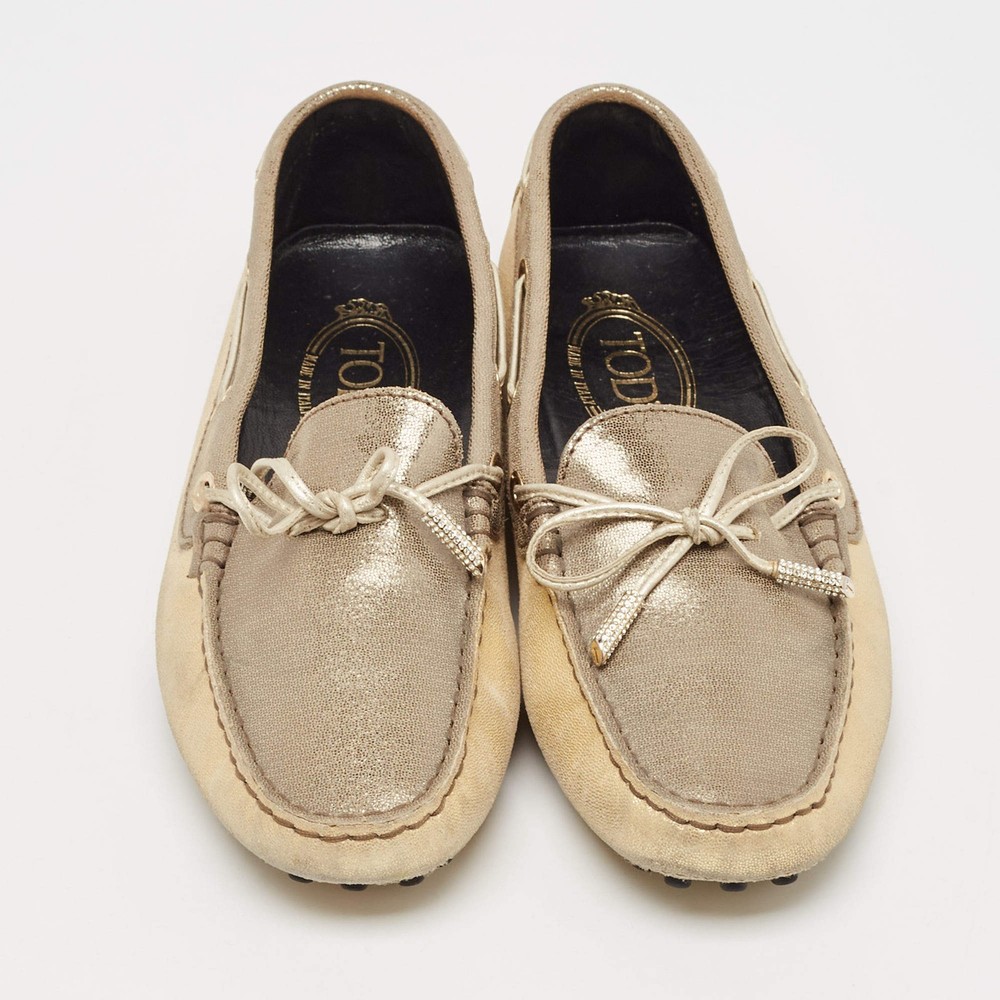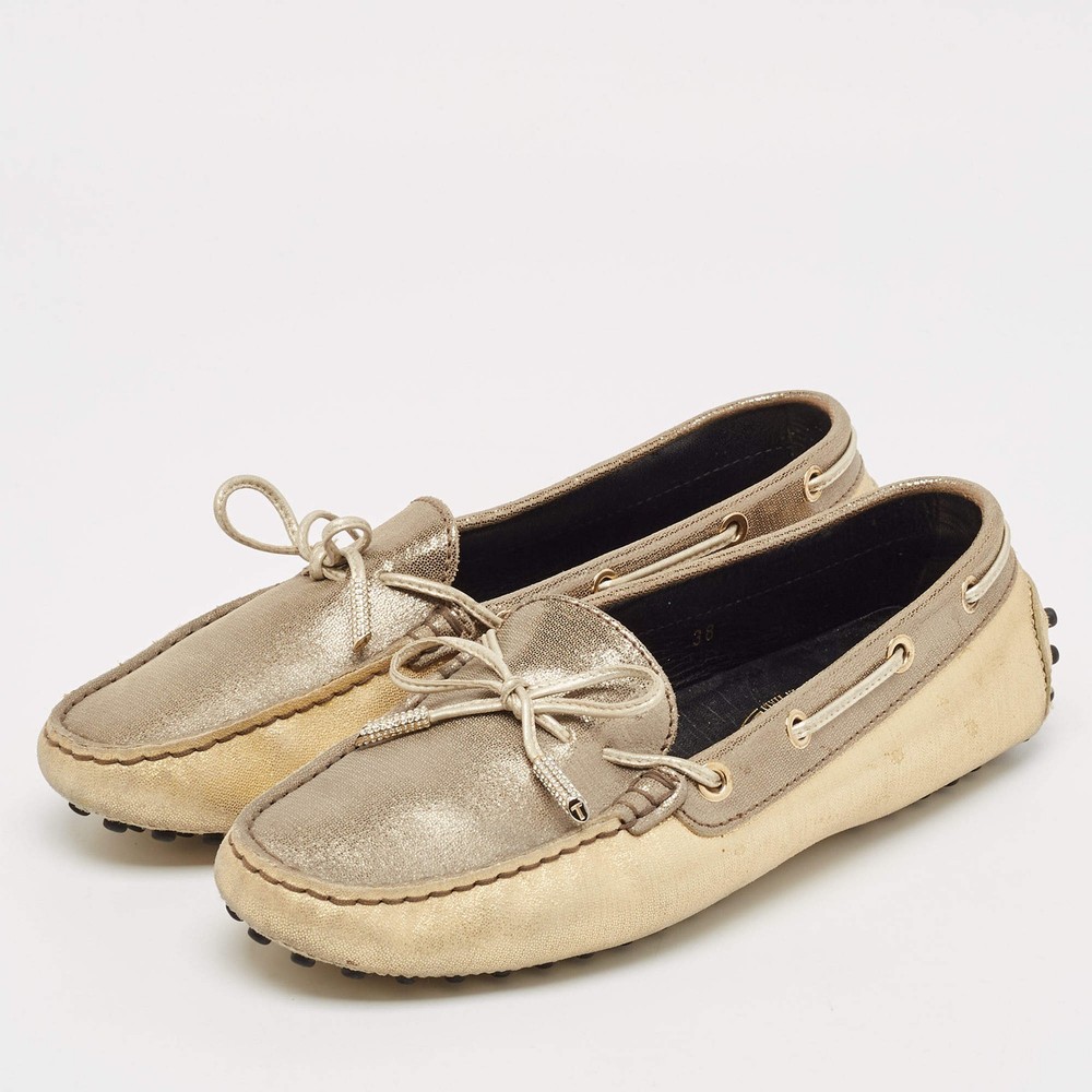 Our eBay Store About Us Contact Us Add to Favorite Sellers Tods GreyGold Textured Suede Bow Slip On Loafers Size 38 Crafted from textured suede in grey and gold, these Tod’s loafers are adorned with a charming bow detail. A sophisticated and versatile slip-on option that pairs well with both casuals. Product Details Brand Tod's Color Gold Includes The Luxury Closet Packaging Outsole Length 25 cm Outsole Width 8 cm Size 38 Certified by The Luxury Closet This item has gone through a detailed authentication process overseen by our experts. We offer a lifetime guarantee of authenticity on all our items. How We Check The in-house team of experts at The Luxury Closet is highly trained to verify the authenticity and the condition of the luxury products. They ensure that only 100% authentic items are put on sale.The evaluation process is unique with its own mix of assessment criteria and differs according to the category. Each item is evaluated based on the following combination of hallmarks, hardware, stitching, symmetry, material, craftsmanship, stamping, codes, hologram stickers, and packaging. Our authenticators also check if the items have been modified or amended (e.g., aftermarket diamonds, replaced batteries, repaired bags, etc.) International Buyers Import duties, taxes and charges are not included in the item price. These charges are the buyers responsibility. Please check with your country’s customs office to determine what these additional cost will be prior to buying.