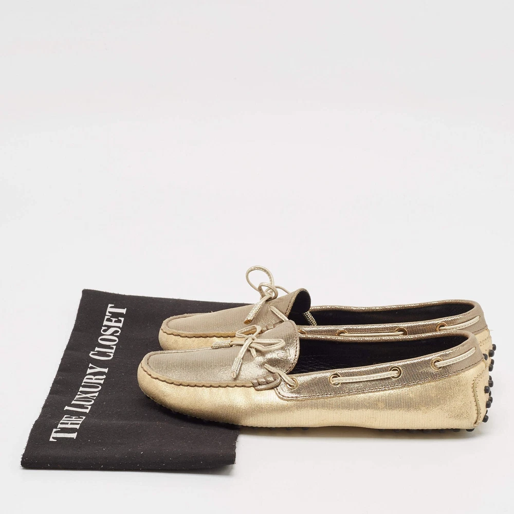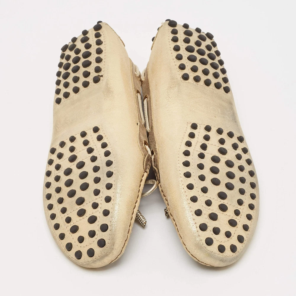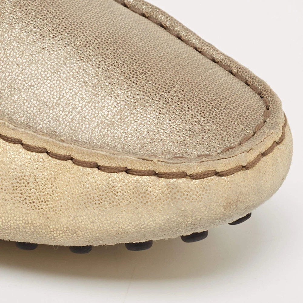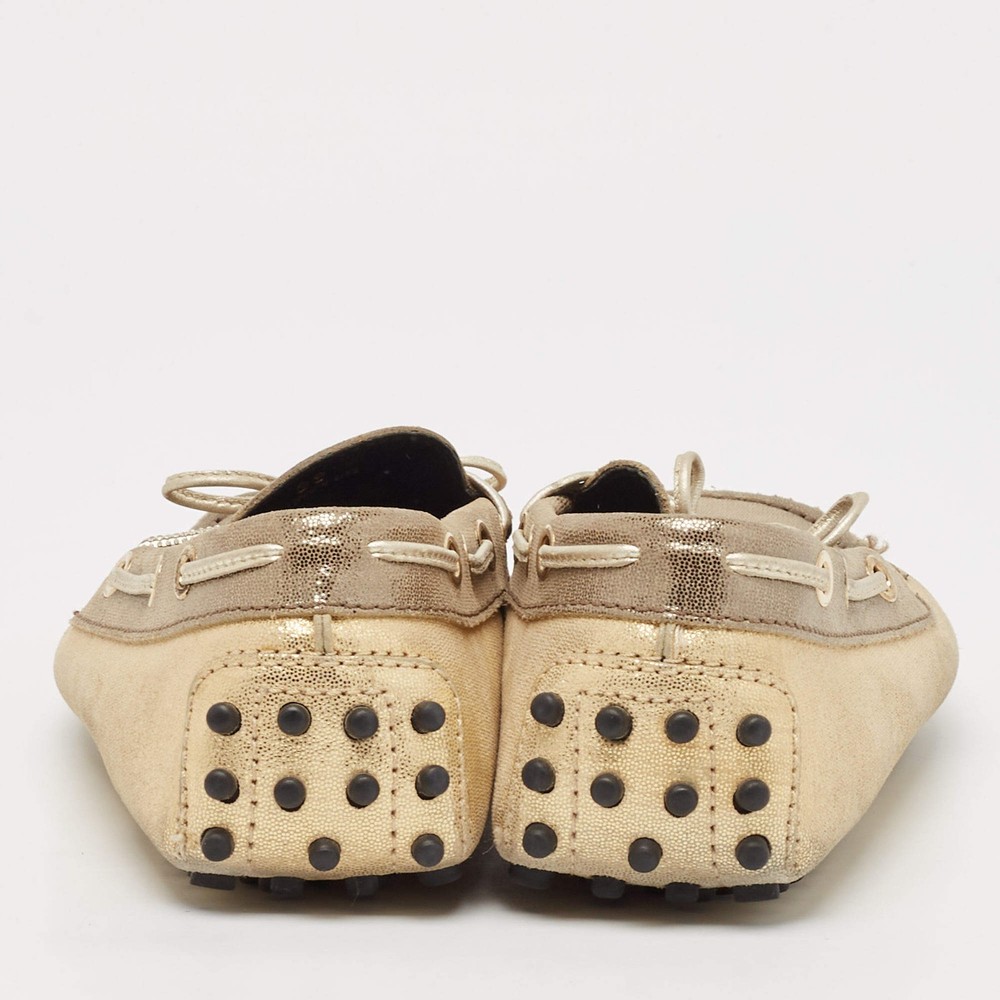 Our eBay Store About Us Contact Us Add to Favorite Sellers Tods GreyGold Textured Suede Bow Slip On Loafers Size 38 Crafted from textured suede in grey and gold, these Tod’s loafers are adorned with a charming bow detail. A sophisticated and versatile slip-on option that pairs well with both casuals. Product Details Brand Tod's Color Gold Includes The Luxury Closet Packaging Outsole Length 25 cm Outsole Width 8 cm Size 38 Certified by The Luxury Closet This item has gone through a detailed authentication process overseen by our experts. We offer a lifetime guarantee of authenticity on all our items. How We Check The in-house team of experts at The Luxury Closet is highly trained to verify the authenticity and the condition of the luxury products. They ensure that only 100% authentic items are put on sale.The evaluation process is unique with its own mix of assessment criteria and differs according to the category. Each item is evaluated based on the following combination of hallmarks, hardware, stitching, symmetry, material, craftsmanship, stamping, codes, hologram stickers, and packaging. Our authenticators also check if the items have been modified or amended (e.g., aftermarket diamonds, replaced batteries, repaired bags, etc.) International Buyers Import duties, taxes and charges are not included in the item price. These charges are the buyers responsibility. Please check with your country’s customs office to determine what these additional cost will be prior to buying.