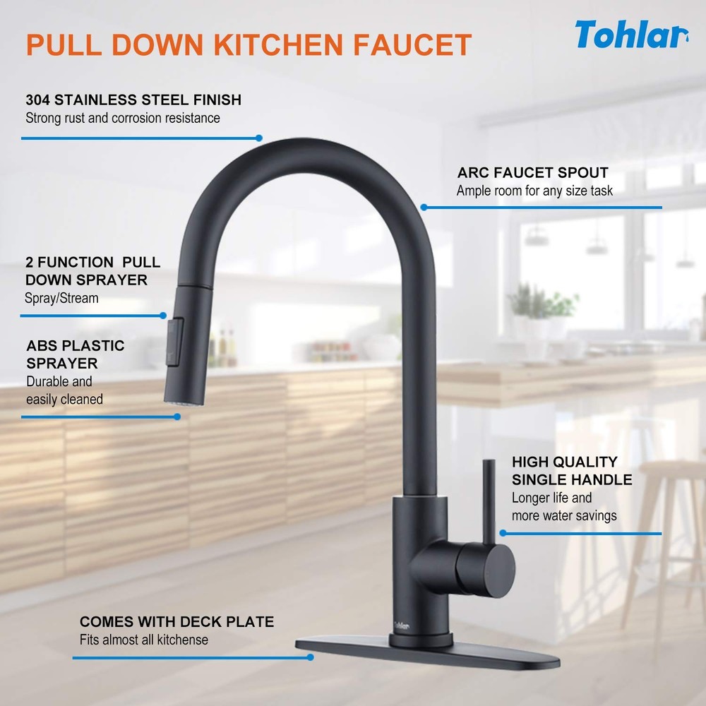 【QUALITY ASSURANCE】 - Tohlar kitchen faucet made of SUS 304 stainless steel, multi-layer surface protection can be anti-corrosion, anti-rust, longer life. 【CLASSIC MATTE BLACK APPEARANCE DESIGN】 - Classics that never go out of style, the surface of the anti-fingerprint design, usually just use a soft cloth to wipe the faucet can be. 【EASY TO USE】- Black kitchen faucet with sprayer got 2 water modes: A silky soft and steady stream; A med-high pressure shower stream. Both of them can meet various washing requirements. 【EASY DIY INSTALLATION】- NO NEED plumber, save money and time. Everything you need is in the box. Quick connect hose takes only 30 minutes for easy DIY. 【RETURNS POLICY】- 90-Day return Guaranteed & 2 years warranty service. Please feel free to contact us if you have any problem with the kitchen sink faucet, we will try our best to help!