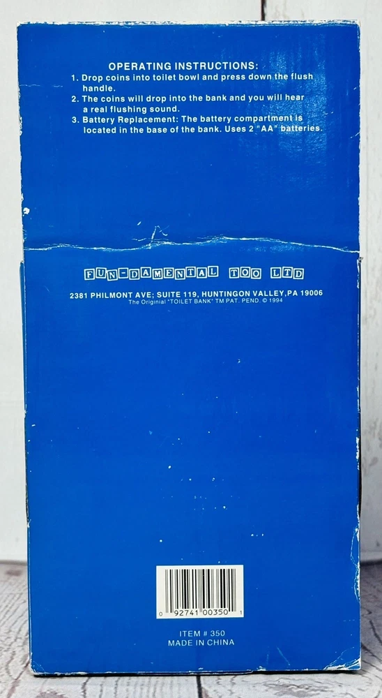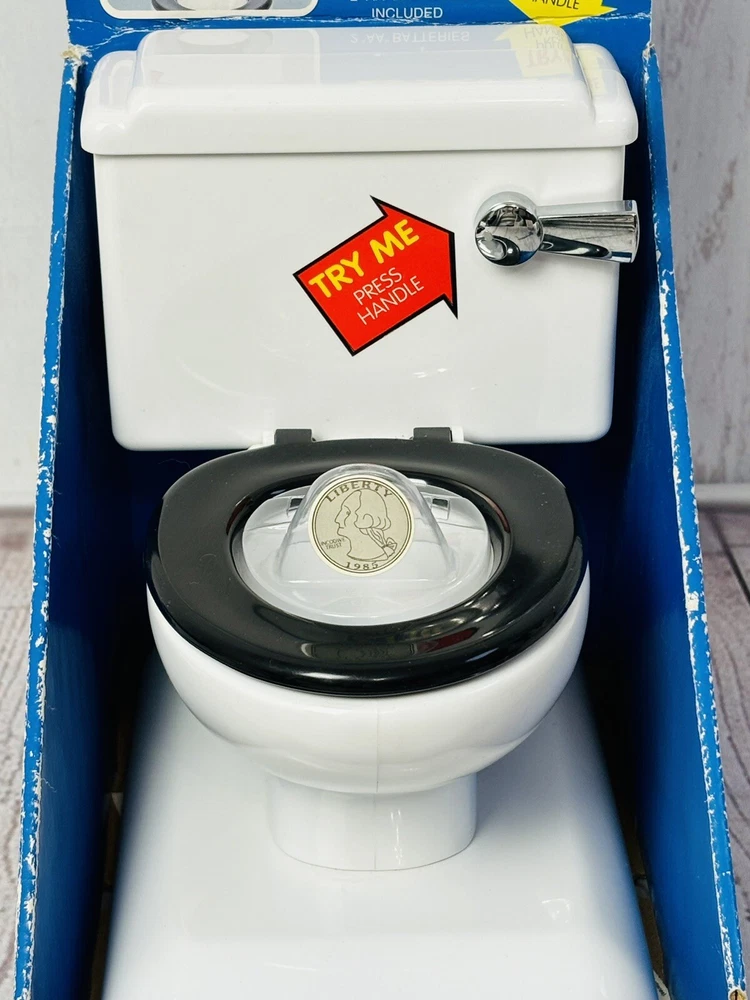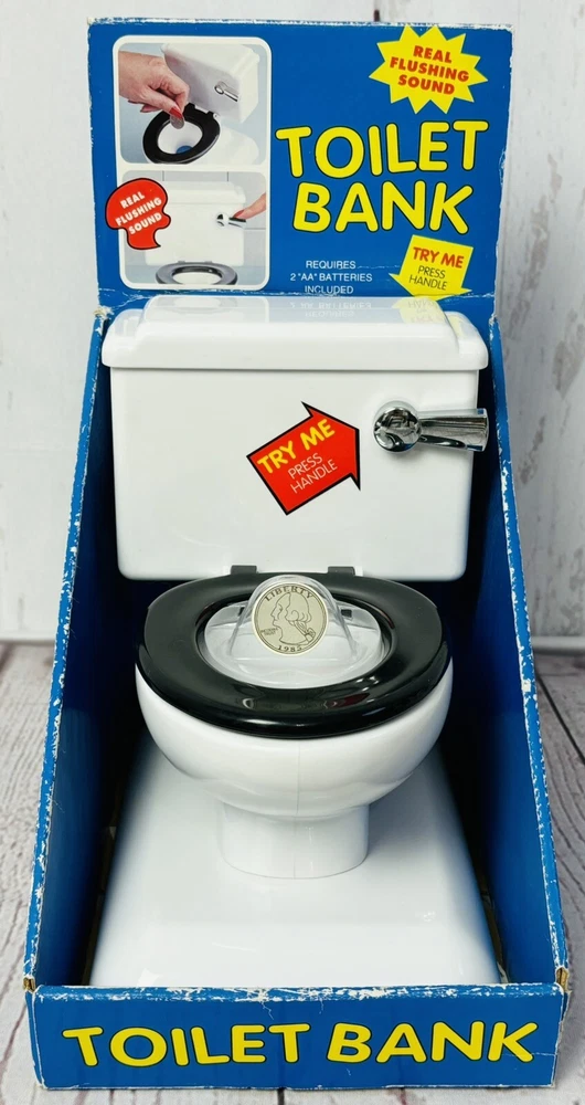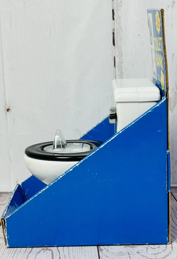 Original packaging has quite a bit of wear - see pictures This unique collectible item is perfect for anyone who loves vintage toys and quirky decor. It features a realistic flushing sound and is made of durable plastic material. The toilet coin bank is a great addition to any collection, and its brand, Fun-Damental Too LTD, adds to its value. It makes a great gag gift for a loved one or for anyone who appreciates unique and quirky items.