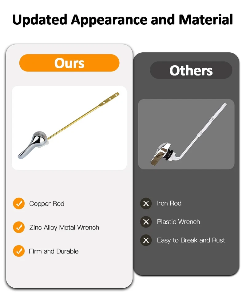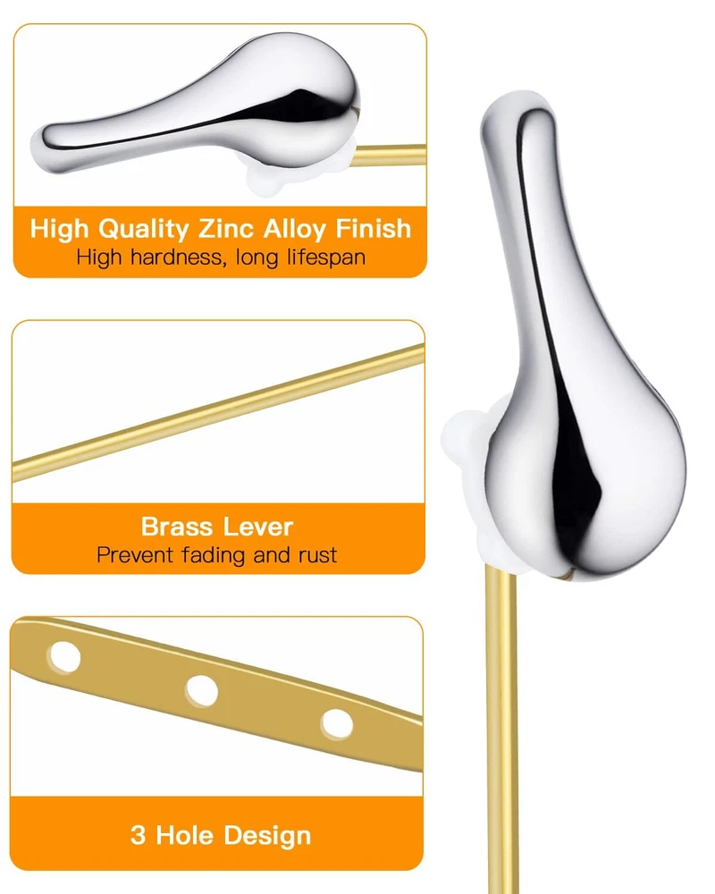 Toilet Handle Replacement Kit Universal Toilet Flush Handle, Zinc Alloy Toilet Tank Trip Lever with H2 Brass Arm, Compatible with American Standard/Mansfield Toilet [High-Quality Materials] Crafted from chrome-plated zinc alloy and an H62 brass arm, this toilet lever boasts exceptional hardness, wear resistance, corrosion resistance, and rust-proof qualities. The toilet handle's sleek, glossy finish adds a touch of high-quality elegance. [Easy Installation] Designed for hassle-free installation, the front-mounting bracket of this toilet flush lever doesn't require any tools. Easily replace your toilet handle with our user-friendly kit, perfectly adjustable to fit your toilet. [Front-Mount Toilet Tank Lever] This front-mount toilet tank lever handle design suits most standard toilets, with the lever's end featuring three holes for flexible length adjustments to match your toilet tank perfectly. [Perfect Replacement] Effectively replace damaged or rusted toilet handles, resolving flushing problems. This beautiful, high-quality accessory not only enhances your bathroom's aesthetics but also revitalizes your old toilet. [User-Friendly Design] The chrome toilet handle is also suitable for children, and the elderly since the control lever is designed with user-friendliness in mind, allowing for easy use without applying too much pressure. And also making it a perfect addition to any family bathroom. [Package Contents] 1 x Toilet handle lever, 1 x H62 brass arm, 1 x rubber pad, 1 x fixing gear, 1 x stainless steel flapper chain. [Toilet Flush Lever Dimensions] The included handle wrench is about 7cm/2.75 inch, the lever is about 20 cm / 7.87inch , and stainless steel flapper chain is 20 cm/7.87 inch long. Shipping We offer FREE shipping on all orders! We ship within Three business days of payment, usually sooner. We use a selection of shipping services such as UPS, FedEx, USPS etc. We only ship to the lower 48 states, no APO/FPO addresses or PO Boxes allowed. Local pickups and combined shipping options are not provided at this time. Return You can return a product for up to 30 days from the date you purchased it. Any product you return must be in the same condition you received it and in the original packaging. Please keep the receipt. Payment We accept payment by any of the following methods: PayPal Please pay as soon as possible after winning an auction, as that will allow us to post your item to you sooner! Feedback Customer satisfaction is very important to us. If you have any problem with your order, please contact us and we will do our best to make you satisfied. Contact Us If you have any queries, please contact us via ebay. We usually respond within 24 hours on weekdays. Please visit our eBay store to check out other items for sale! Thank you for shopping at our store.