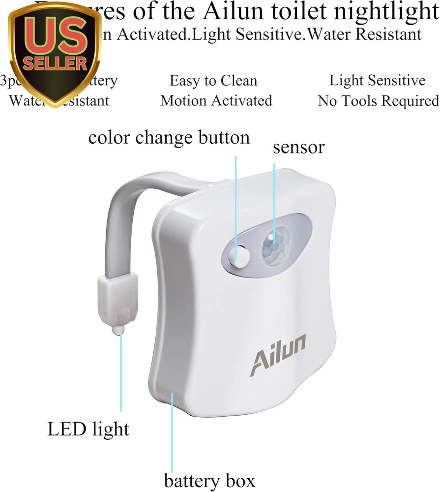 Store New Arrivals Add to Favorite View Feedback Contact Toilet Night Light Motion Activated LED Light 16 Colors Changing Toilet Bowl Illuminate Nightlight for Bathroom Battery Not Included Perfect Decorating Combination with Faucet Light [2 Pack] Description Item model number ToiletNightLight 16Colors 2P Light Source Type LED Style Art Deco Number of Items 2 Power Source Battery Powered Number of Light Sources 1 Country of Origin China Batteries Included? No Lighting Method Up/Down Light Lamp Type Night Light Number of Pieces 2 Room Type Bathroom Efficiency Energy Efficient Product Dimensions 2.91"D x 4.72"W x 2.28"H Material Plastic Batteries 3 AAA batteries required. Installation Type Tabletop Controller Type Push Button Is Discontinued By Manufacturer No Specific Uses For Product Toilet Item Package Quantity 2 Indoor/Outdoor Usage Indoor Water Resistance Level Water Resistant Batteries Required? No Item Weight 3.52 ounces Connectivity Technology USB Special Features Motion-Sensor Special Feature Motion-Sensor Shade Height 2.28 Inches Part Number ToiletNightLight 16Colors 2P Shade Color Multicolor Mounting Type Tabletop Color White Is Cordless? Yes Base Material Plastic Is Waterproof True Shape Bulb Voltage 4.5 Volts Recommended Uses For Product Decoration Shade Material Plastic Included Components Battery Switch Type Push Button [2 Pack] The pack includes two nightlights in total and was packed in one Package. Designed with a soft and flexible PVC neck that can be bent easily to conform to any toilet type, regardless of the shape of the bowl. Motion-Activated LED Sensor: The LED Toilet Light with high quality light sensor and motion sensor, it will automatically turn on when detects movement and stay on for 2 minutes after last movement, protecting your kids from stumbling around in the dark. Ultra-water resistant and can be cleaned with most household cleaners. No more messy cleanups! It is a dream to find your way easily and safely without any worries, the choice of modern life. Creative lighting design: Choose between 16 single colors or color-cycle, this toilet night lamp is going to make your toilet beautiful and easy to use at night. You can keep One Color or Color Rotation on this bowl of light. Easy to Install and Clean: Operated by three AAA batteries(1.5V)(Battery not included), which can be easily get and change. Simple design makes it easy to clean. Product Description Product Description Add to Cart Add to Cart Add to Cart Customer Reviews 4.4 out of 5 stars 1,764 4.3 out of 5 stars 39,098 4.4 out of 5 stars 6,988 — 4.1 out of 5 stars 1,085 Price $13.89 $ 13 . 89 $9.89 $ 9 . 89 $14.99 $ 14 . 99 — — Brand Ailun Ailun Ailun Ailun Ailun Color 16 Colors 8 Colors 8 Colors 16 Colors 8 Colors Quantity 2 Pack 2 Pack 3 Pack 1 Pack 1 Pack Battery type three AAA batteries three AAA batteries three AAA batteries three AAA batteries three AAA batteries Features Ultra-water resistant Motion Activated Motion Activated; Easy clean Ultra-water resistant Motion Activated The video showcases the product in use. The video guides you through product setup. The video compares multiple products. The video shows the product being unpacked. 1. How do set the color? Press the modes switch button to set single color mode when the most desired color is visible,press it again to put it back on color rotation mo