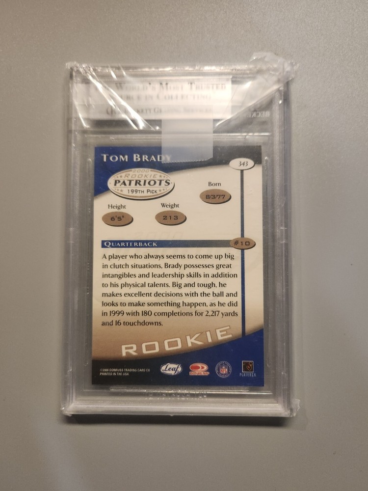 Material:Card StockAutographed:NoPlayer/Athlete:Tom BradyManufacturer:PaniniSeason:2000Team:New England PatriotsVintage:NoFeatures:RookieCountry of Origin:United StatesCard Size:StandardSport:FootballType:Sports Trading CardOriginal/Licensed Reprint:OriginalYear Manufactured:2000Graded:yesSet:2000 Quantum LeafLeague:National Football League (NFL)