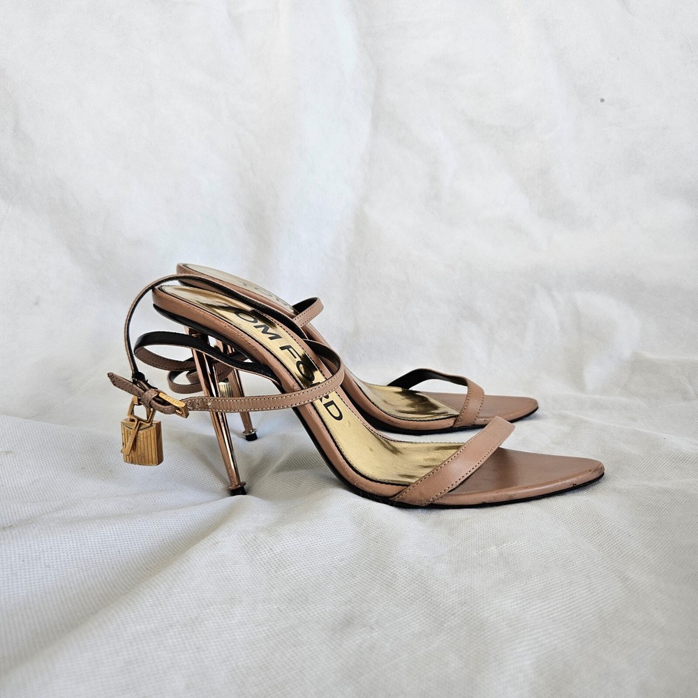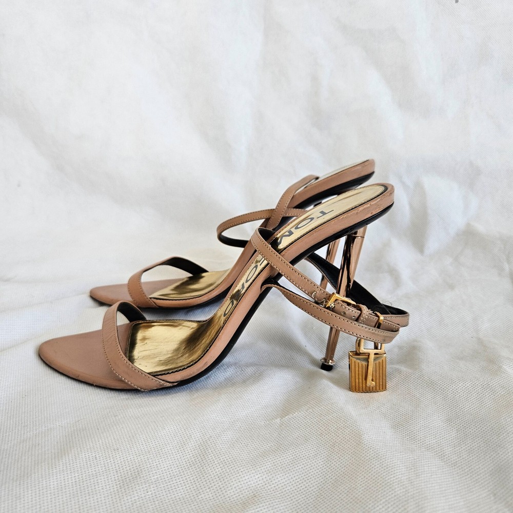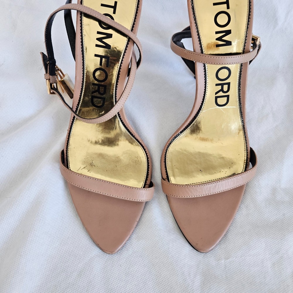 Tom Ford Nude Leather Lock Charm Sandal Heels, 40 Attributes Material: Leather Color: Nude Size: 40 Condition Desc.: Good condition, has scuffed on the Leather