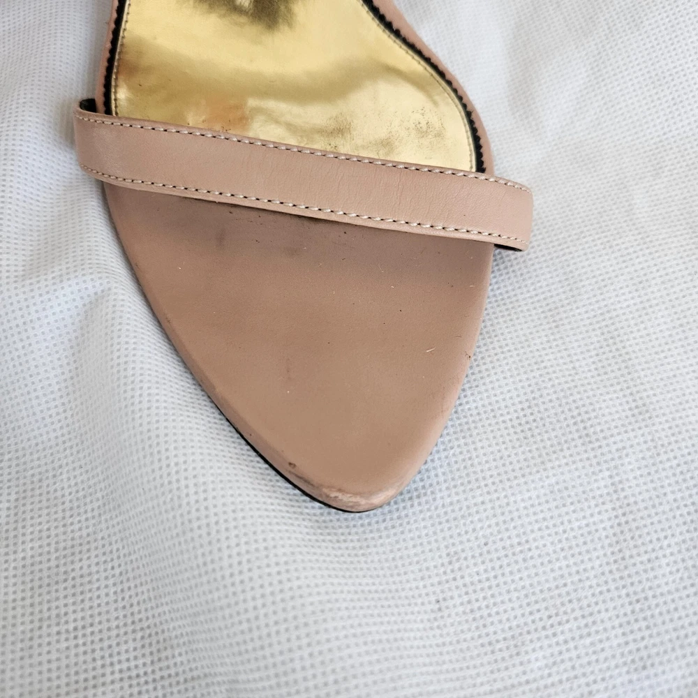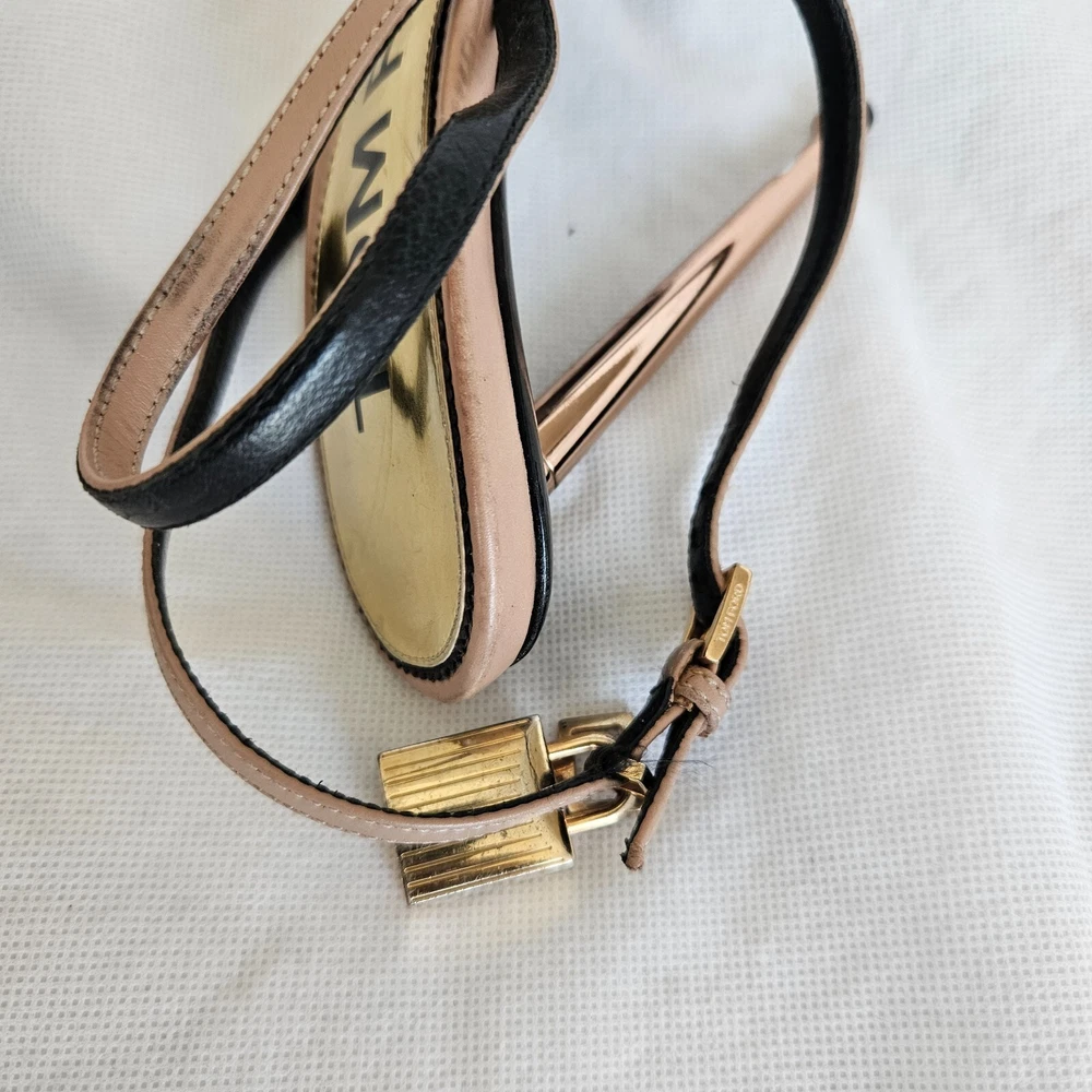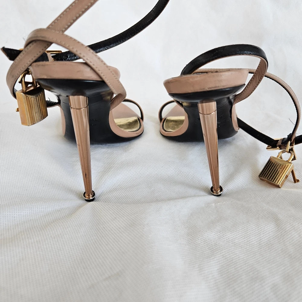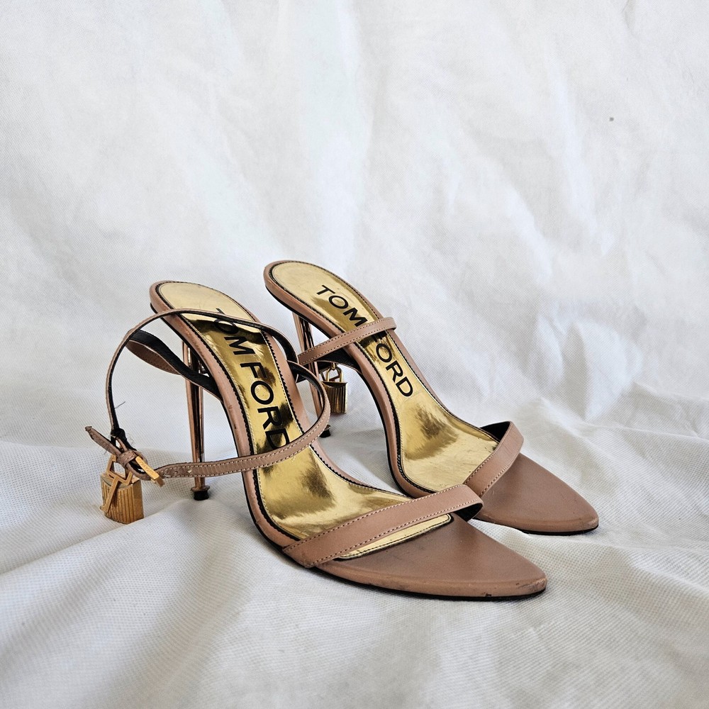 Tom Ford Nude Leather Lock Charm Sandal Heels, 40 Attributes Material: Leather Color: Nude Size: 40 Condition Desc.: Good condition, has scuffed on the Leather