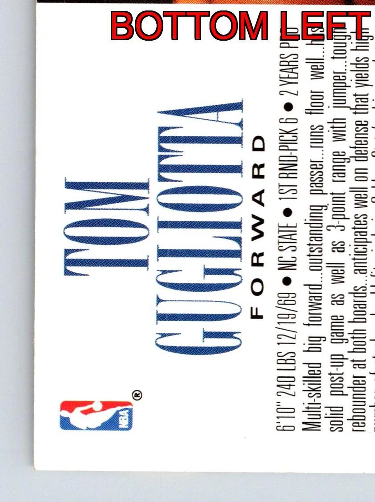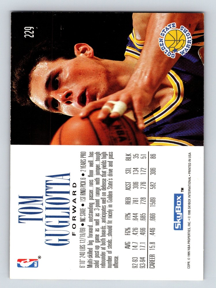 Item Description Title: Tom Gugliotta Golden State Warriors SkyBox 1993 Basketball Card 229 Description: This SkyBox sports trading card from the 1993 series features Tom Gugliotta, a versatile forward known for his time with the Golden State Warriors. Gugliotta, wearing the iconic blue and yellow Warriors uniform, is depicted in an action-packed shot that captures his dynamic playing style and athleticism. Standing at 6'10 and weighing 240 lbs, Tom was known for his capability to both score and defend effectively. The back of the card shares details about his professional career, highlighting his skills and contributions to the team, including his stats in assists, steals, blocks, and shooting percentages. This card is a great collectible for basketball enthusiasts and fans of the Warriors, showcasing an era of rising talent in the NBA. MRSP: $4.99 Sport: Basketball Player/Athlete: Tom Gugliotta Season: 1993 Manufacturer: SkyBox Parallel/Variety: Unknown Set: SkyBox Basketball 1993 Team: Golden State Warriors League: National Basketball Association (NBA) Card Number: 229 Counter: 238 Folder: BASKETBALL1224002