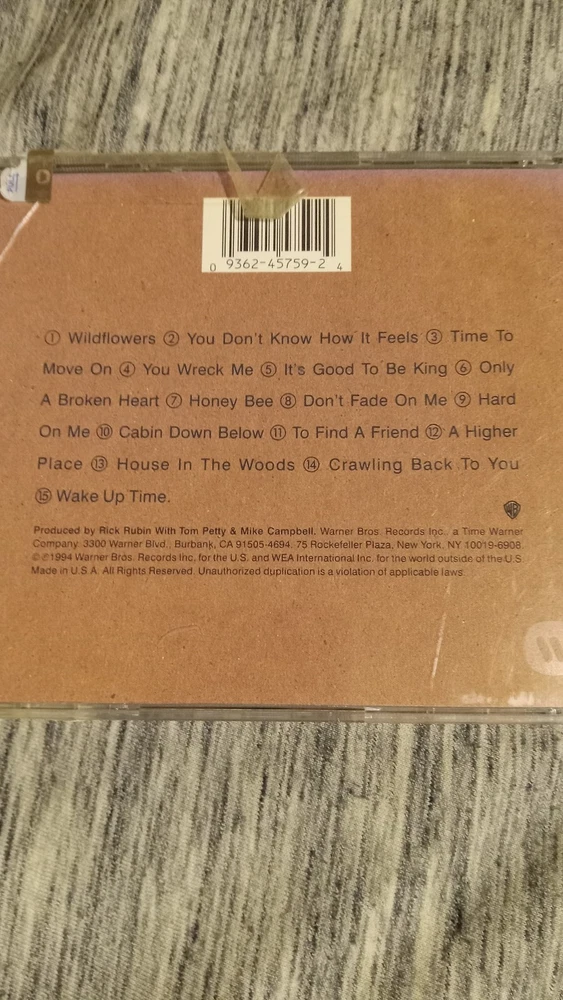 Country/Region of Manufacture:UnknownLanguage:EnglishCD Grading:Very Good (VG)Artist:Petty, Tomgtin13:0093624575924Release Title:WildflowersGenre:RockUPC:0093624575924Release Year:1994Features:AlbumType:63 MinsCase Condition:Very Good (VG)Record Label:Warner Bros. UK, WbukInstrument:Acoustic GuitarColor:MulticolorInlay Condition:Very Good (VG)Format:CDEdition:First EditionCase Type:Jewel Case: StandardStyle:Rock/PopContributor:Lenny Castro (Contributor), Mike Campbell (Contributor), Mike Campbell (Producer), Benmont Tench (Contributor), Benmont Tench (Performer), Rick Rubin (Producer), Steve Ferrone (Contributor), Tom Petty (Performer), Tom Petty (Contributor), Tom Petty (Producer), Michael Karmen (Contributor), Tom Petty (Artist)