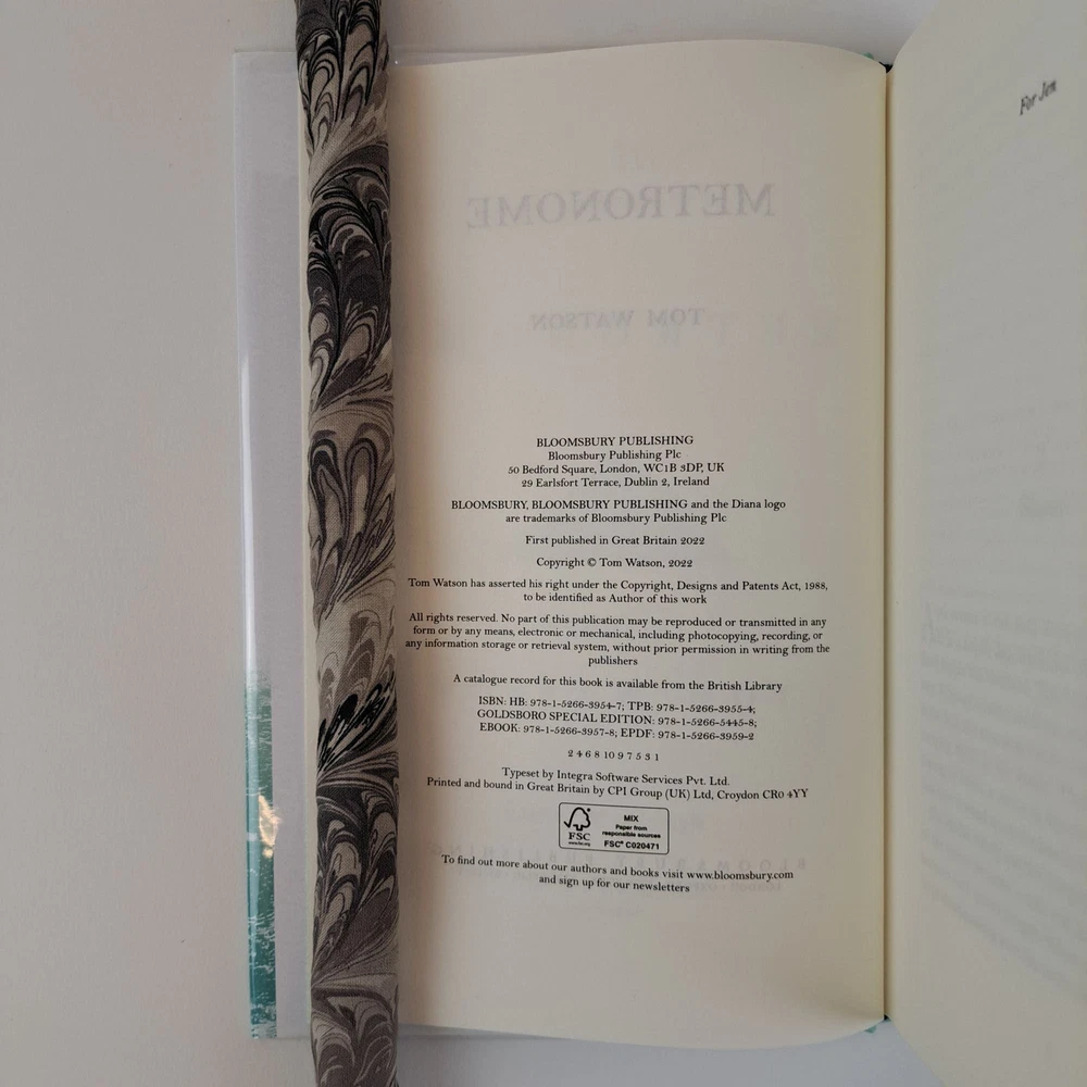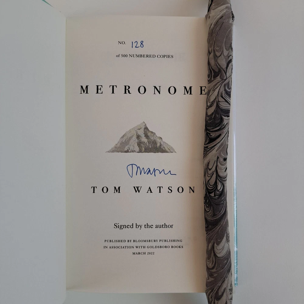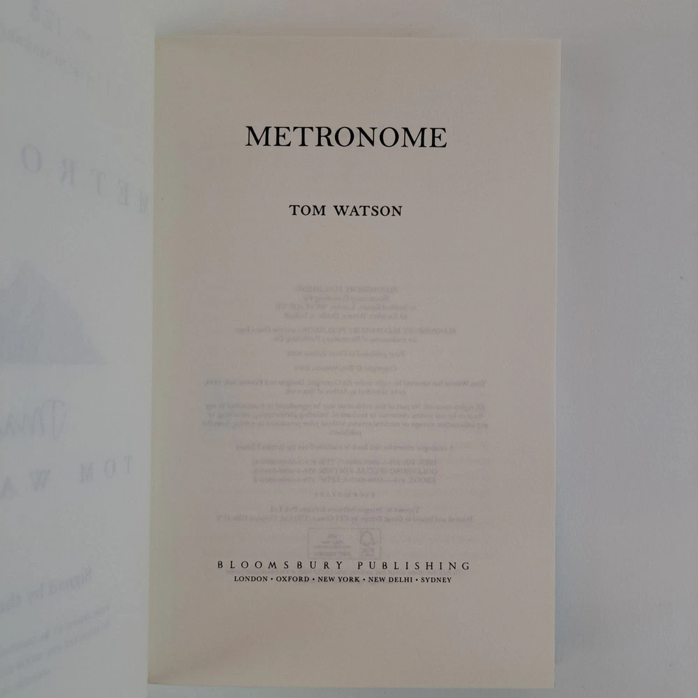 METRONOME [Signed] Author: Watson, Tom Title: METRONOME [Signed] Publication: London, UK: Bloomsbury, 2022 Edition: Limited Edition #128/500 Description: Octavo, 310 pages. In Near Fine condition with Near Fine condition dust jacket. Spine is white and aqua blue with black lettering. Text block tail edge dyed robin's egg blue, fore edge printed with sea and sheep motifs. Signed flat by Tom Watson on publisher's limitation page. Shelved in hallway. Seller ID: 1390851 Subject: Literature Welcome to the eBay store of Second Story Books! DC's Oldest Rare and Used Bookstore, Second Story Books operates two open shops in the Washington D.C. metropolitan area. We have an extensive internet presence and provide accredited appraisals member ASA. This listing was created by Bibliopolis.