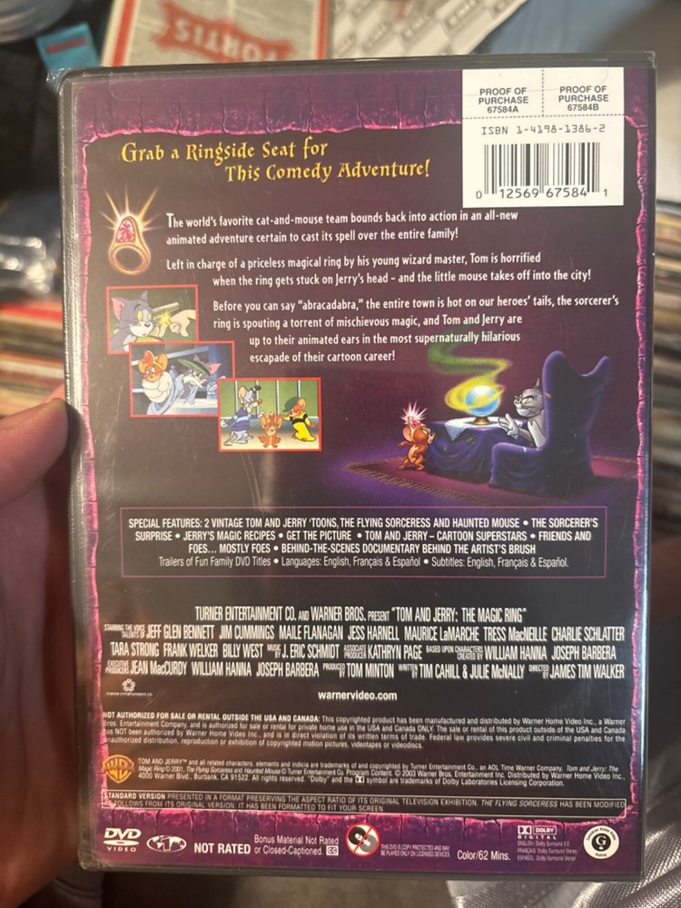 Producer:Tom MintonNumber of Discs:1Item Width:5.52 inItem Weight:0.20 lbgtin13:0012569675841Genre:Animation-Children's & FamilyDirector:Deitch, Filmation, Hanna/Barbera, James T. Walker, Jones, Tex AveryRelease Year:2001Country/Region of Manufacture:MexicoLanguage:English, French, SpanishRun Time:85 min.UPC:0012569675841Movie/TV Title:Tom and Jerry: the Magic RingItem Height:0.57 inFormat:DVDItem Length:7.52 inStudio:Warner Home Video