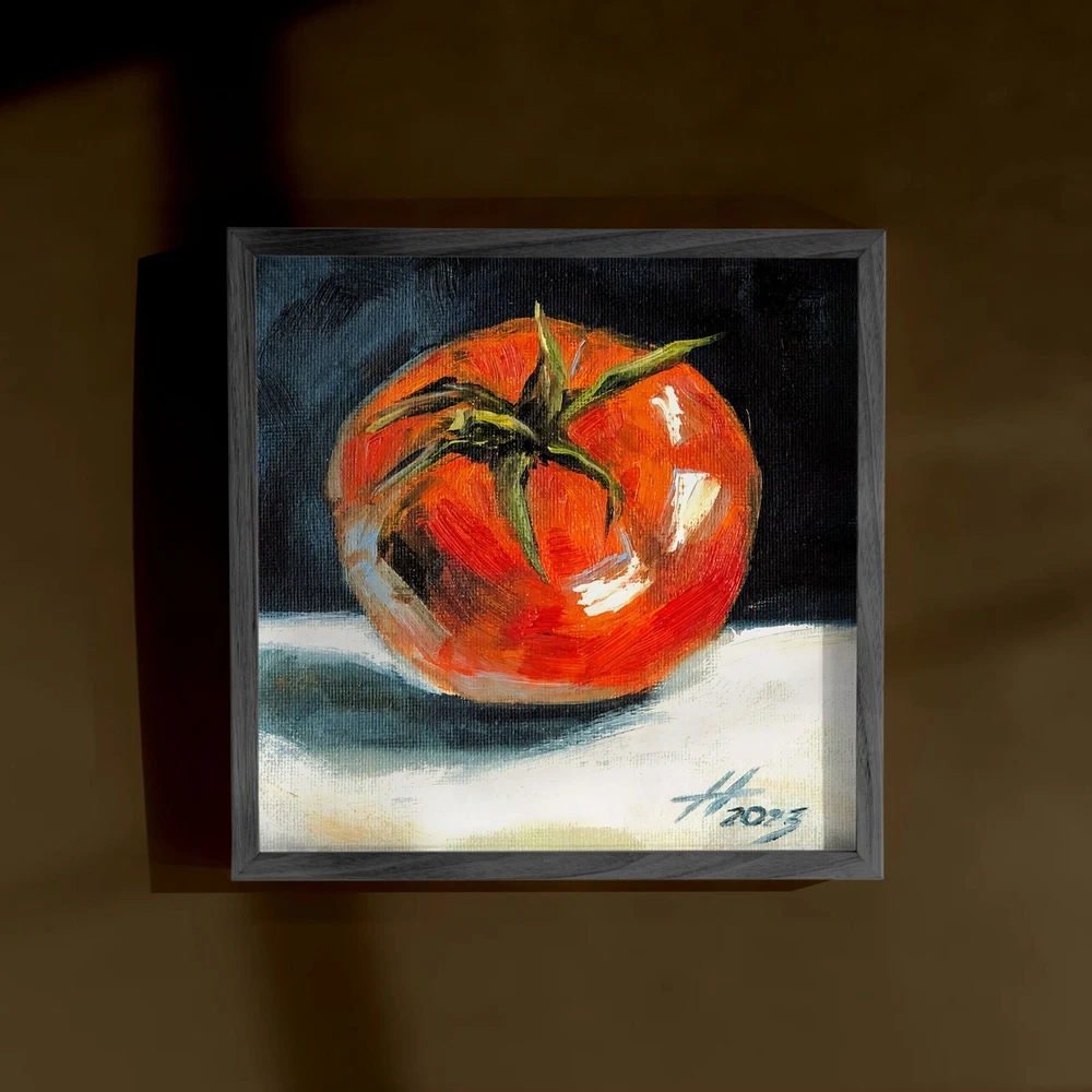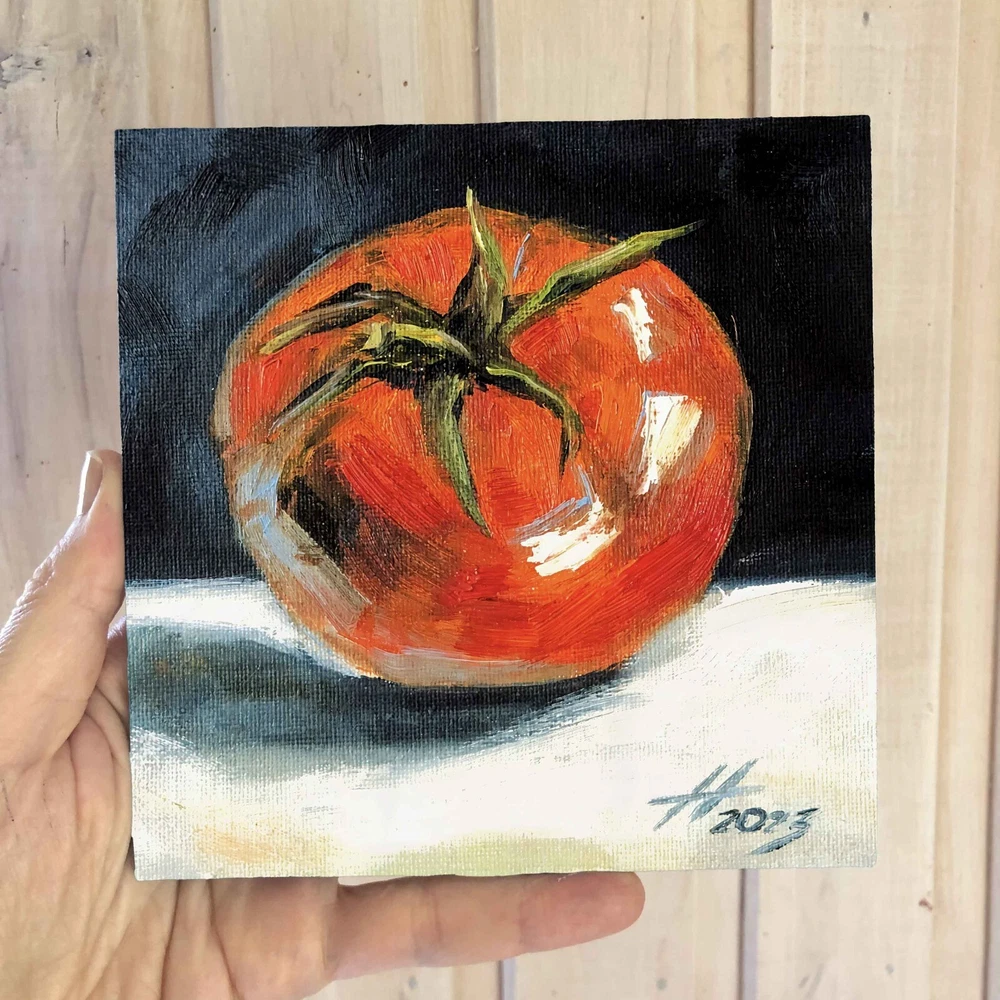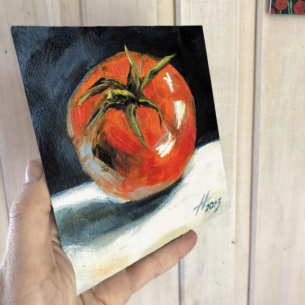 Oil painting «Tomato», size approximately 6.00 x 6.00 inch. See more in my store: This fruity still life features a ripe red tomato, made with oil paints on canvas stretched on cardboard. It's a small oil painting that captures the essence of vegetable still life. This tomato painting is perfect for adding a touch of kitchen folk art to your space. The tomato oil painting, with its Mexican style art vibe, makes a great piece of vegetable wall art or tomato wall art. The depiction of the tomato plant and tomatoes in this fruit artwork will add charm and warmth to your interior. Ideal for any still life painting collection. ♥ Click here to view all of my original art. - https://www.ebay.com/str/artnekrasovaolga —————————— ONE OF A KIND - READY TO SHIP Title: «Tomato» Medium: Сanvas Stretched On Cardboard , Oil Paints , Brushes, Palette Knife, Light Texture. Size: 5.90 W x 5.90 H inch (15.00 W x 15.00 H cm) 100% HAND PAINTED: Original painting from my art studio. A frame is required (supplied without frame) —————————— * will be carefully packaged and shipped with tracking number. —————————— Pay attention, actual colors may vary due to differences in monitors. Consider a unique art painting as an exceptional gift for your mother, sister, father, or significant other. It serves as a wonderful housewarming gift for couples and an excellent choice for a colorful room decor or wall decor in your home gallery. Indulge in the beauty of original artwork, and let it transform your living space in a remarkable way. If you have any questions please feel free to email me anytime… © ArtNekrasovaOlga All Rights Reserved ♥ Thank you for stopping by and viewing my art! ♥ Nekrasova Olga
