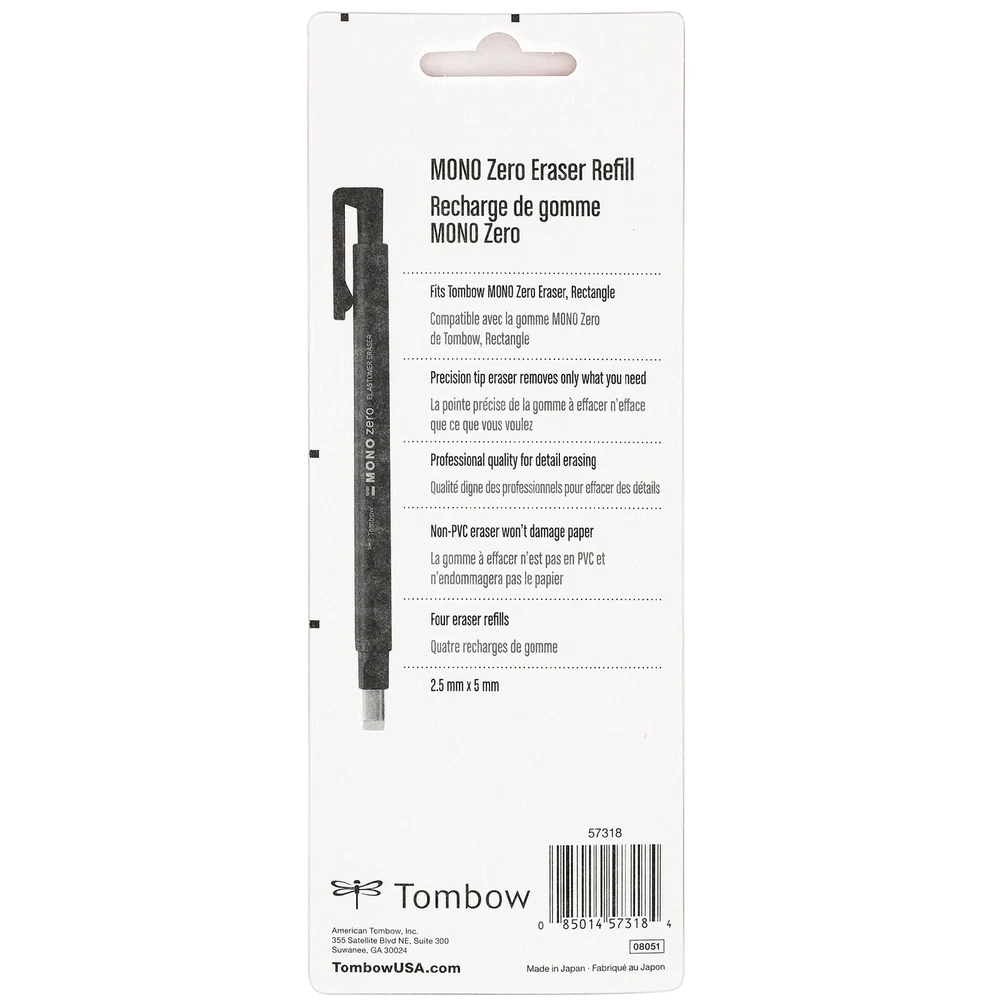 Contains four Mono Zero eraser refills. Protect your work and erase only what you need with high-quality, precision erasers that will not damage your paper. Rectangular tip; 2.5mm. Contains four MONO Zero eraser refills Ultra-fine precision tip protects work and will not damage paper Push button advance Convenient clip for on-the-go corrections Rectangular tip; 2.5mm