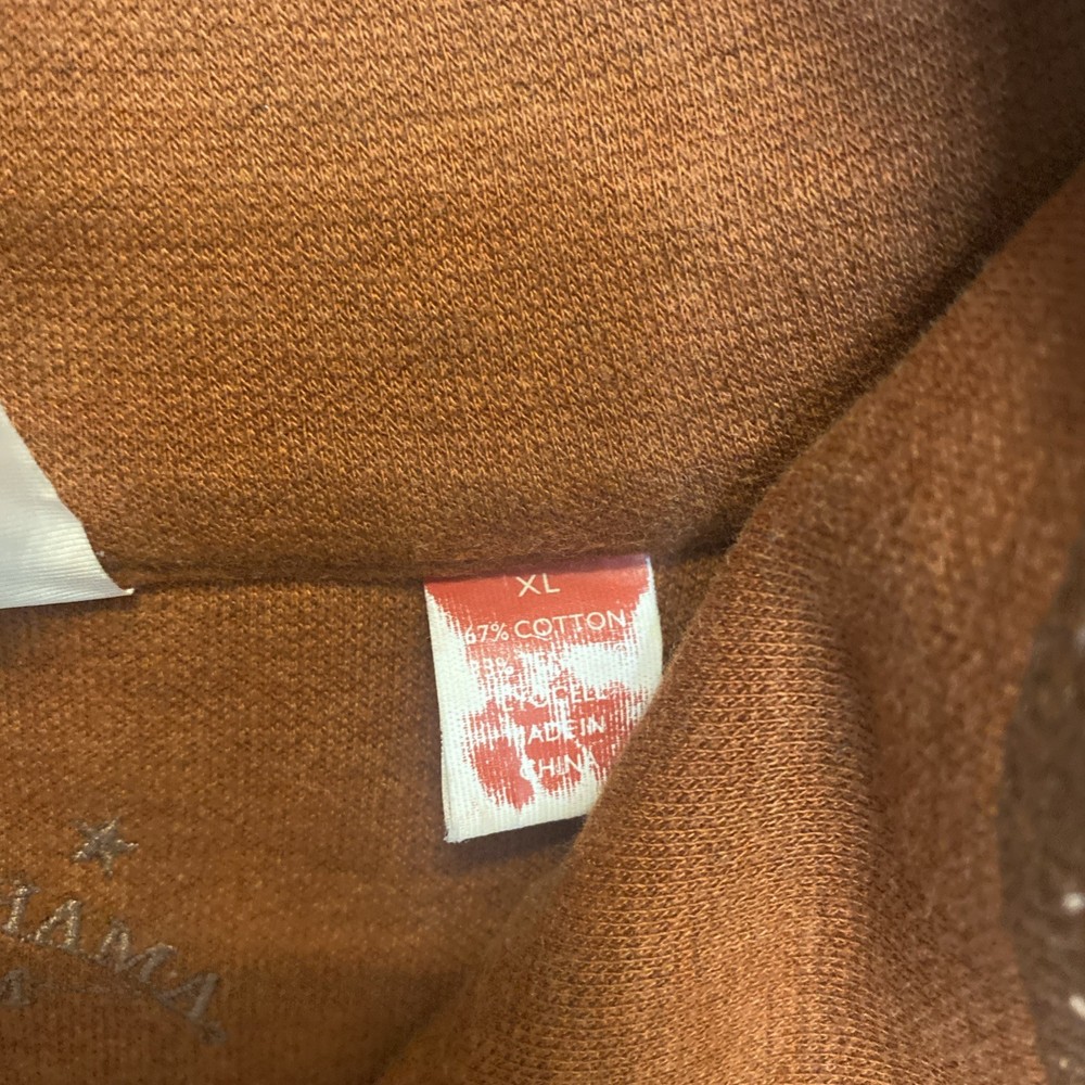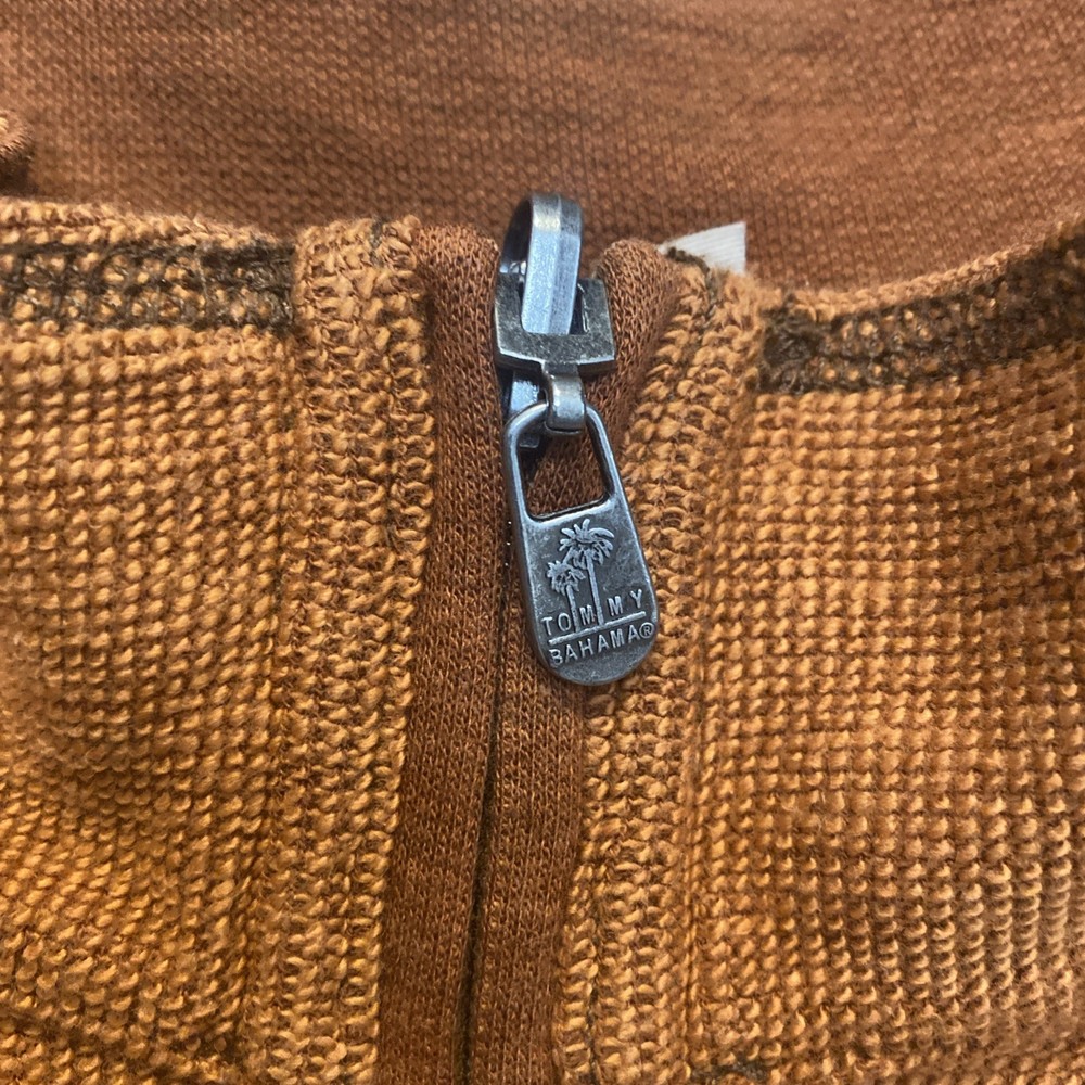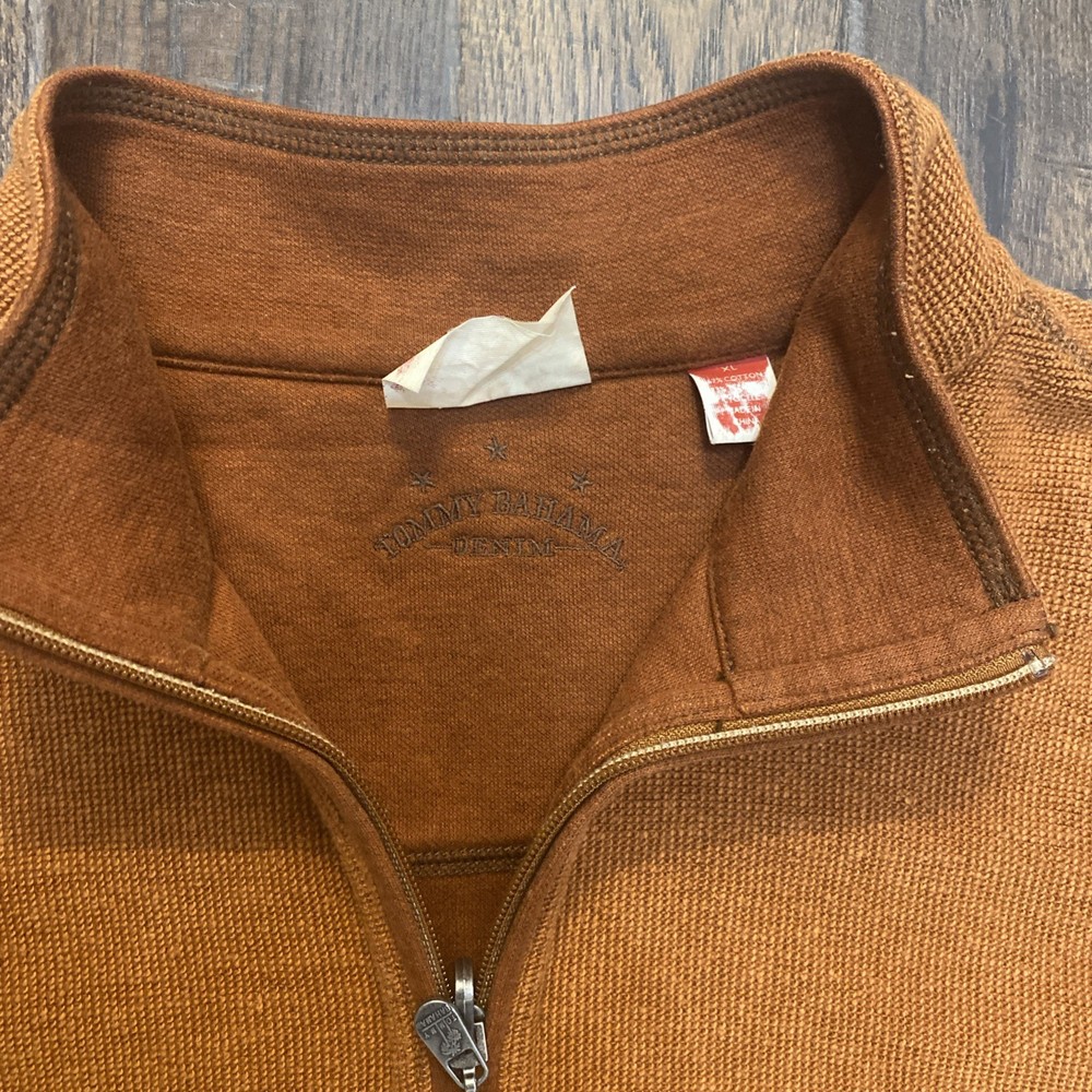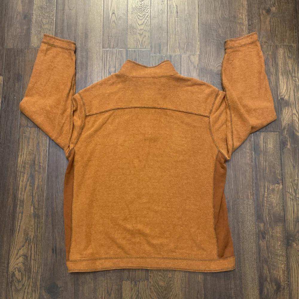 The Tommy Bahama 1/4 Zip Pullover Sweater in XL size is a stylish and versatile piece for men. Made from a soft cotton blend fabric in a burnt orange color, this sweater features a mock neck neckline and a tight-knit design. The sweater is adorned with embroidered logos and is perfect for various occasions such as travel, parties, casual outings, and business meetings. With its classic outdoor theme and comfortable fit, this sweater is ideal for activities like walking, golf, and hiking, making it a practical and fashionable choice for any man's wardrobe.