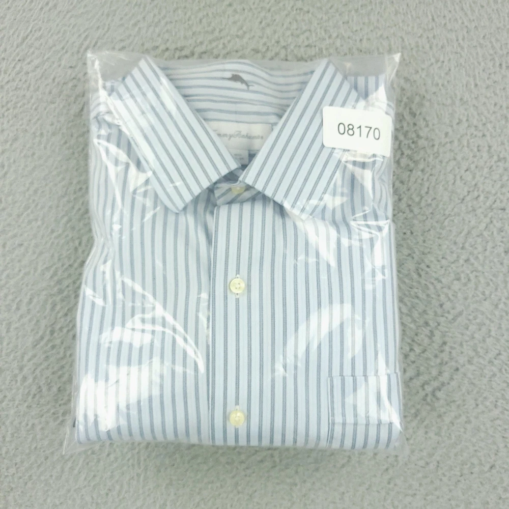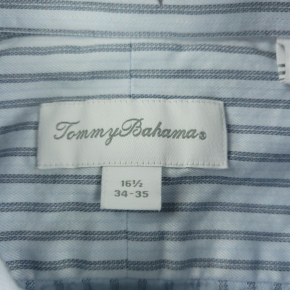 Tommy Bahama Dress Shirt Mens 16.5 Blue Stripe 100% Cotton Long Sleeve Brand: Tommy Bahama. Style: Mens long sleeve dress shirt with full button front placket and spread collar. Color: Light blue base with darker blue vertical stripes. Size on tag: Mens 16.5 Material: 100% cotton woven twill fabric with subtle herringbone texture. Made in China. Features: Classic business-ready silhouette designed for all-season wear, front button closure with pearlized buttons, single chest patch pocket on left side, long sleeves with barrel cuffs and adjustable button closures, back yoke with pleats for comfortable movement, curved shirttail hem suitable for tucking, subtle marlin logo printed at interior back neck above the woven Tommy Bahama label, interior size tag reading 16½ 34–35, interior fabric tag indicating 100% cotton with RN 86549 and CA 55397. Measurements are included in the photos, compare measurements with your item to ensure proper fit. Items are added daily click here to Visit My Store Combined shipping for US customers is 1.99 for each additional item Items are cleaned per eBay standards & policies