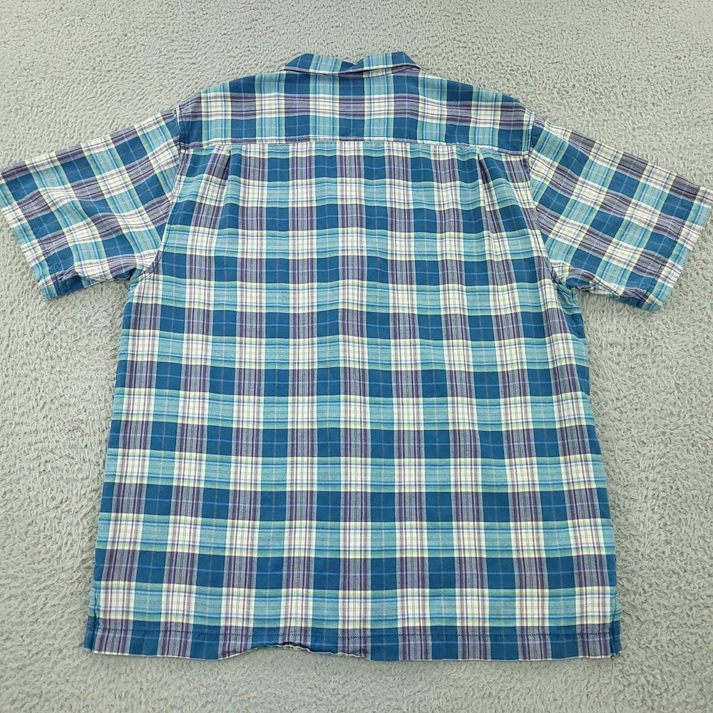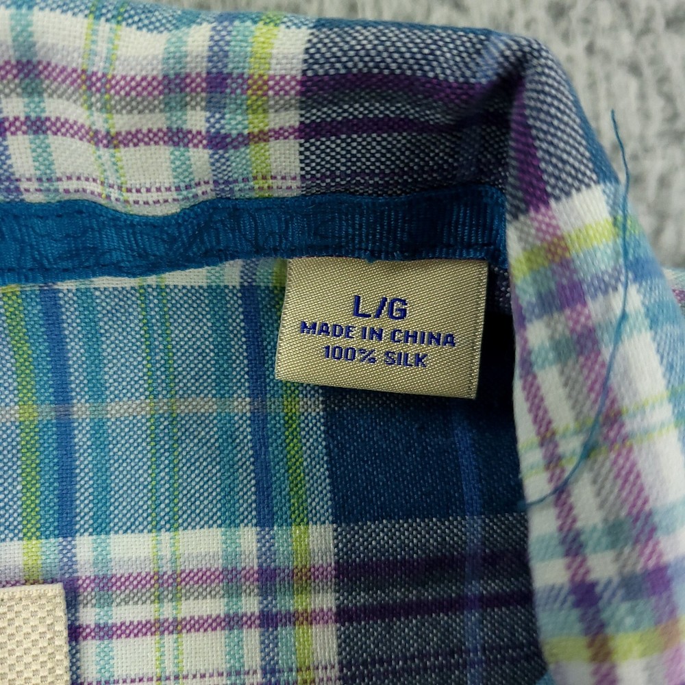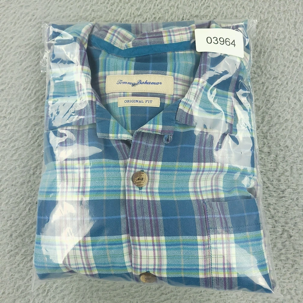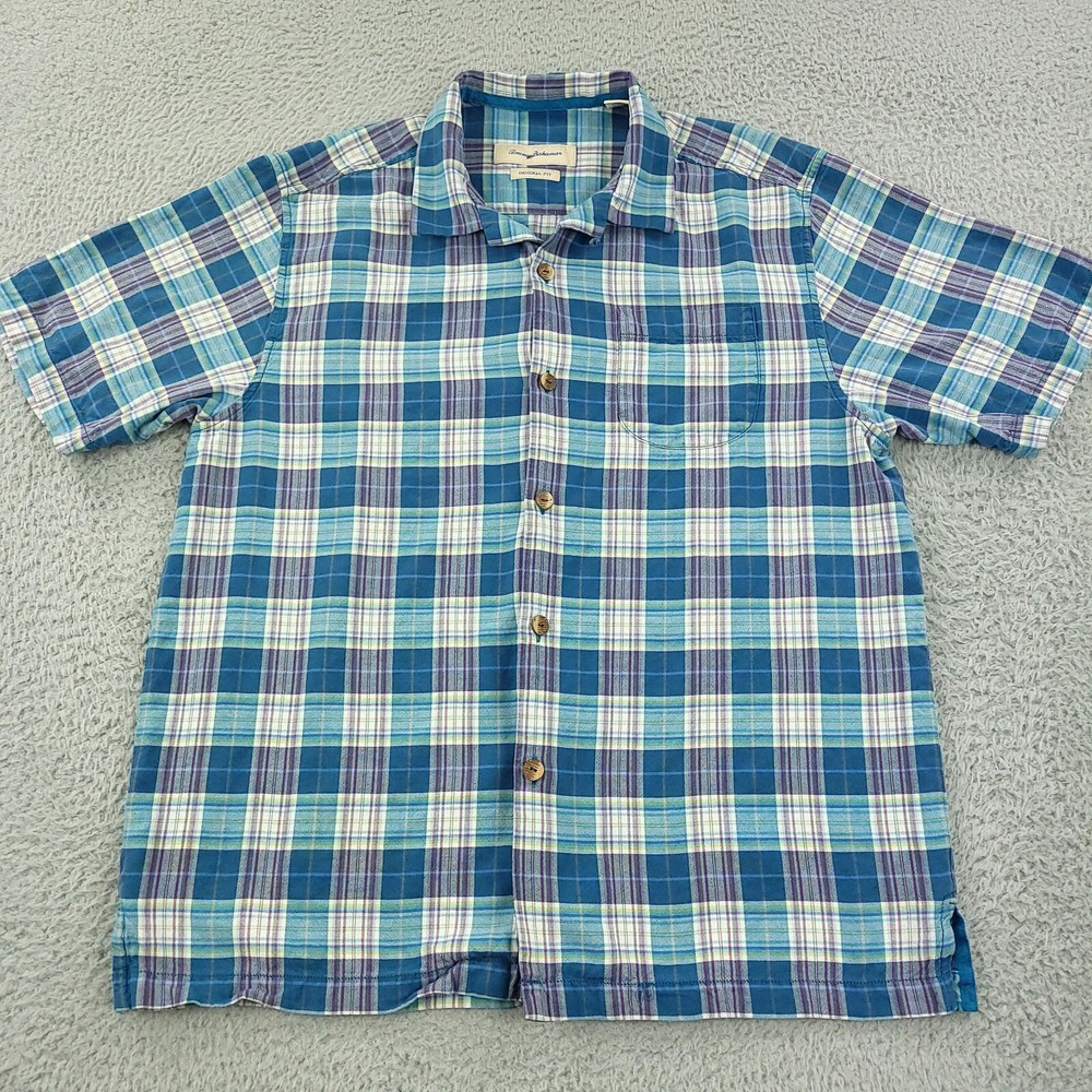 Occasion: Business, Casual, Travel, Workwear Season: Fall, Spring, Summer, Winter Fit: Original Closure: Button Features: Pockets Neckline: Collared Collar Style: Spread Material: Silk Size Type: Regular Theme: Beach, Hawaiian, Tropical Color: Blue Department: Men Type: Button-Up Pattern: Plaid Seller Notes: “Pre-owned shirt with no notable defects. See measurements in photos.” Sleeve Length: Short Sleeve Fabric Type: Woven Brand: Tommy Bahama Size: L Country/Region of Manufacture: China