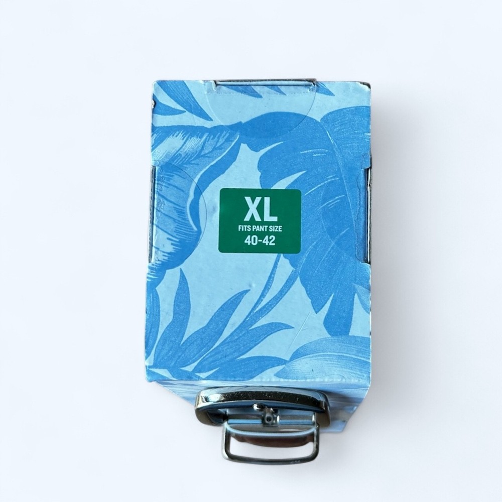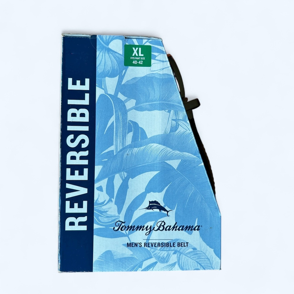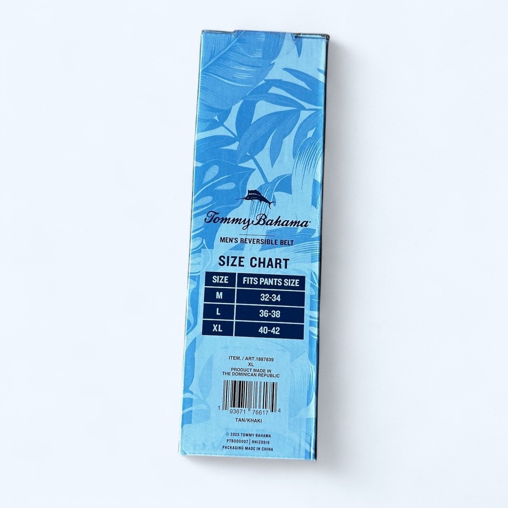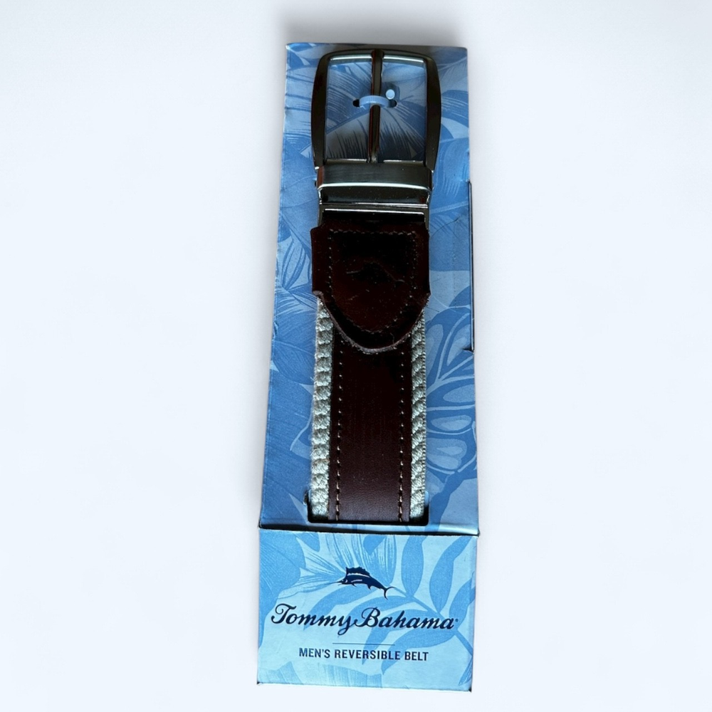 Features: Brushed Nickel Harness Buckle Adjustable Fit Tommy Bahama® Two-in-one reversible Tommy Bahama Marlin Logo on leather tab Made in Dominican Republic Content: 85% Polypropylene | 15% Rubber Leather trim Sizing: Sizes: S/M, L/XL S/M fits pants sizes 32-36 L/XL fits pants sizes 38-42 Width (in): 1 3/8