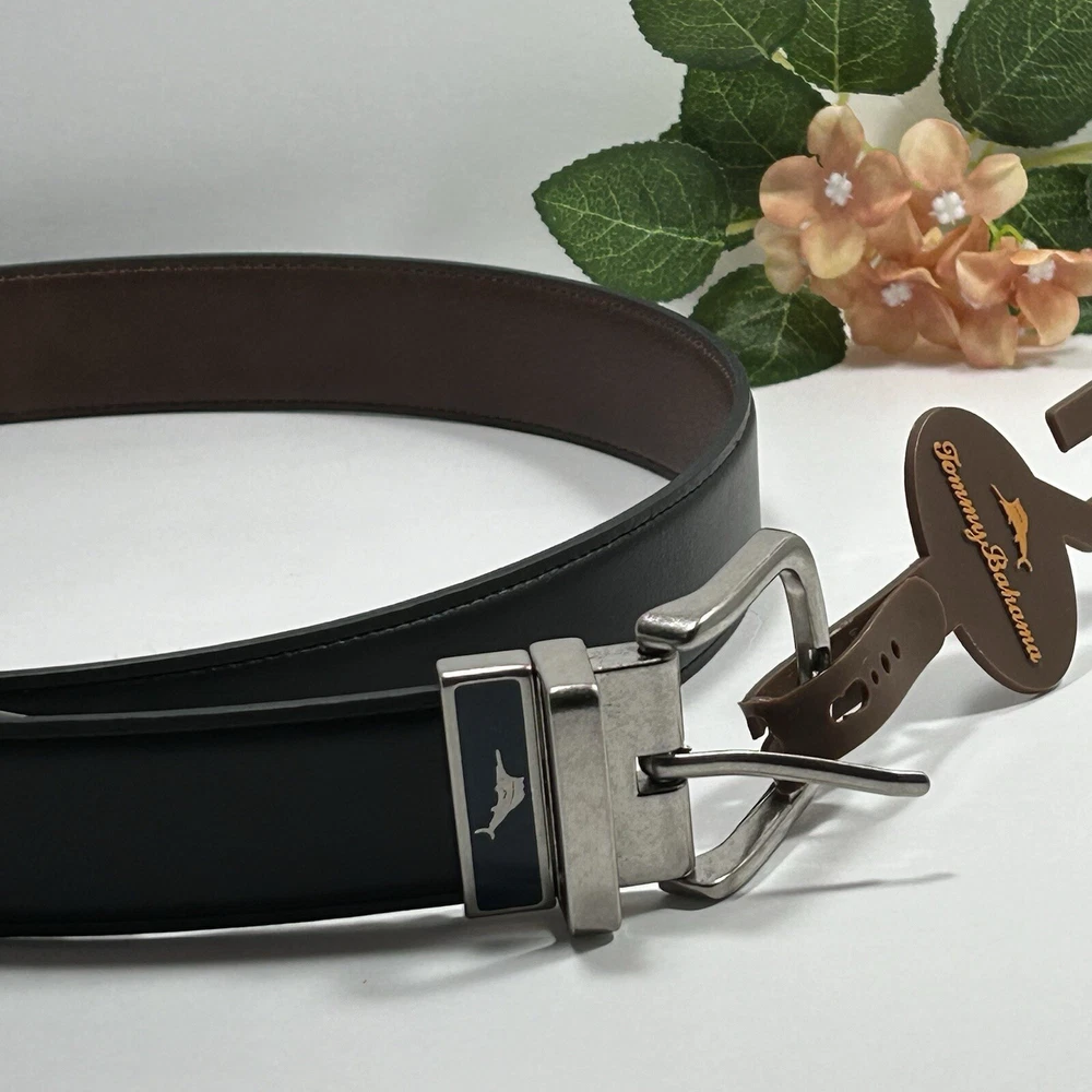 This Tommy Bahama Men's Reversible Black/Brown Leather Belt, size Large new with tags, will elevate your look. This belt is new with tag. While taking photos I notice that it has air bubbles on the blue paint as seen the last photos. As shown in the photos depending on the angel you stand you might notice the air bubble. This is a manufactured defect. If you need more photos or any questions send me a message .
