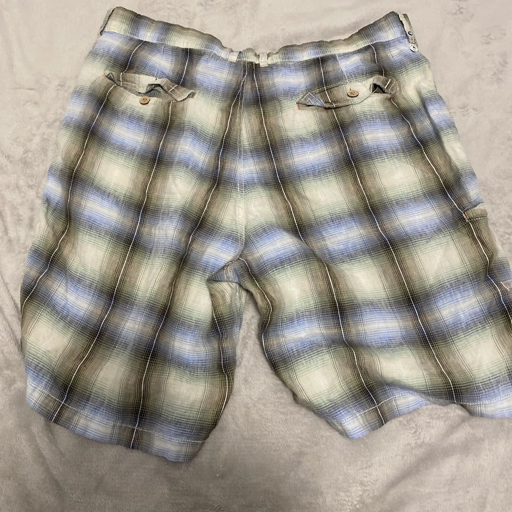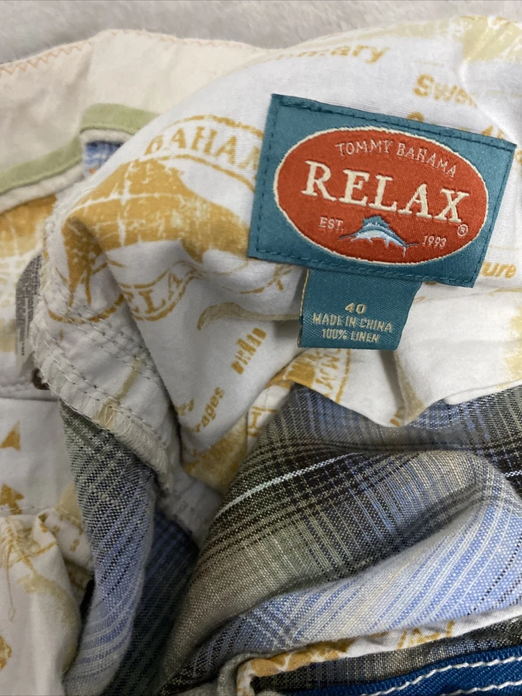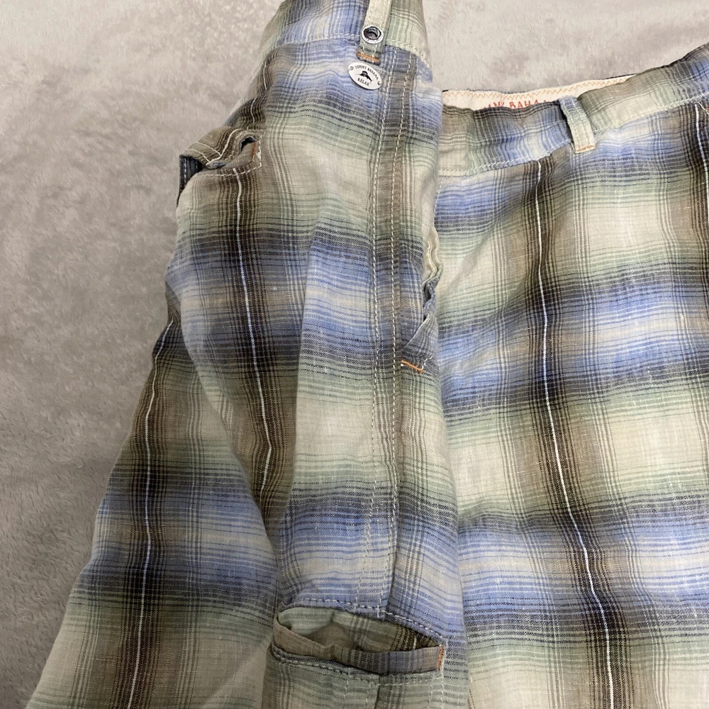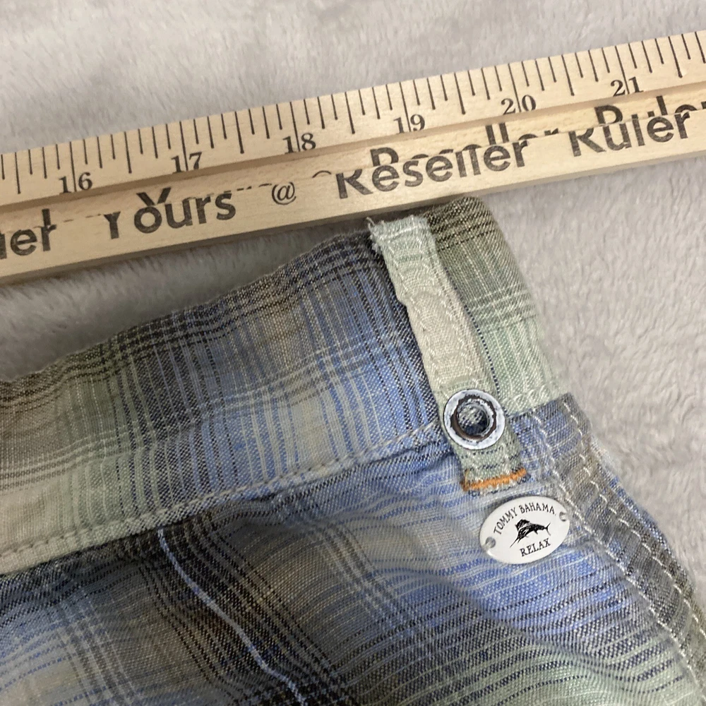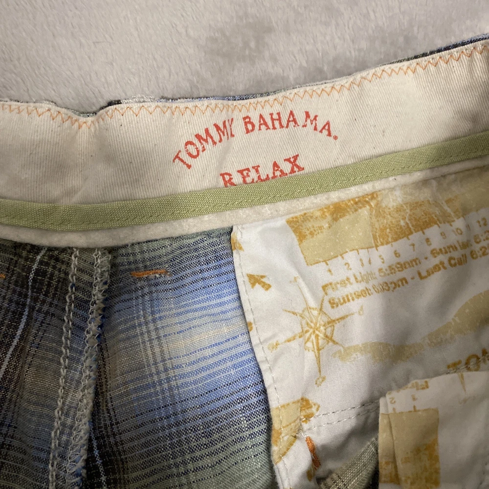 Elevate your casual wardrobe with these stylish Tommy Bahama men's shorts. The plaid pattern in brown and red hues gives off a classic yet modern vibe, while the relaxed fit and flat front design provide ultimate comfort. These Bermuda-style shorts have a zip closure and belt loops for secure wear, and are made of linen material that's perfect for warm weather. With pockets for added convenience, these shorts are versatile enough for outdoor activities or everyday wear. Available in size 40, these shorts are machine washable and suitable for summer, spring, and fall seasons. Add these Tommy Bahama shorts to your collection for a timeless wardrobe staple.
