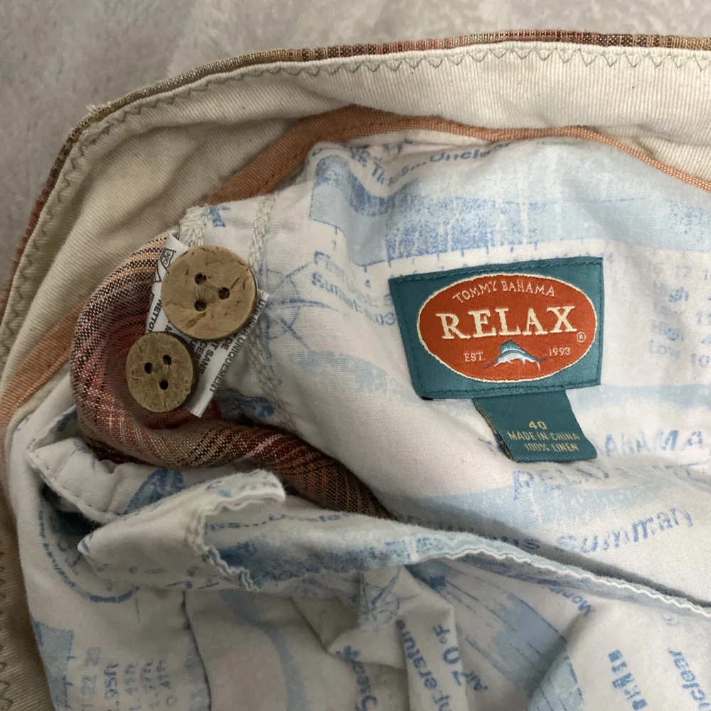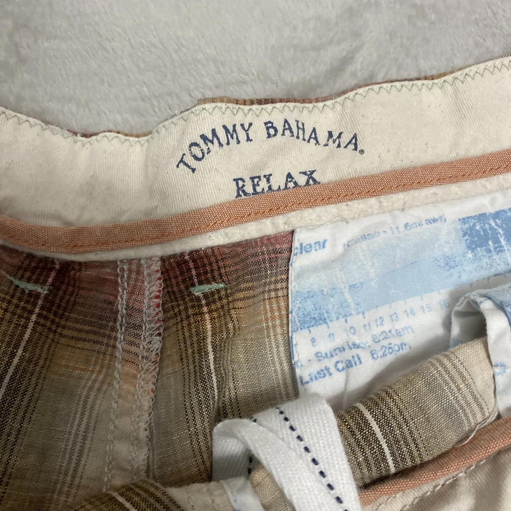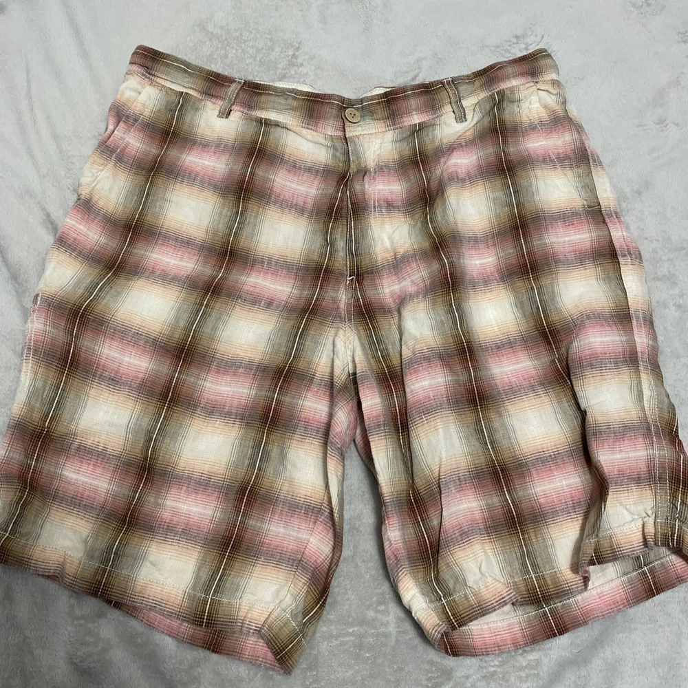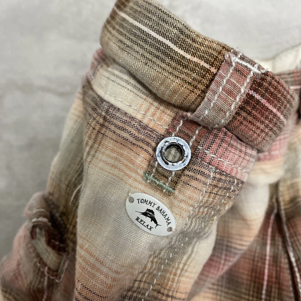 Elevate your casual wardrobe with these stylish Tommy Bahama men's shorts. The plaid pattern in brown and red hues gives off a classic yet modern vibe, while the relaxed fit and flat front design provide ultimate comfort. These Bermuda-style shorts have a zip closure and belt loops for secure wear, and are made of linen material that's perfect for warm weather. With pockets for added convenience, these shorts are versatile enough for outdoor activities or everyday wear. Available in size 40, these shorts are machine washable and suitable for summer, spring, and fall seasons. Add these Tommy Bahama shorts to your collection for a timeless wardrobe staple.