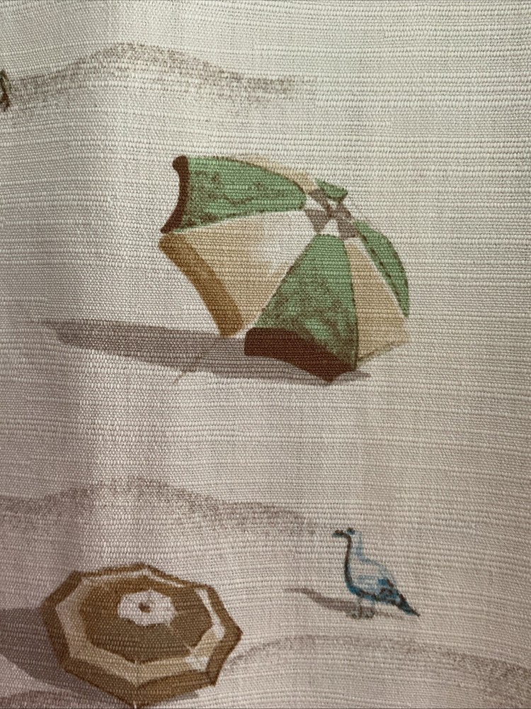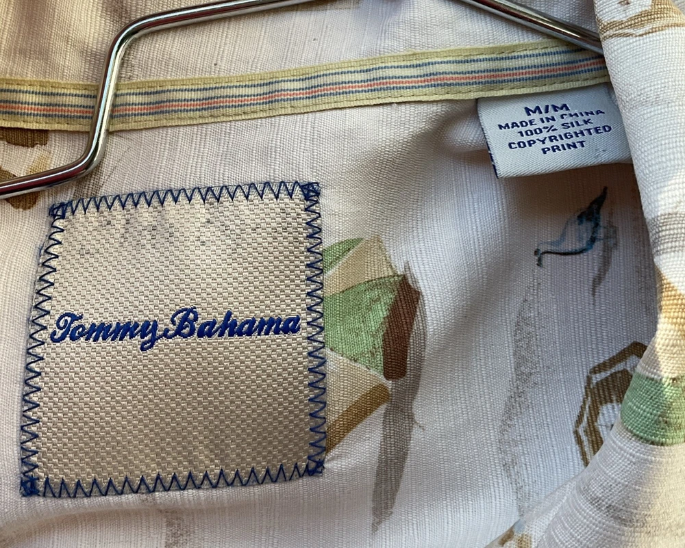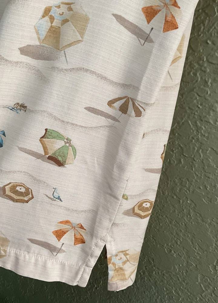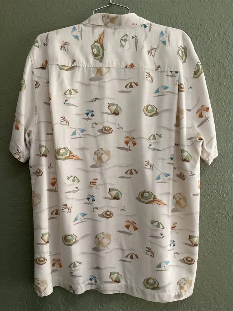 This Tommy Bahama men's camp shirt in size M features a Hawaiian beach scene with umbrellas, seagulls, bathing beauty, beach ball and dogs on a beige silk fabric. The shirt has a collared neckline, short sleeves, a classic fit, and a button-up style. It is designed for all seasons, with a spread collar and a theme inspired by beach and island life. Perfect for casual wear, parties, cocktails, and travel adventures. EXCELLENT CONDITION! Men’s size M Measures LAYING FLAT 23” across the chest 29” length 9.5” sleeves Side slits NO SMOKING HOME NO PET HOME NO COLOGNE HOME
