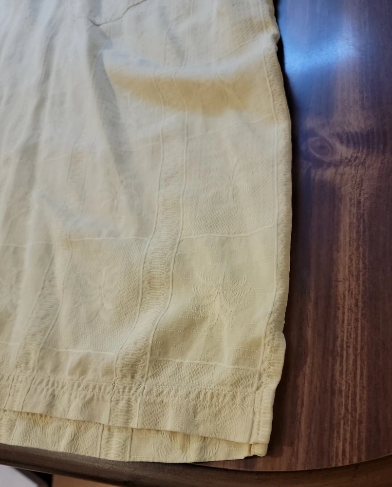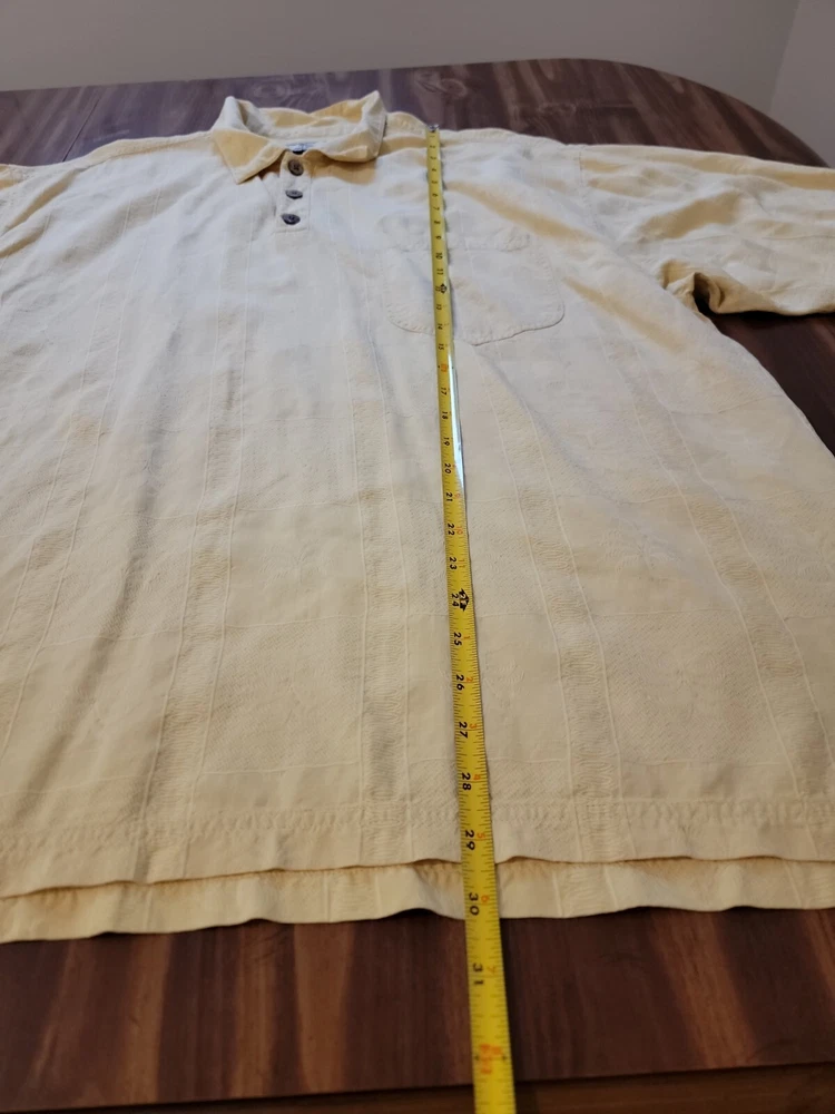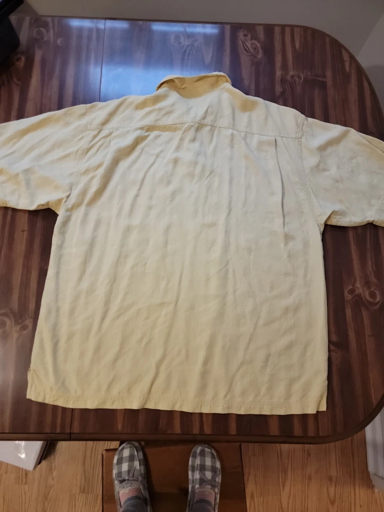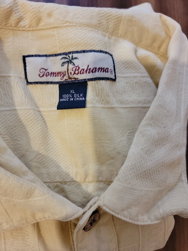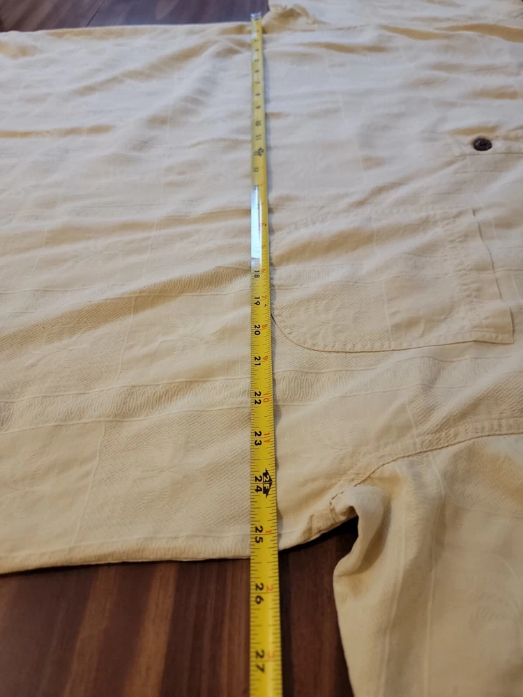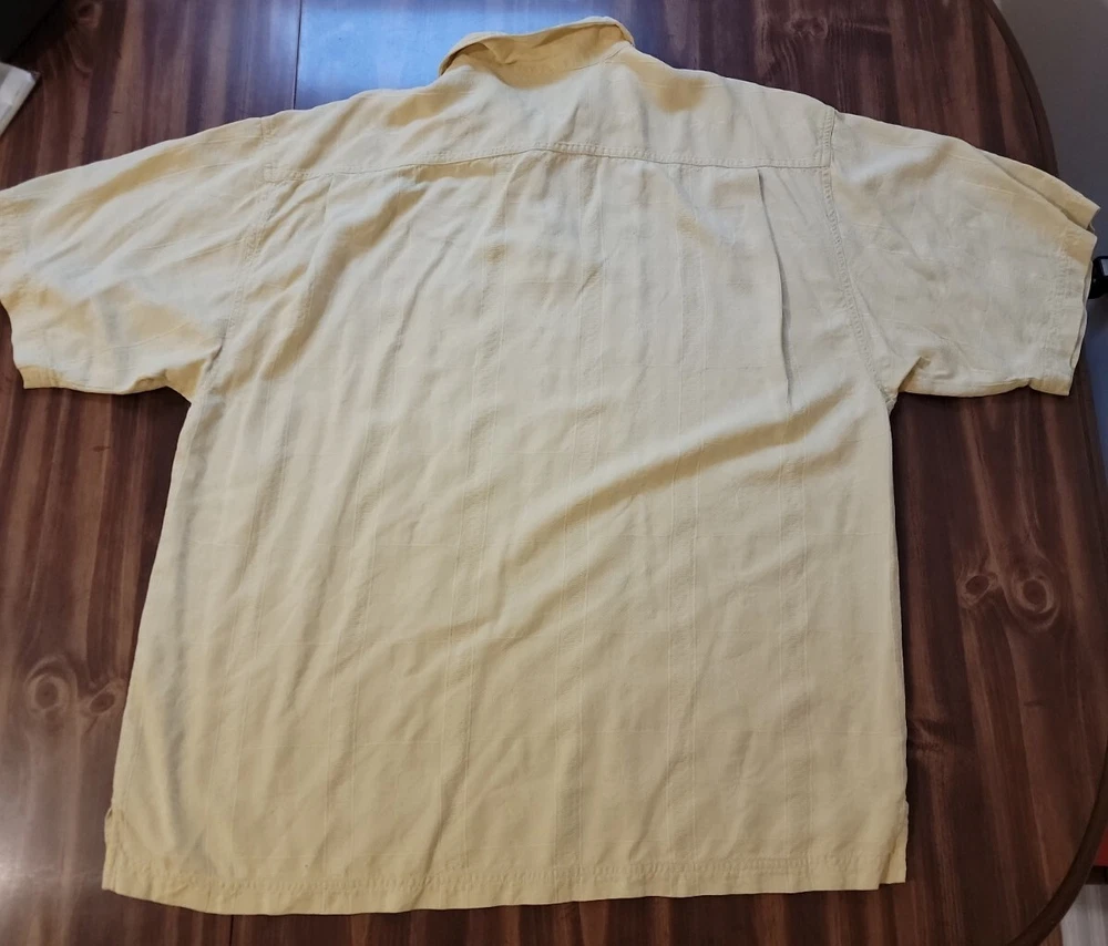 100% silk shirt is in very good used condition and is free from holes, tears, rips and stains. Stored in a smoke-free environment. There are palm trees embroidered in the material. Please see pictures for details and sized dimensions. COMBNED SHIPPING I have immediate payment turned off. To purchase multiple items, buy each one and do not pay. At the end of each day I will send an invoice to each buyer with multiple items and combine shipping. If you are waiting more than 1 day for an auction to end before paying, send me a message. SHIPPING MODES I automatically ship items media mail that qualify, so send a message if you prefer another shipping method and would like to pay for higher shipping. I am happy to ship FedEx or UPS if you would prefer not to ship USPS priority. Just send me a message! CUSTOMER SATISFACTION I try to take good pictures and give good descriptions, but if you ever have any questions, just send a message and I will be happy to send more pictures or edit the listing for clarification. If you are ever unsatisfied with your purchase, please send me a message before rating and I will be happy to help resolve any issues. I combine shipping! I have immediate payment turned off. To combine shipping on multiple items, add each item to your cart. When you are ready to pay, go to your cart and click "Request Combined Shipping." I will then send you an invoice for combined shipping.