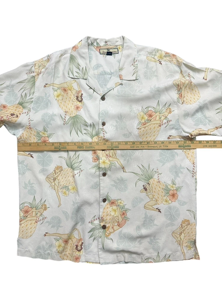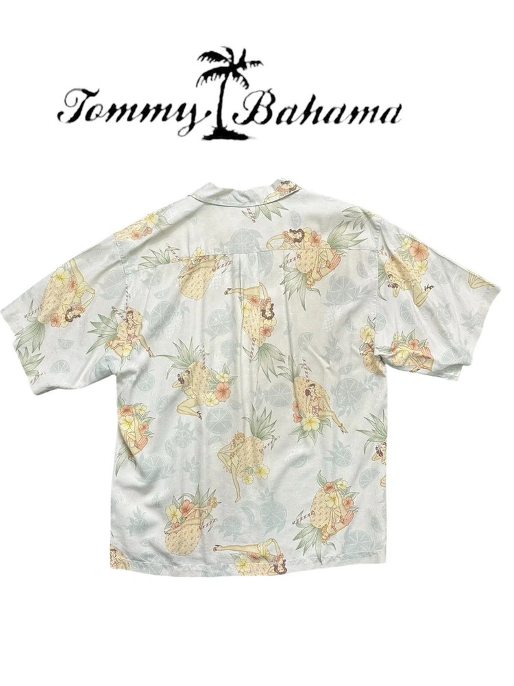 Please see pictures for an accurate description. Same day business shipping. Pet loving smoke-free shipping home. Thank you so much for your interest. If you have any questions, please feel free to ask. Get ready to embrace the tropical vibes with this Tommy Bahama Silk Pineapple Cocktail Hawaiian Bikini Girl Shirt. This shirt is perfect for those who love to add a touch of fun and color to their wardrobe. The shirt features a spread collared neckline, short sleeves, and a button closure. The shirt is made from lightweight and breathable silk knit fabric, which makes it suitable for all seasons. The shirt is adorned with a vibrant multicolor pineapple and pin-up girl pattern that adds a touch of playfulness to your outfit. This regular fit shirt is perfect for men who love to show off their style and personality.