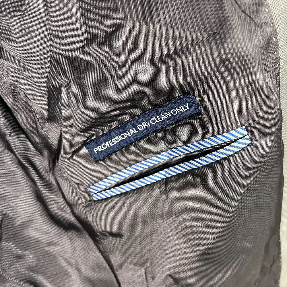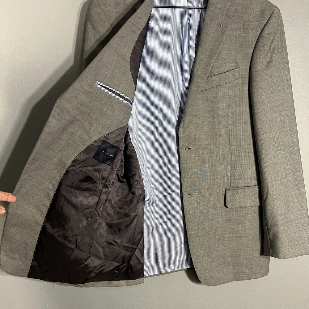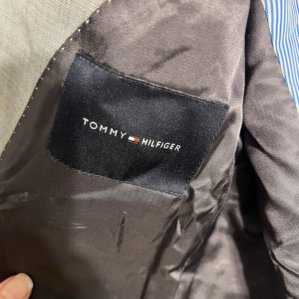 TOMMY HILFIGER 100% Wool Blazer 38R Sport Coat Silver Gray Suit Jacket Modern Good condition. Only flaw is a tiny spot of wear on back left cuff.See photos. Length 30” Underarm to underarm 19.5” Waist 18” Sleeve 25” Shoulder 18”