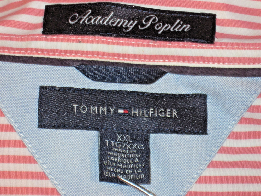 Tommy Hilfiger Academy Poplin Red/White Pinstripe Oxford Dress Shirt 2X New. Made of cool easy care 100% Cotton. Left chest pocket, 1 button cuff. Relaxed 54" chest, 34" overall length from base of collar to hem, 37" sleeve length from center collar to cuff. Comes from a pet free smoke free home.