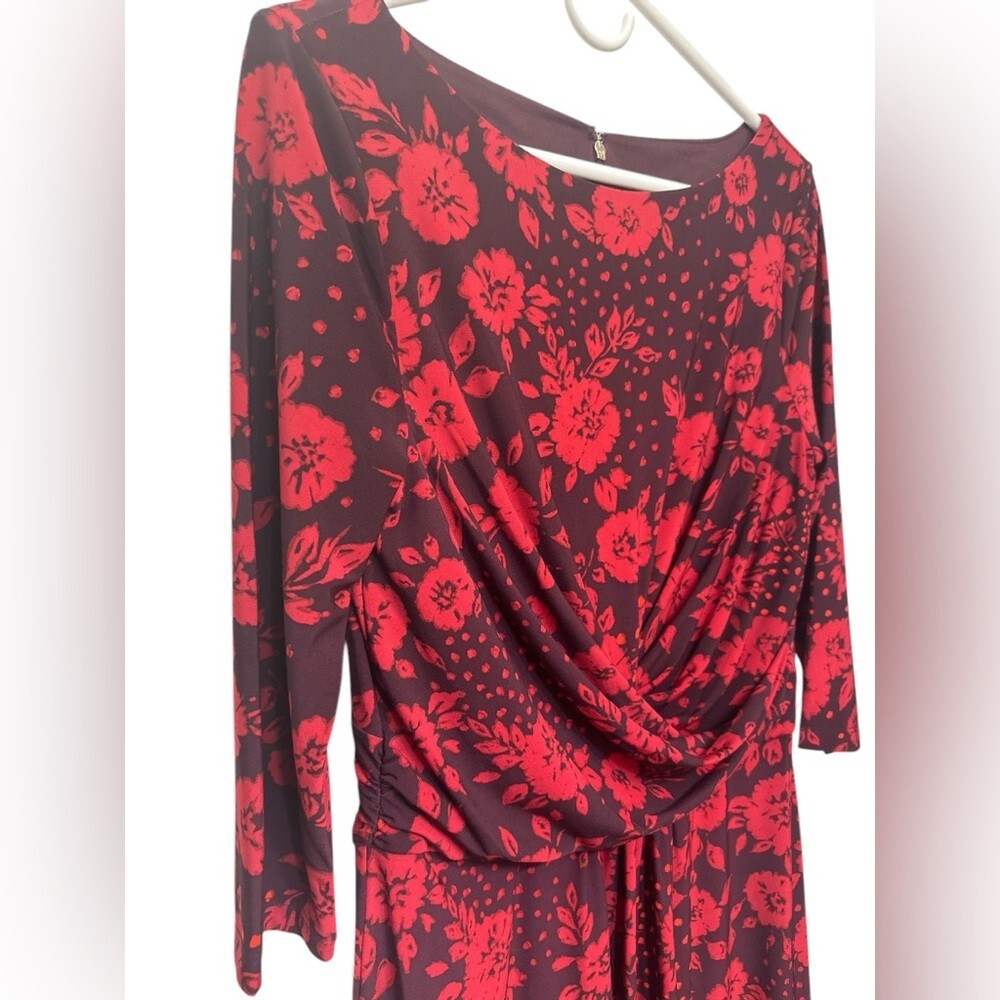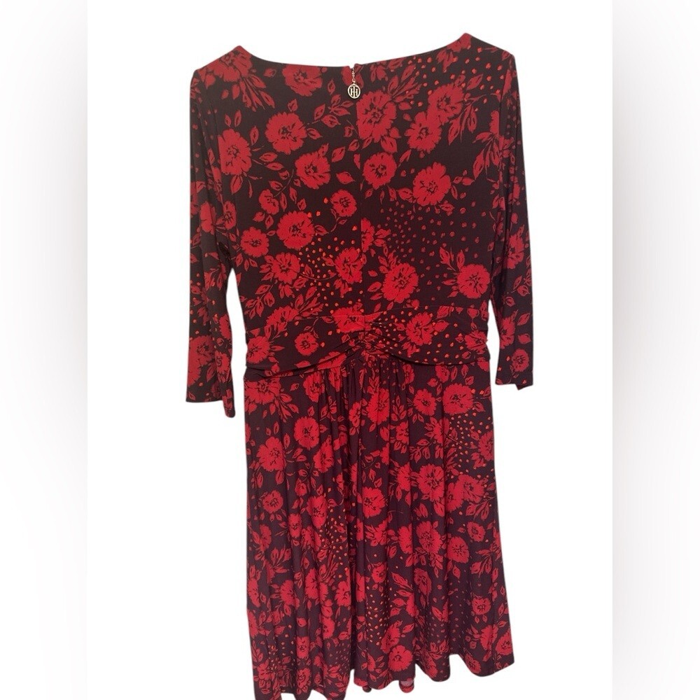 Tommy Hilfiger Black & Red Floral Fit & Flare Dress Round Neck Flowers NWT. Size 10. Jersey knit. 3/4 sleeve. Ruched waist.
