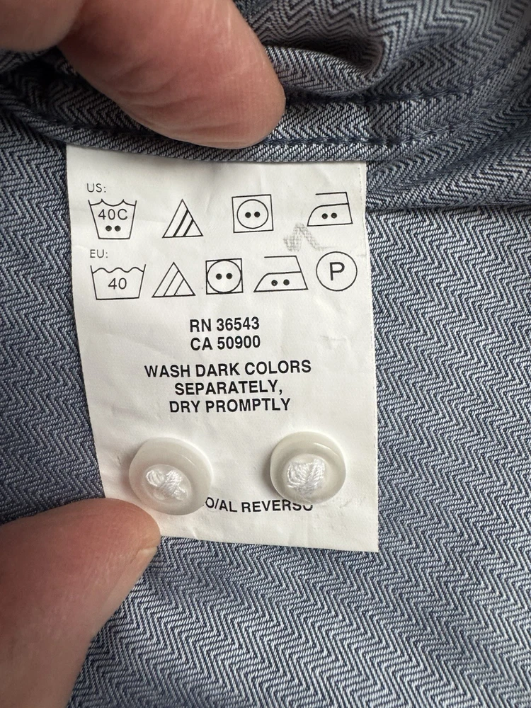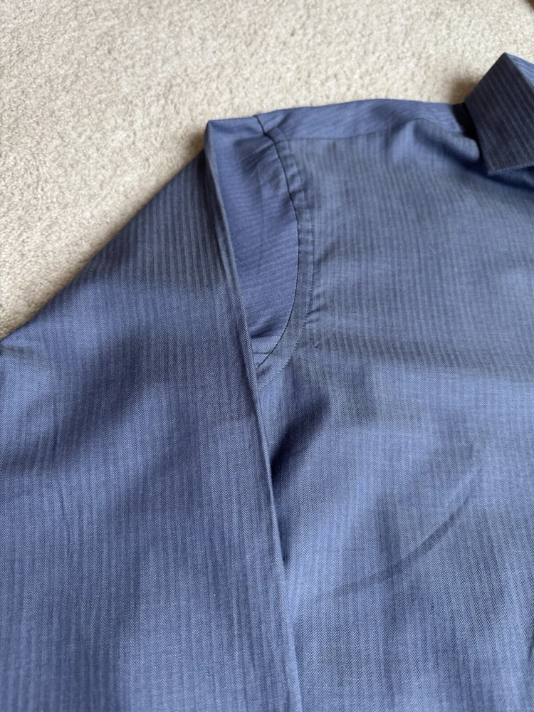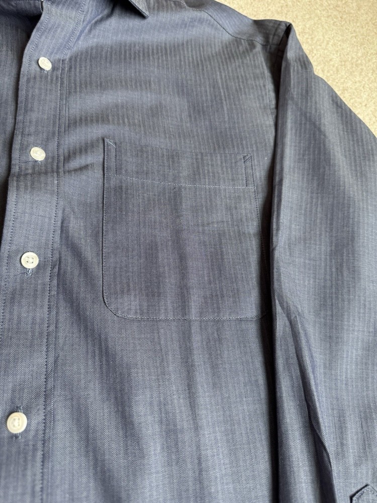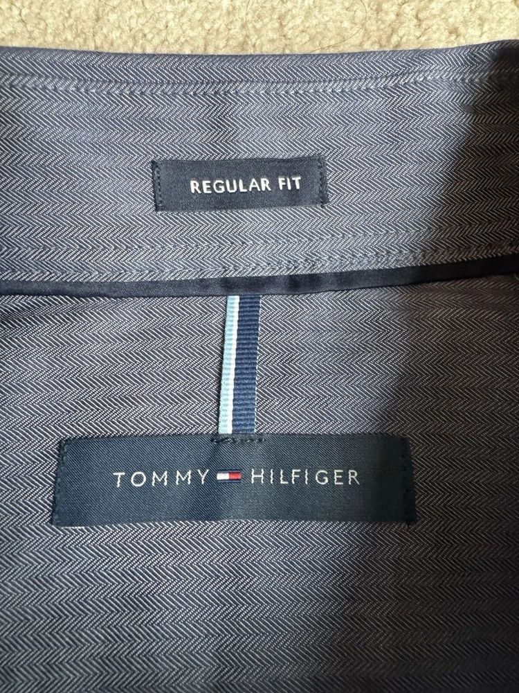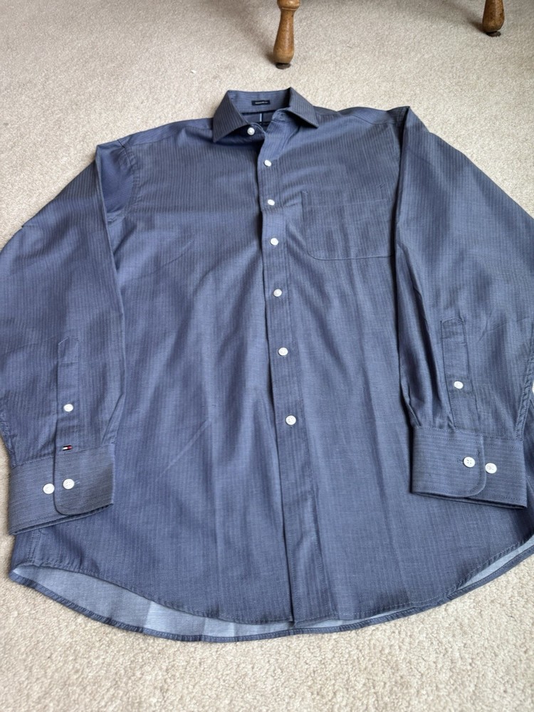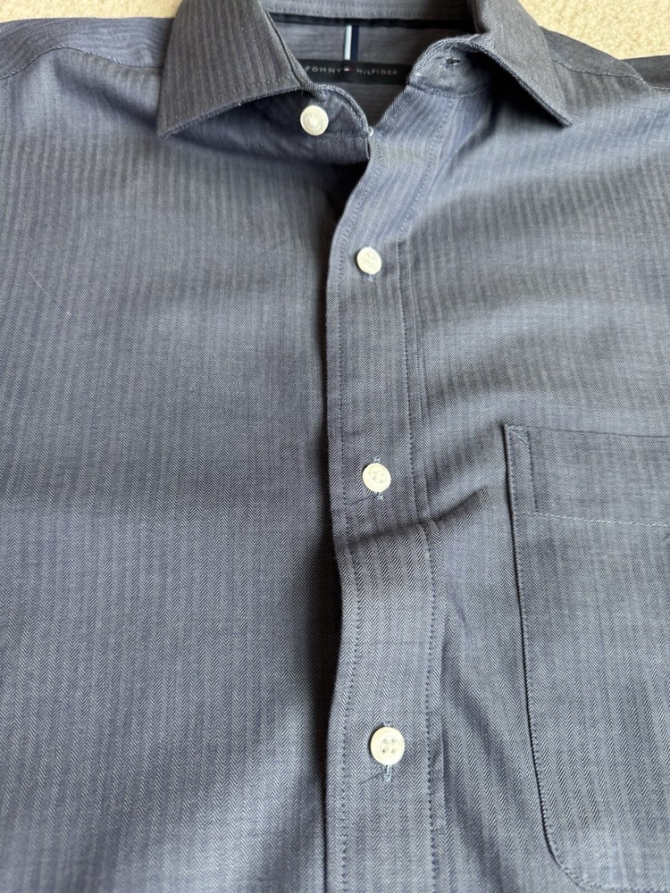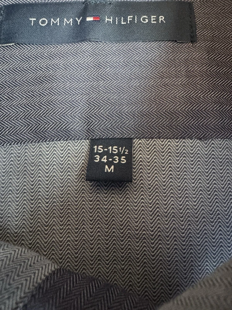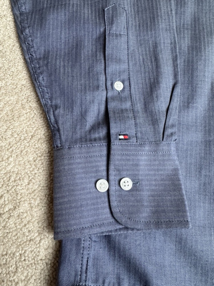 Tommy Hilfiger Blue Long Sleeve Button Down Shirt in size M with a collared neckline measured at 15/15.5 and 34/35. Made of 100% cotton, this shirt features a solid pattern, a front pocket, and is suitable for casual, formal, or business occasions. The shirt is part of the Tommy Hilfiger product line and is designed for a regular fit. There is a Tommy Hilfiger flag insignia detail on one of the cuffs.