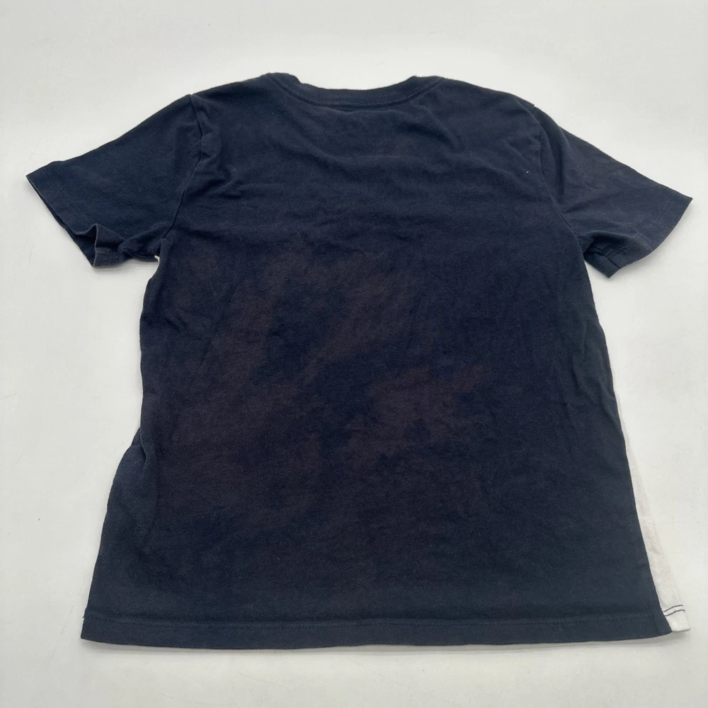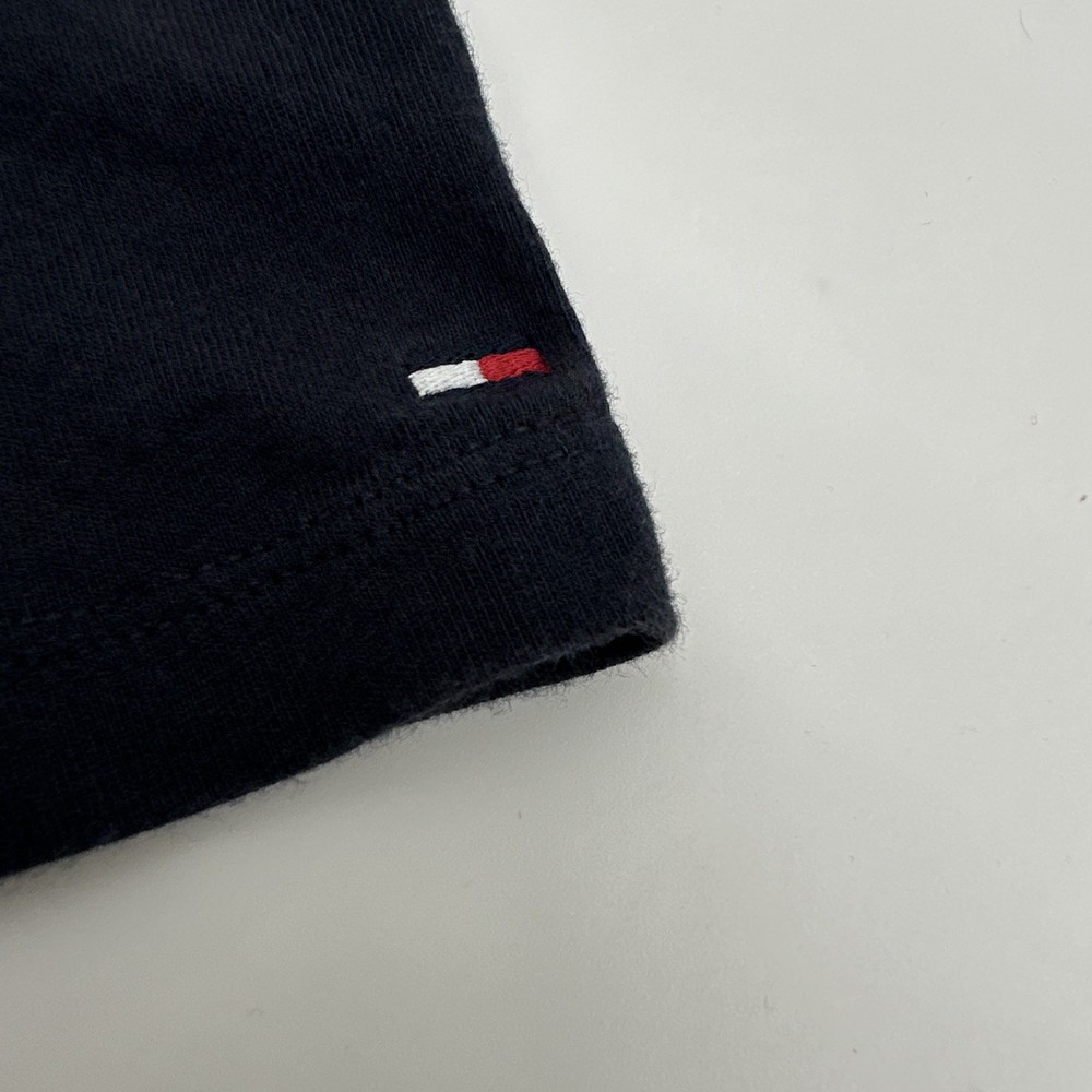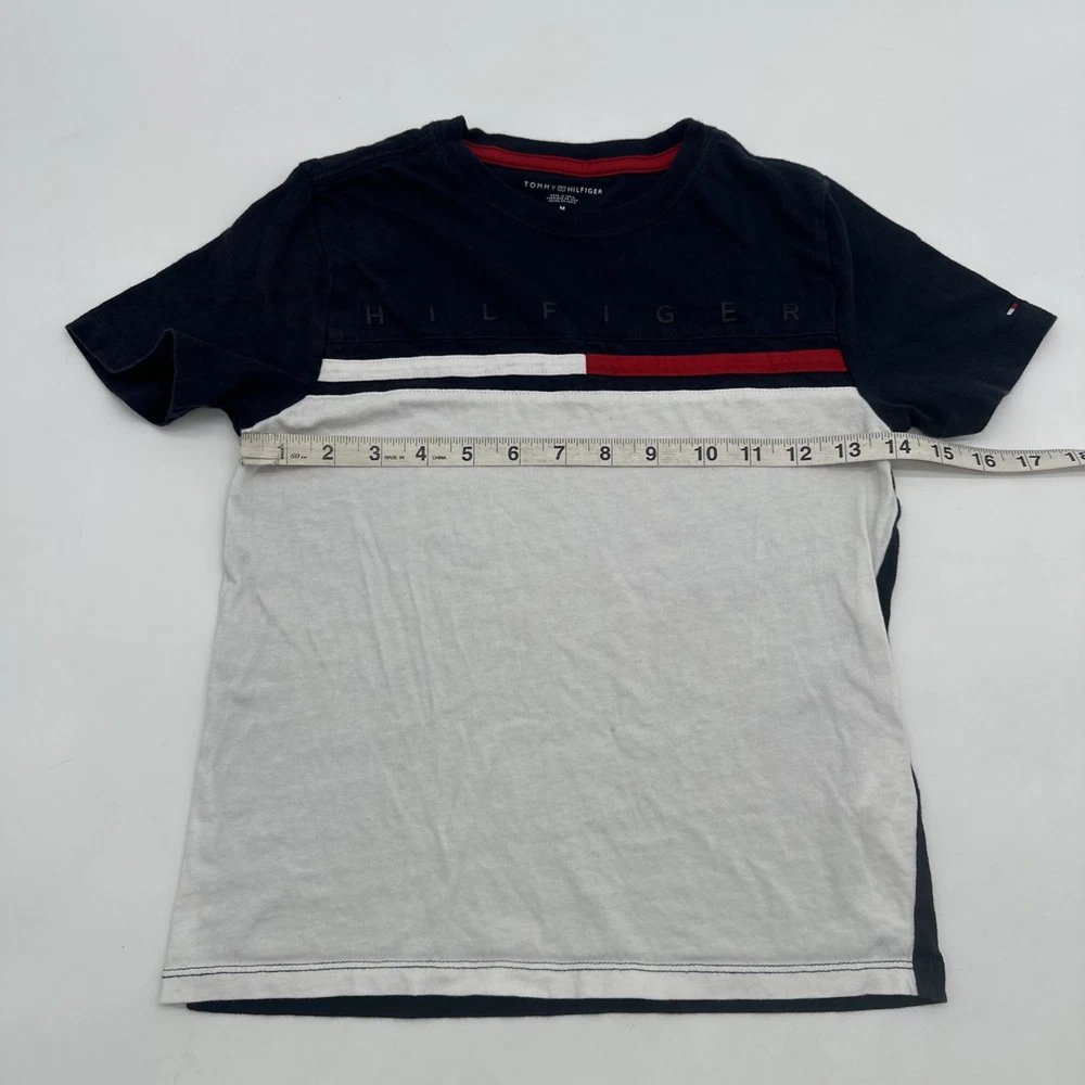The Tommy Hilfiger T-shirt Youth Boy M 8-10 in Blue with Logo is a classic and stylish addition to any young boy's wardrobe. Made from 100% cotton fabric, this short sleeve shirt features a graphic print logo on the front, perfect for casual or formal occasions. With a comfortable crew neck and pullover closure, this regular fit shirt is suitable for all seasons and various activities such as walking, school, or even baseball. Ideal for travel, parties, or everyday wear, this Tommy Hilfiger T-shirt is a versatile and timeless piece for young boys. Check pictures for flaws and measurements