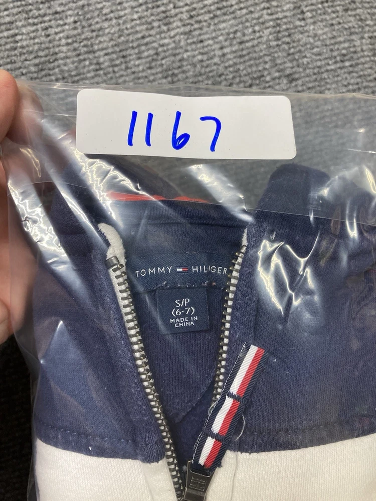 The Tommy Hilfiger Hoodie in Boys Size 6/7 is a stylish and comfortable choice for young boys. The patriotic colorblock pattern in red, white, and blue stands out, while the long sleeve and full zip closure make it practical for colder weather. Made from a soft cotton blend fleece, this hoodie is easy to care for with machine washable fabric. Ideal for travel, activewear, or casual occasions, this hoodie also features a hooded design and pockets for added convenience. Perfect for the winter, fall, or spring seasons, this hoodie is a versatile addition to any boy's wardrobe.