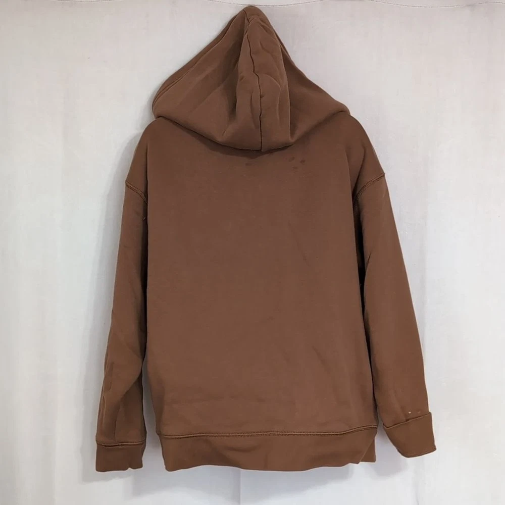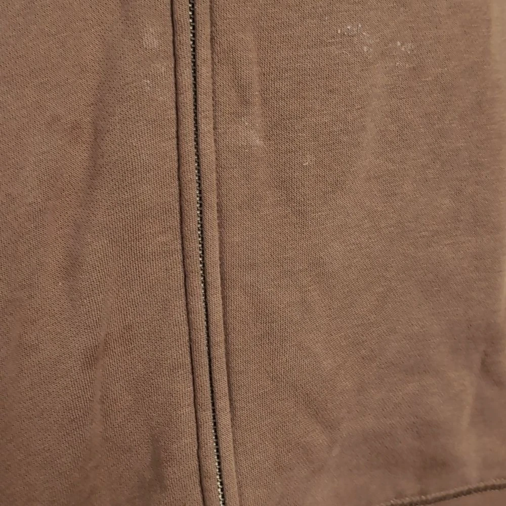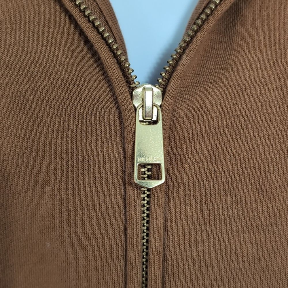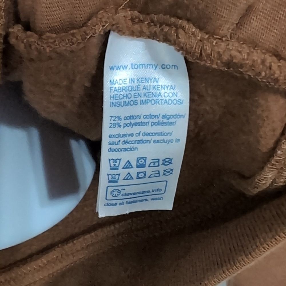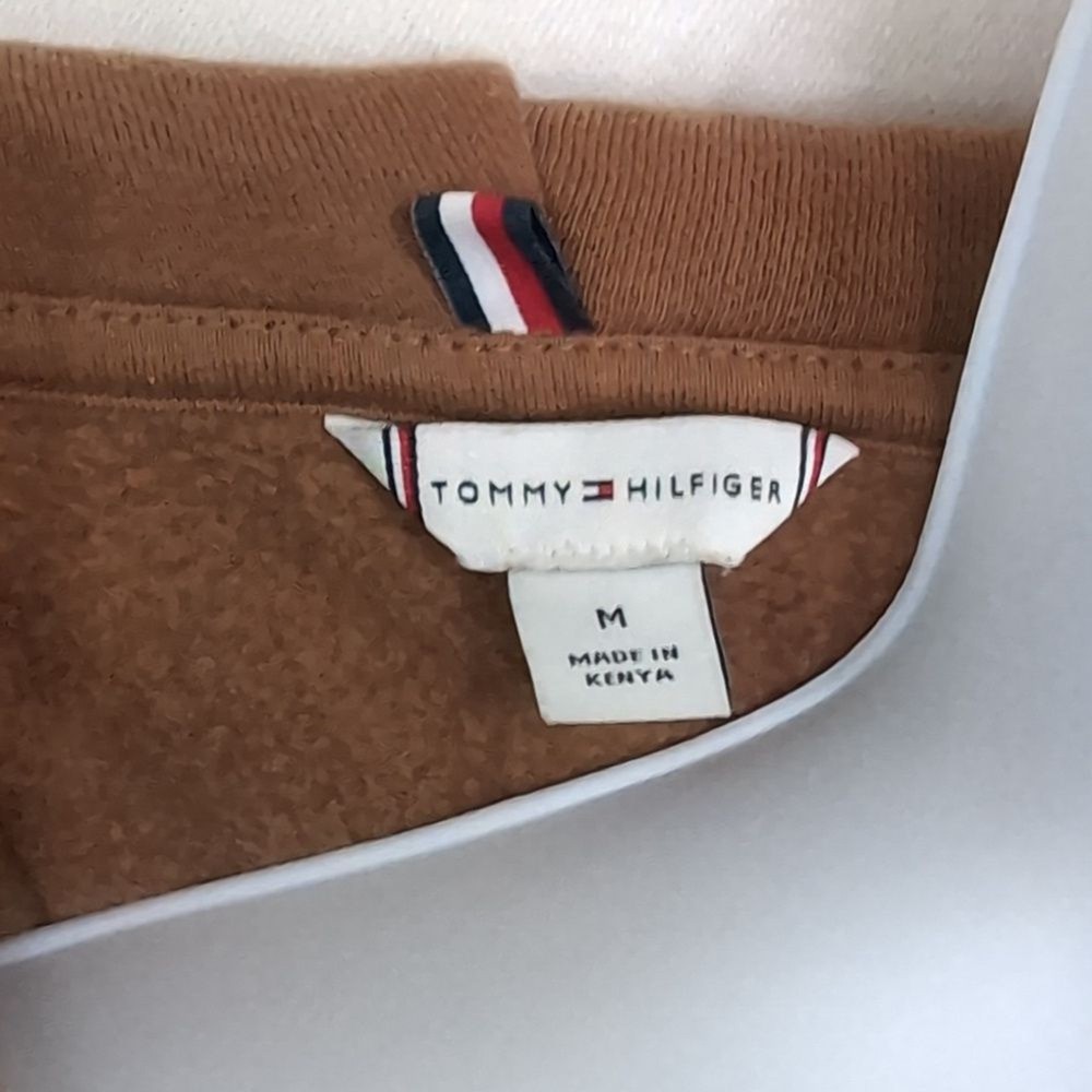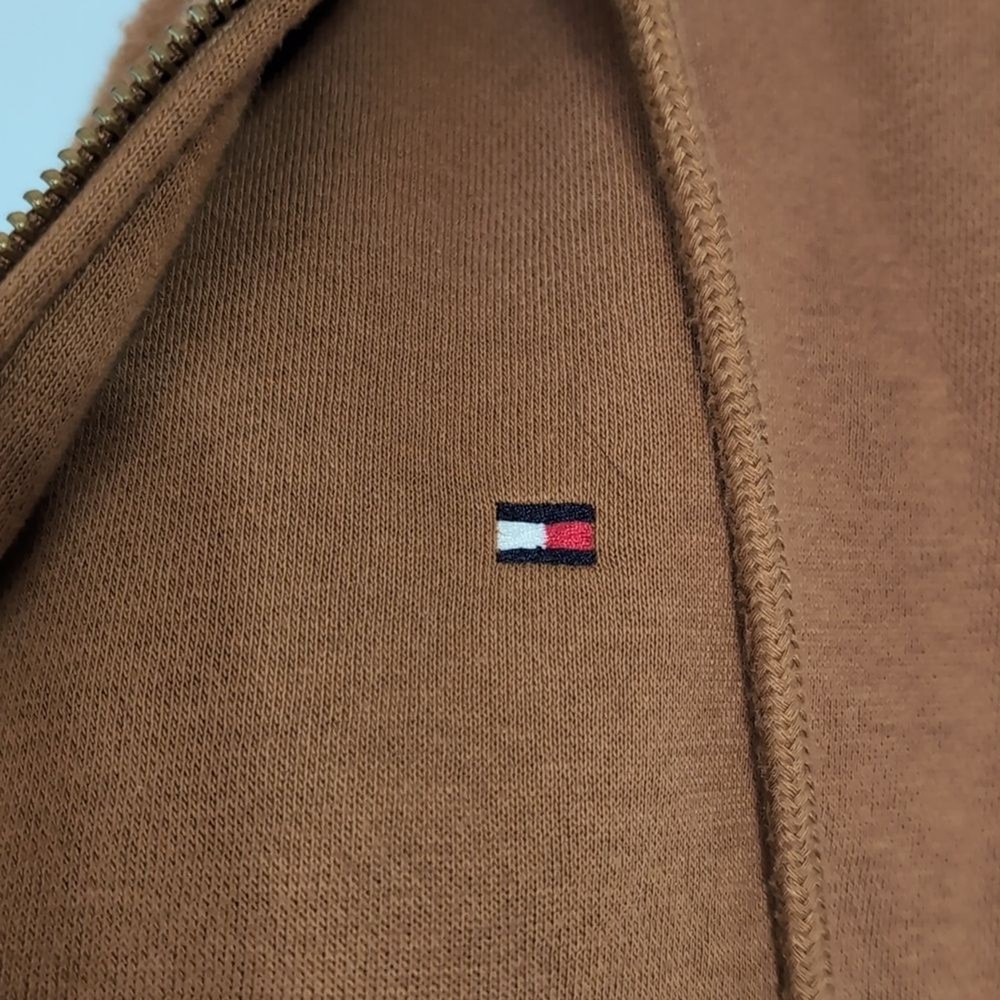 Tommy Hilfiger size medium camel brown color thick stretch material Full zip front closure hooded sweatshirt discoloration on front otherwise great condition measurements pit to pit 22 length 24