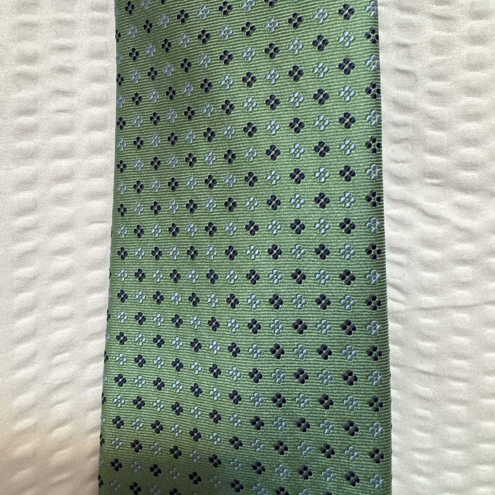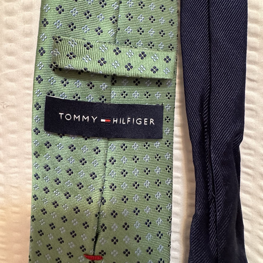 This is a Tommy Hilfiger designer tie made of 100% silk, measuring 60 inches long. It features a geometric pattern in green and navy colors, with a logo accent. This tie is a classic length and is not vintage. It is a men's accessory that was manufactured in China. T13