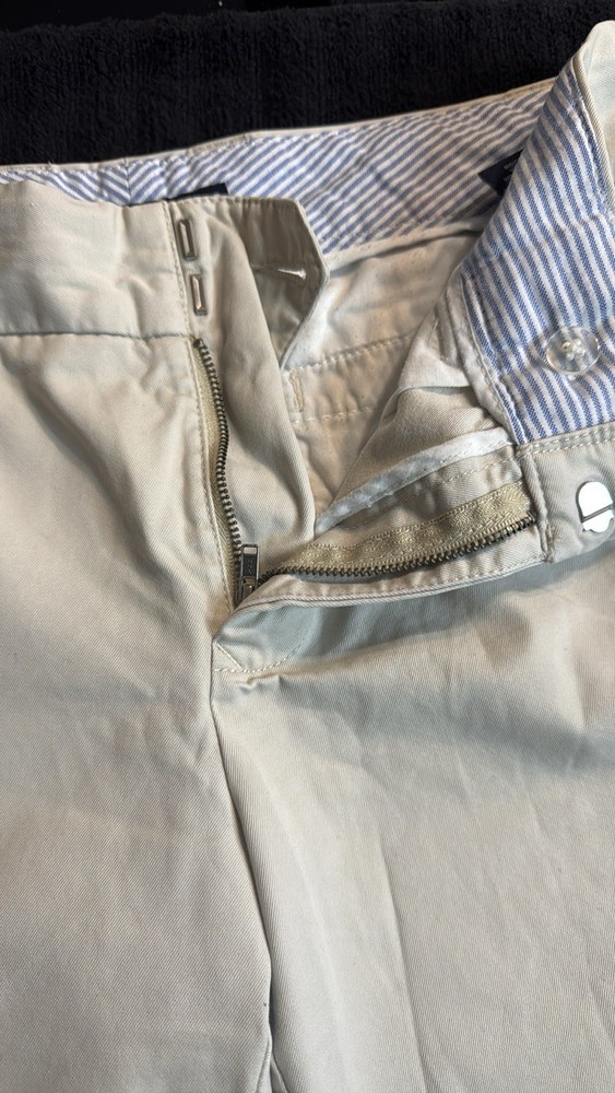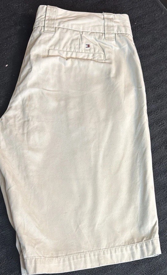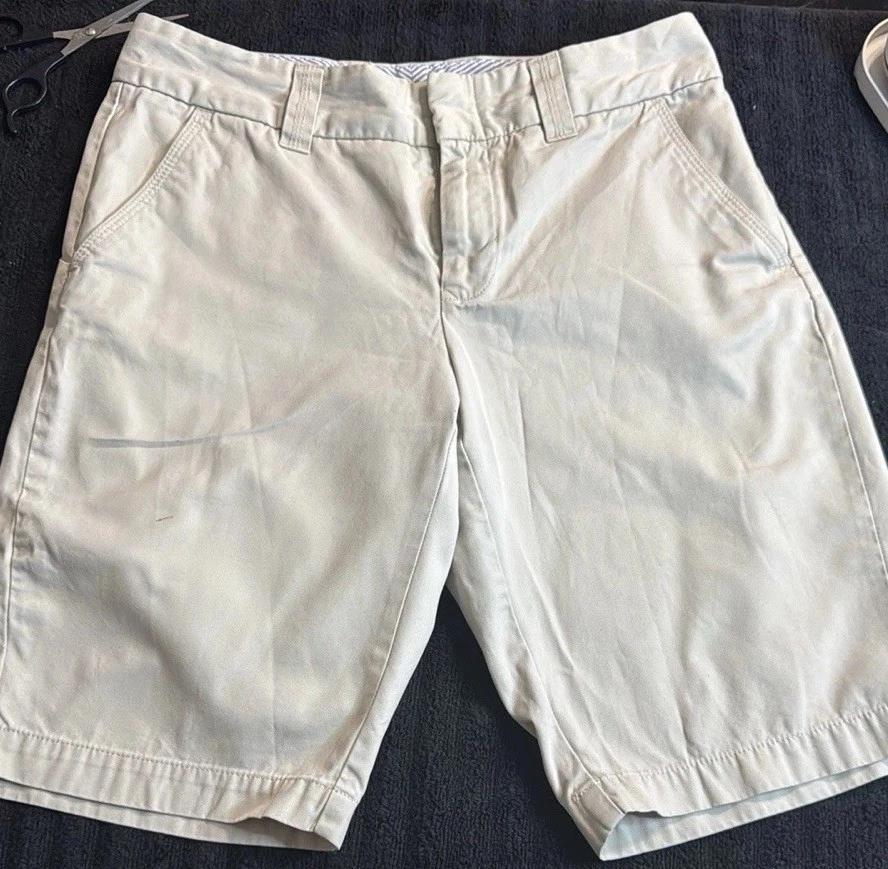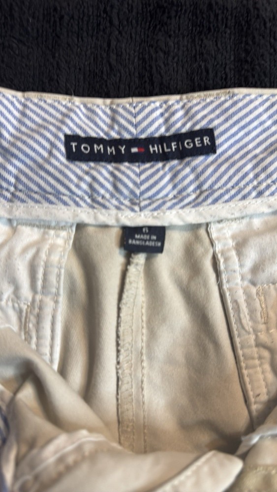 These cream-colored cargo shorts by Tommy Hilfiger feature a relaxed fit and a subtle texture, making them ideal for casual summer outings. The knee-length design offers a classic look that complements a variety of styles.good condition size 6 #41