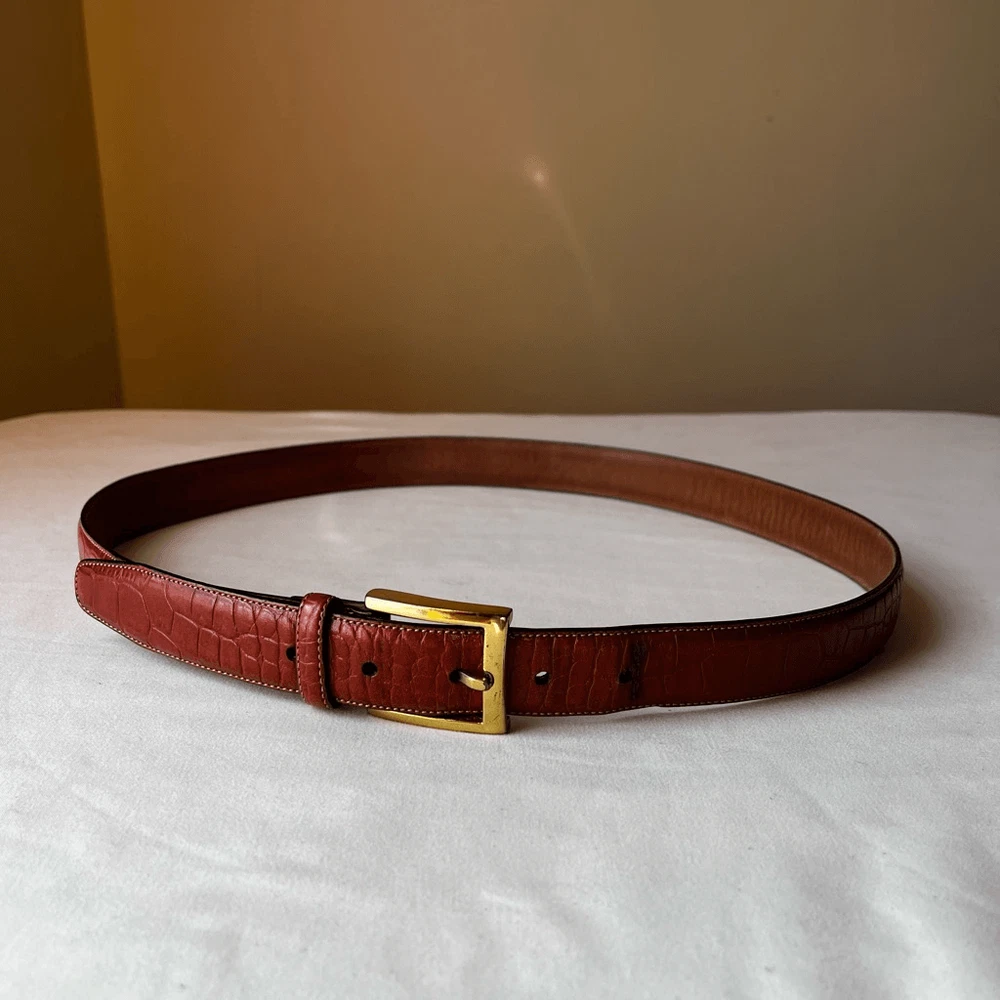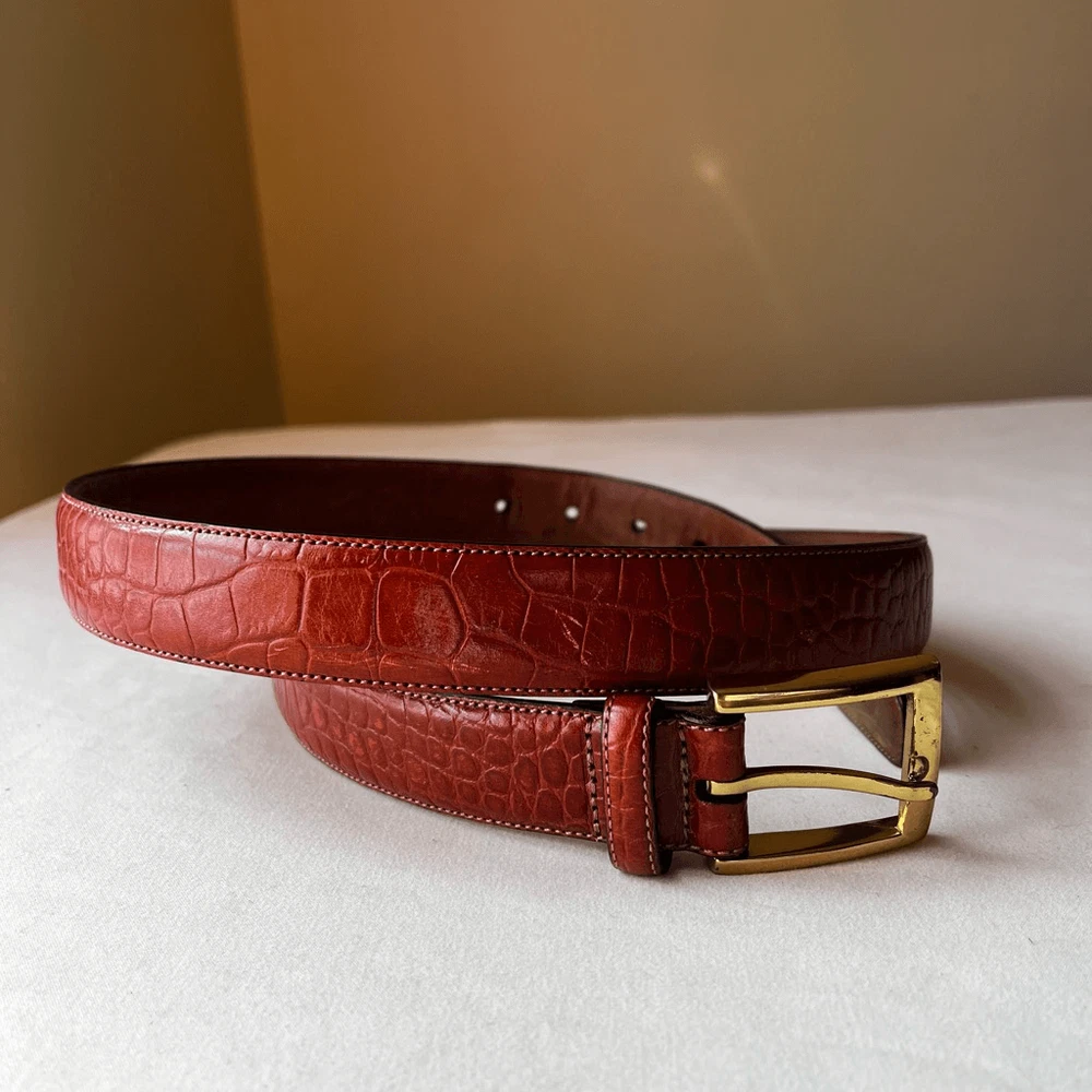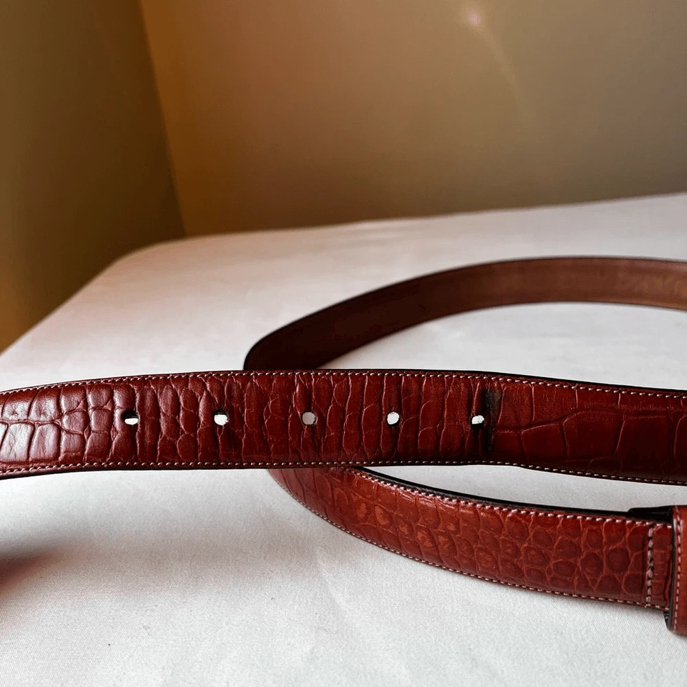 This belt is a fantastic find! The croc-embossed leather looks luxurious and feels durable, while the gold buckle adds a stylish touch. The cognac brown shade is versatile and pairs well with so many outfits. Love that it’s gently used but still in great condition—such a steal for a designer piece. The sizing is accurate, and the shipping was super fast. Highly recommend!