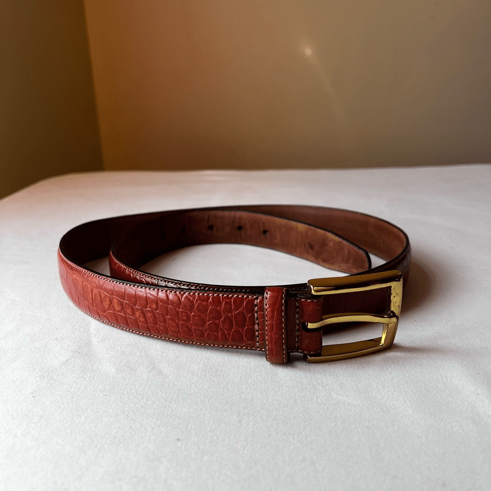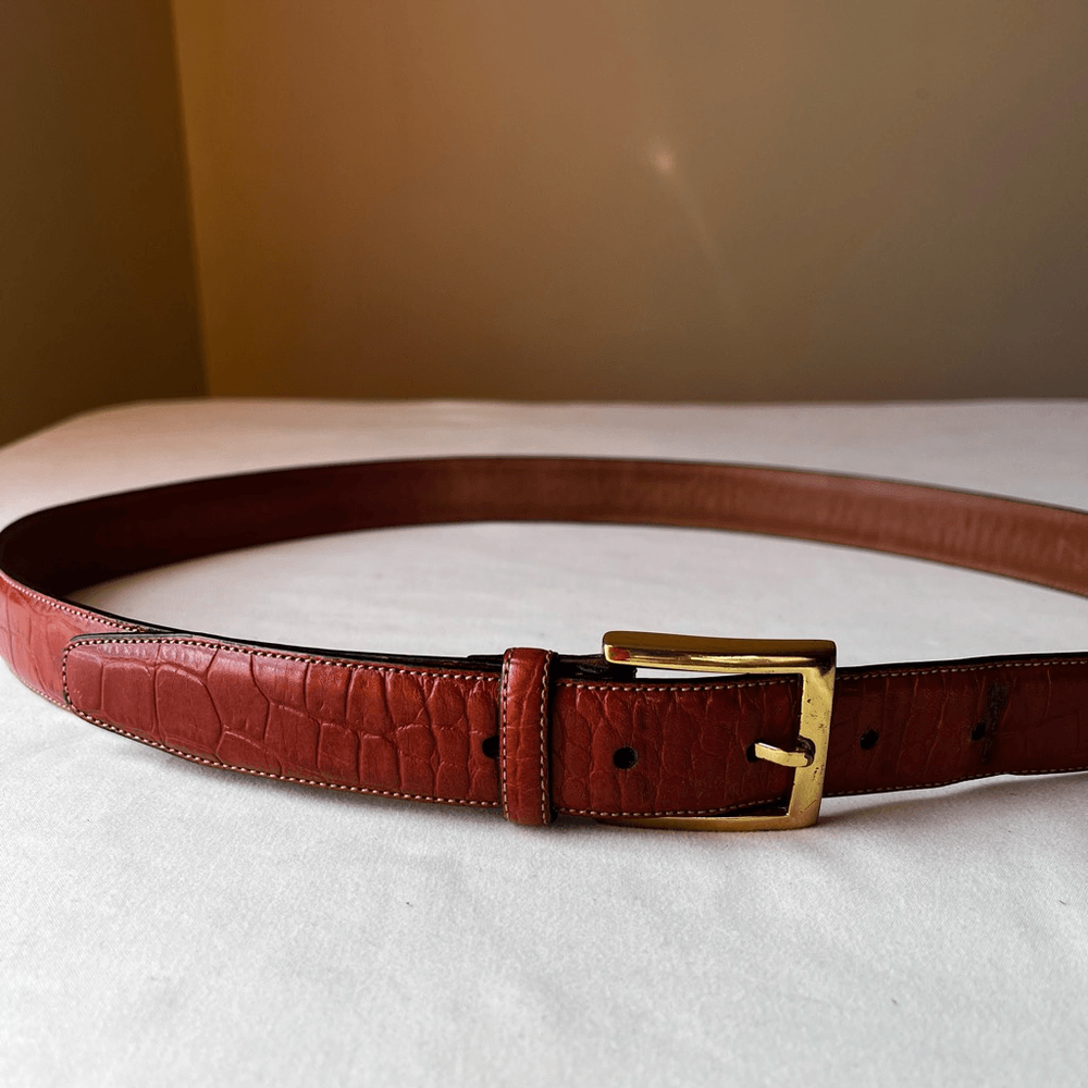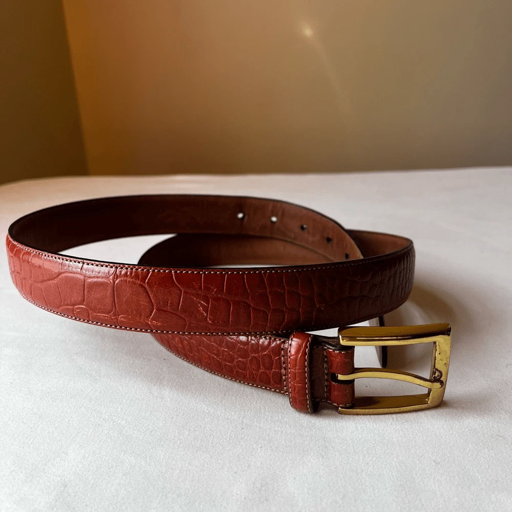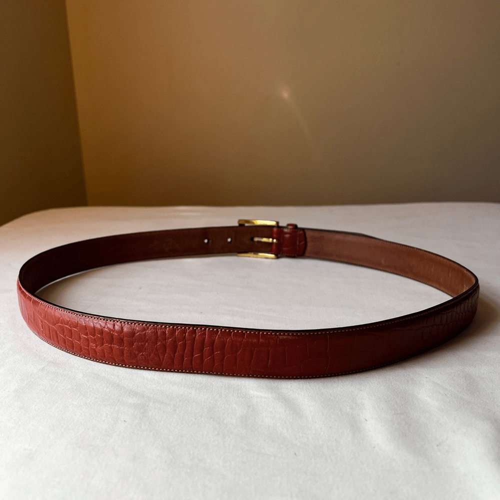 This belt is a fantastic find! The croc-embossed leather looks luxurious and feels durable, while the gold buckle adds a stylish touch. The cognac brown shade is versatile and pairs well with so many outfits. Love that it’s gently used but still in great condition—such a steal for a designer piece. The sizing is accurate, and the shipping was super fast. Highly recommend!
