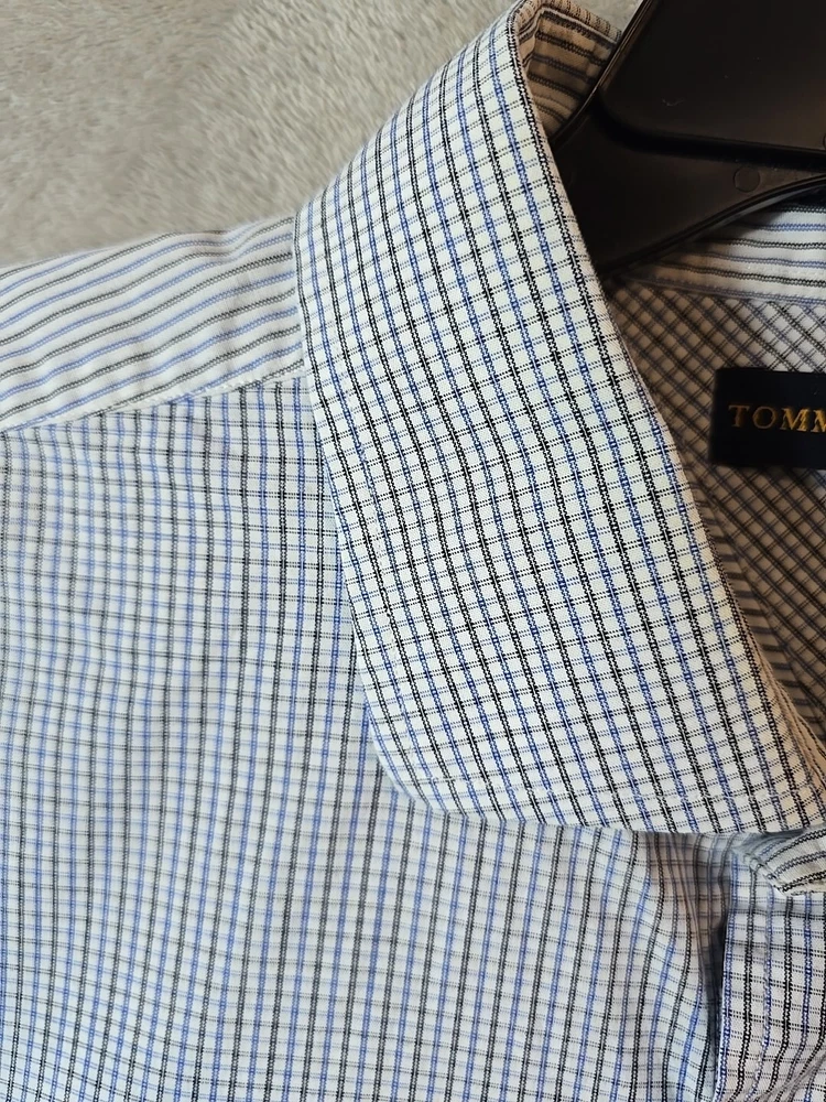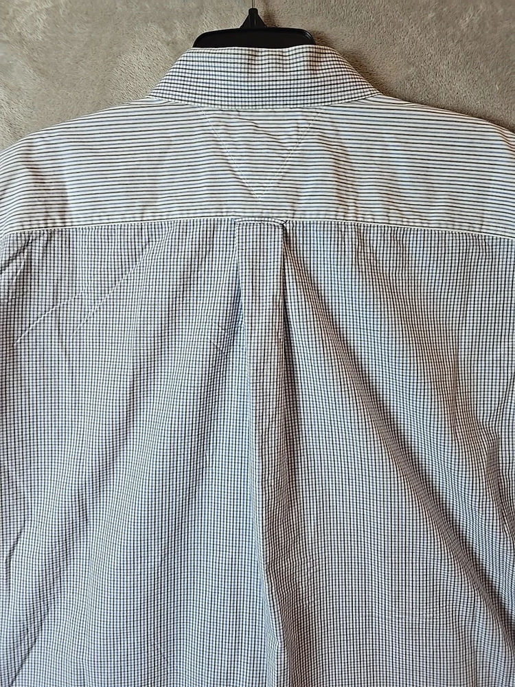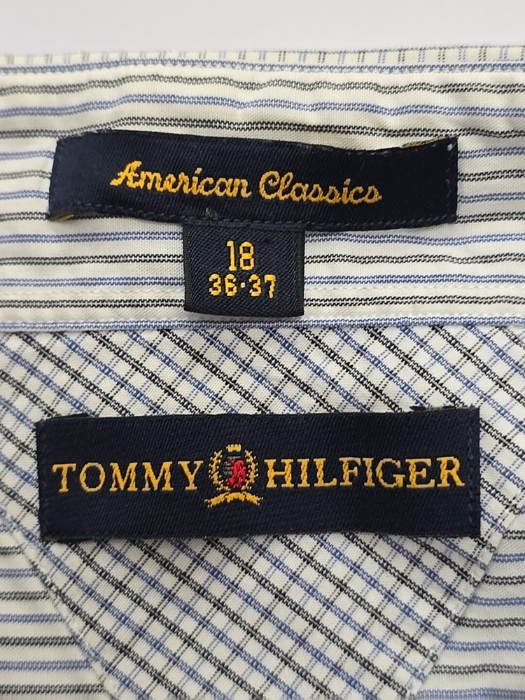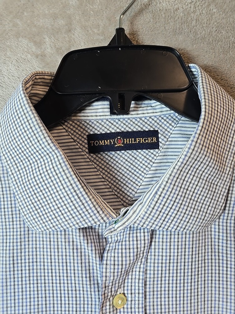 This Tommy Hilfiger dress shirt is designed for men in size 18 with a regular fit. The shirt features a classic American 90s style with a checkered multicolor pattern, long sleeves, and button-down closure. Made from a comfortable cotton blend material with added stretch, it is suitable for casual occasions and can be machine washed for easy care. The collared neckline and button accents add to its classic look, making it a versatile wardrobe staple for various seasons.