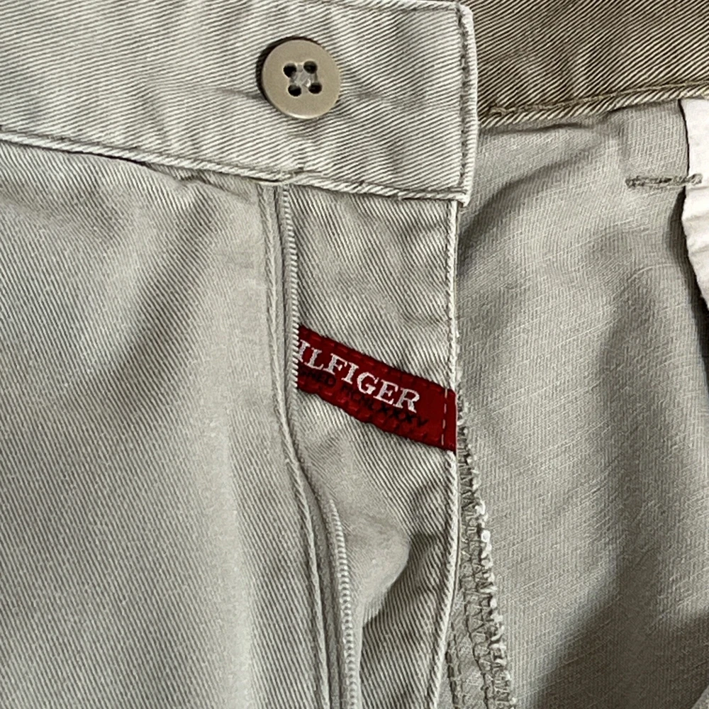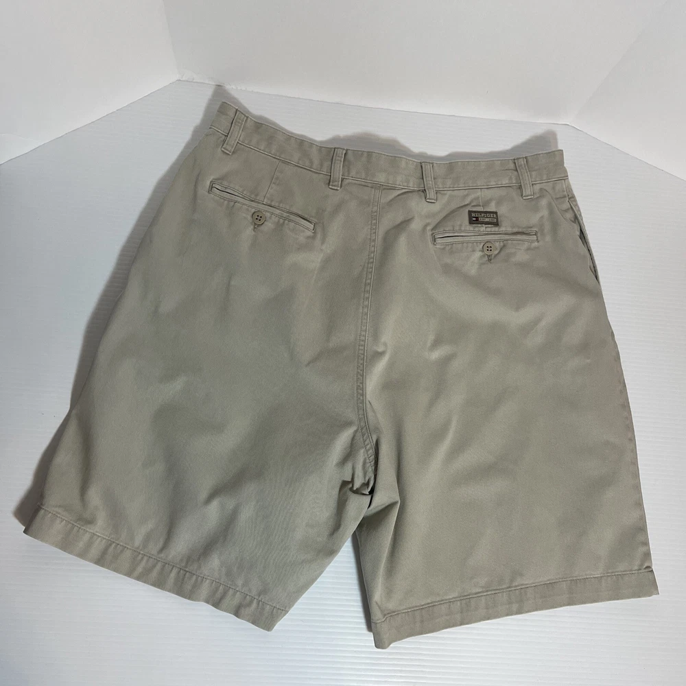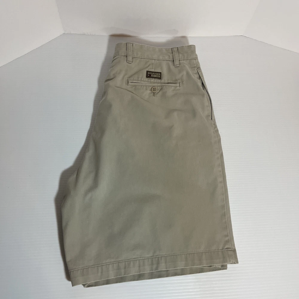 The Tommy Hilfiger Flat Front 100% Cotton Chino Shorts in Sand Khaki are a men's size 36. The shorts feature a zip closure, slash pockets, and a flat front. The fabric is canvas and the accents include a button and logo. The shorts are machine washable and can be worn in the summer, fall, and spring. The style is chino and the fit is regular. The shorts are perfect for travel and casual occasions, and the theme includes beach vibes, traditional, preppy, and classic. Very good condition - no stains or holes All clothing/fabric items have been cleaned per eBay policy standards/manufacturer's standards.