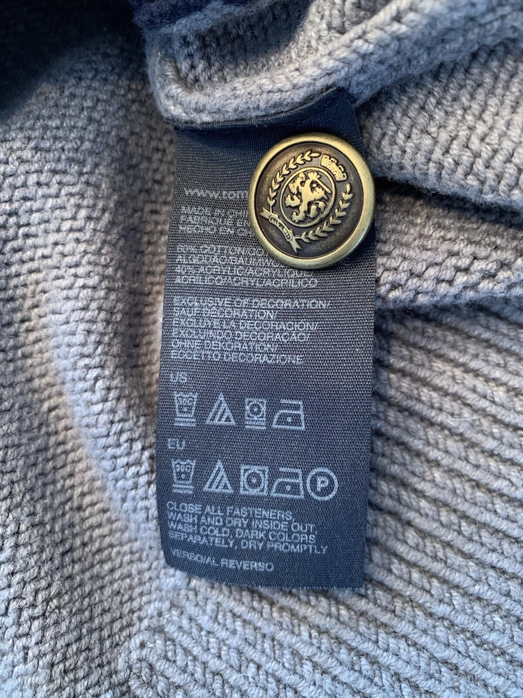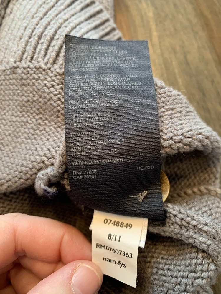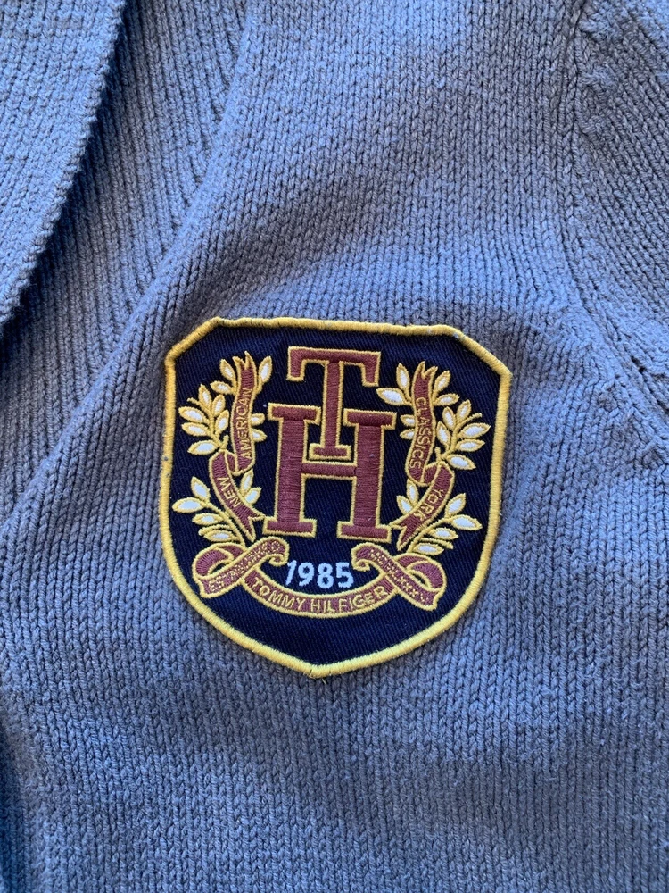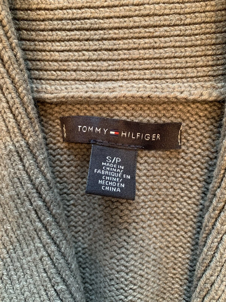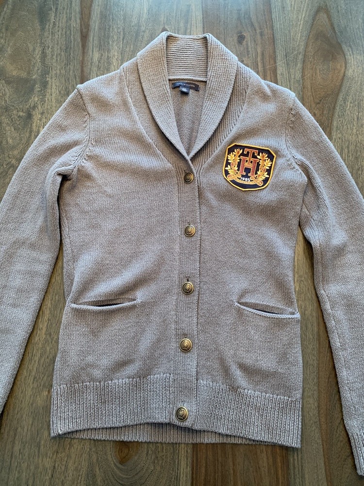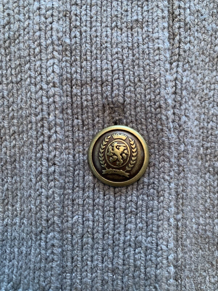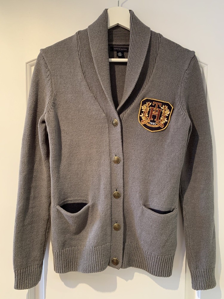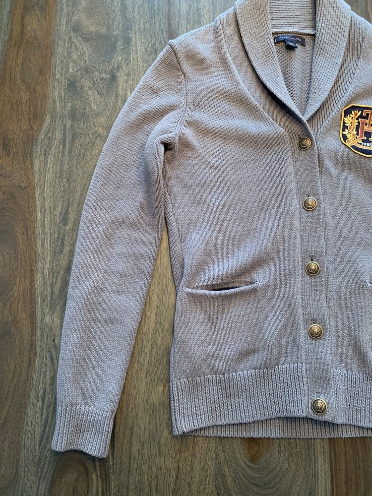 Tommy Hilfiger Cardigan Sweater Crest Grey Size Small Detailed Buttons Pockets. Measurements on pictures. Condition consistent with light use. Please look at the pictures carefully, they’re part of the description.