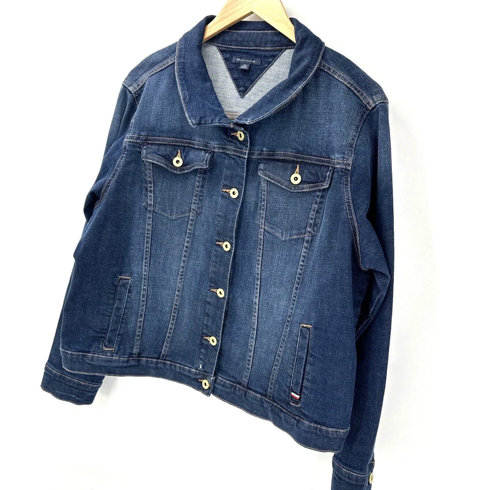 Tommy Hilfiger Women's Jean Jacket Size XL Blue Stretch Denim Button Up Classic + Pockets Very good condition, see all pictures for views. * Pit to pit: 23" * Shoulder to hem: 24" Ships out same day or next open postal day. Thank you for your purchase, we appreciate you!