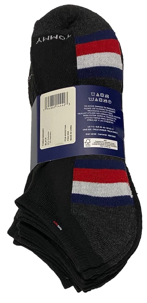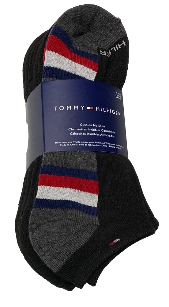 Tommy Hilfiger Men's 6-Pair Cushioned No Show Socks Arch Support Flag Logo 97 % Polyester 3% Spandex Assorted Black/Gray Sock Size: 10-13 Fits Shoe Size: 7-12