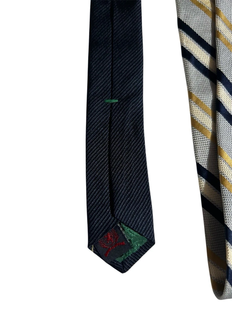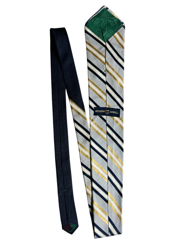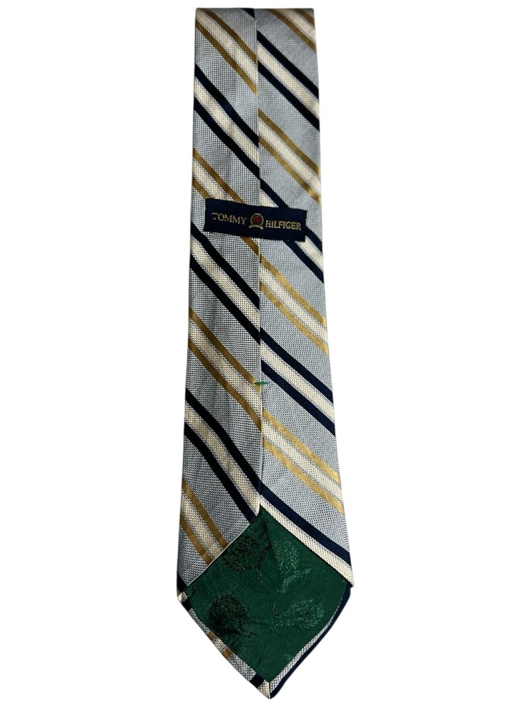 The Tommy Hilfiger Necktie is a luxurious men's accessory designed for business, in the office weddings, or formal events. Made of high-quality silk with a classic striped pattern in blue and gold, this designer tie features the iconic Tommy Hilfiger logo accent. The tie is adjustable in length, perfect for a preppy and stylish look. Made in the United States, this classic one-size tie exudes sophistication and confidence, making it a versatile and fashionable addition to any man's wardrobe.
